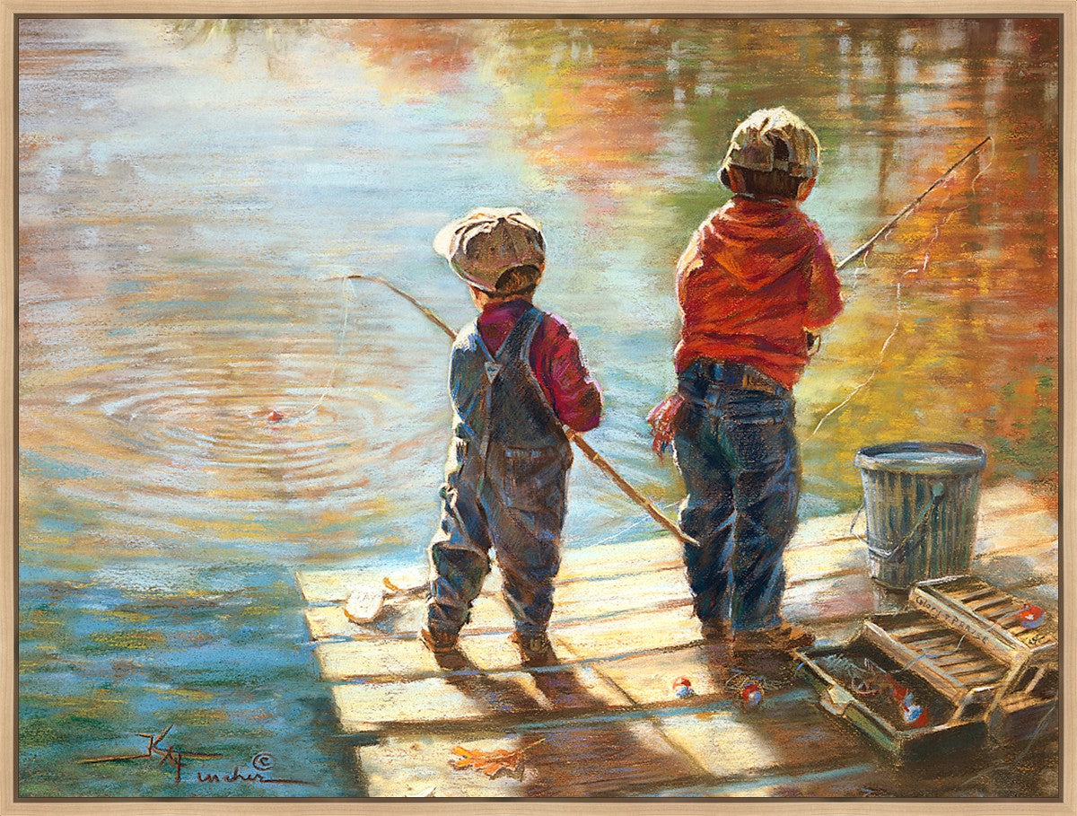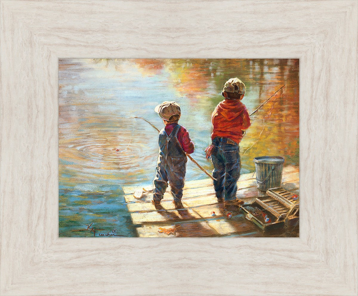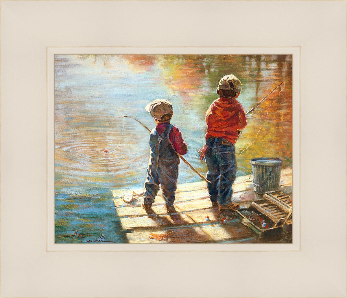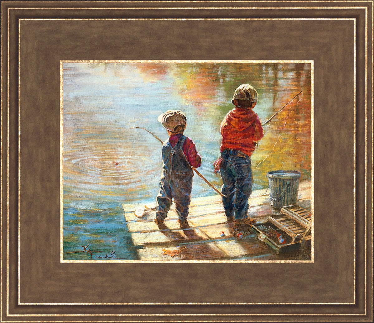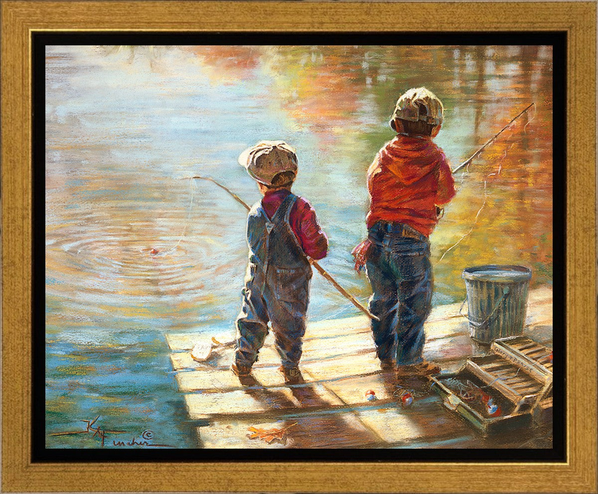 You’re a Keeper shares the story of two brothers learning to fish. The older brother proudly holds a new rod and reel with a fully stocked tacklebox at his feet. It is doubtful he will catch anything, for his line is slack and knotted. His younger brother is fishing with the basics—a cane pole and bread ball. He is awarded a bouncing bobber with a bite and quickly learns that it’s no longer fishing when you have a bite!
