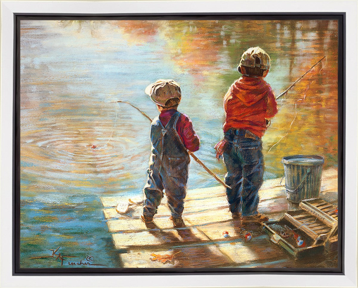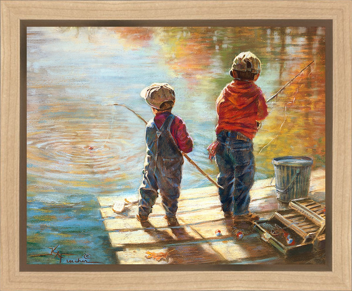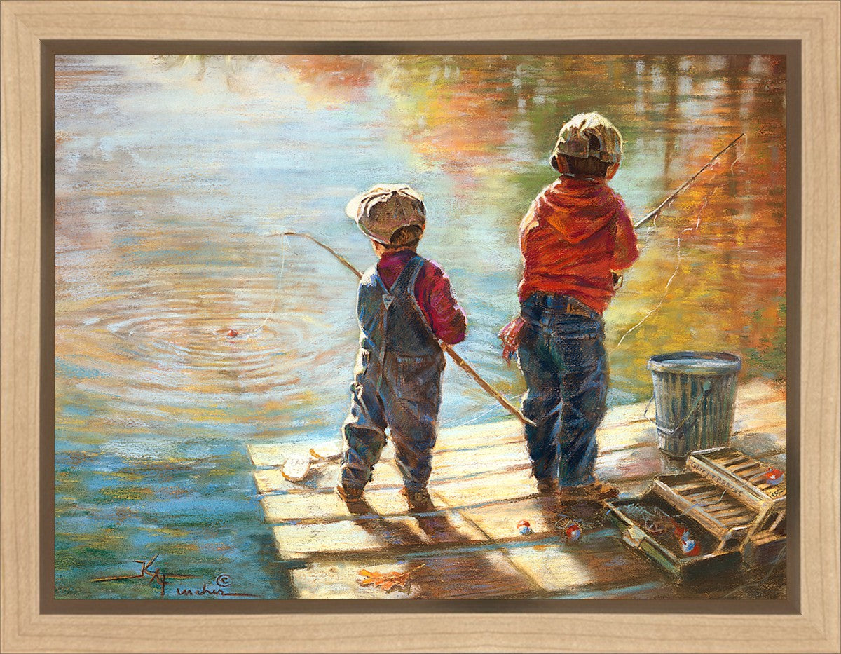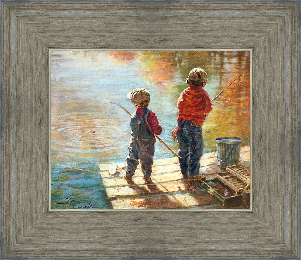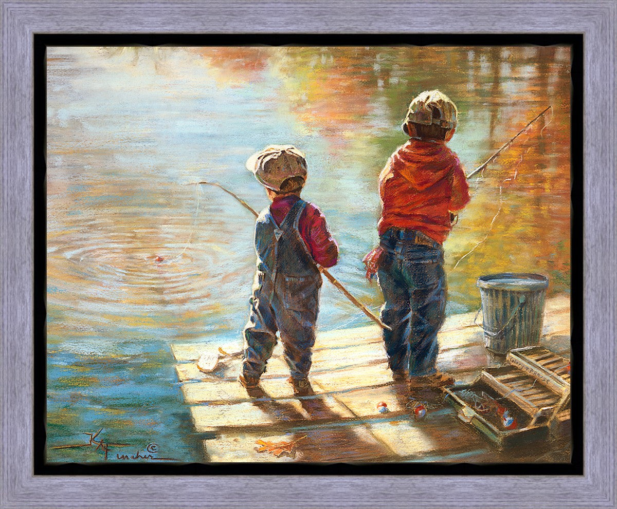 You’re a Keeper shares the story of two brothers learning to fish. The older brother proudly holds a new rod and reel with a fully stocked tacklebox at his feet. It is doubtful he will catch anything, for his line is slack and knotted. His younger brother is fishing with the basics—a cane pole and bread ball. He is awarded a bouncing bobber with a bite and quickly learns that it’s no longer fishing when you have a bite!