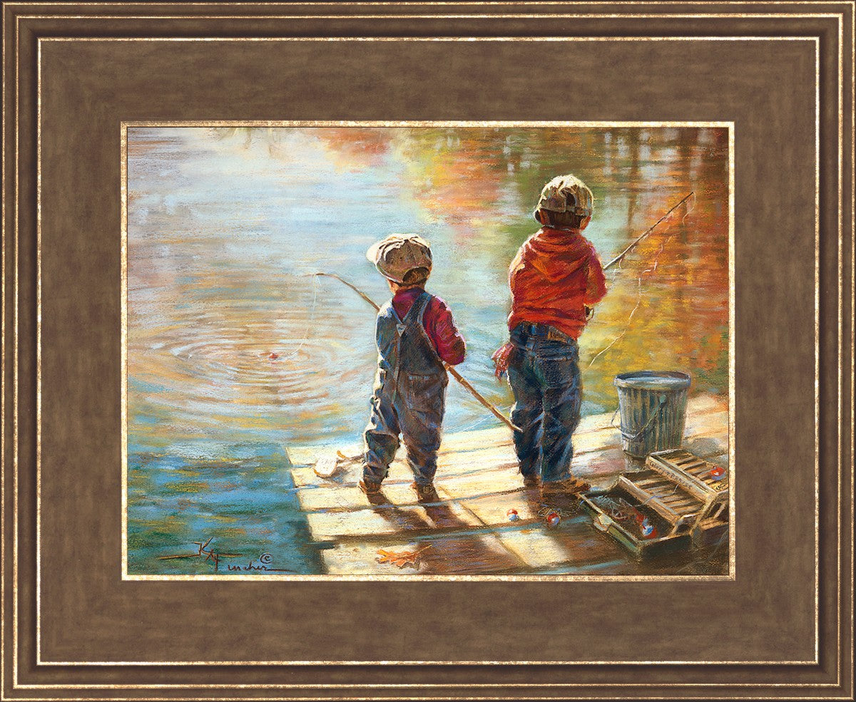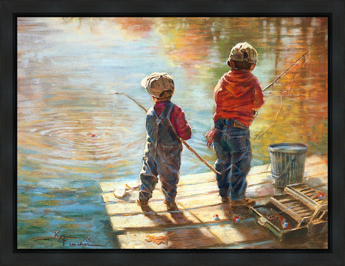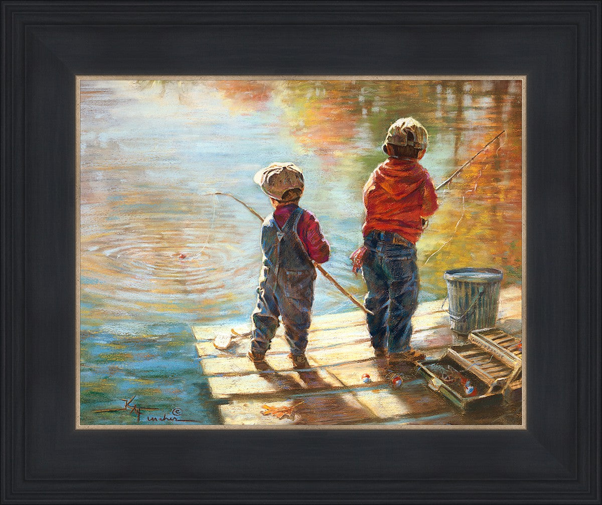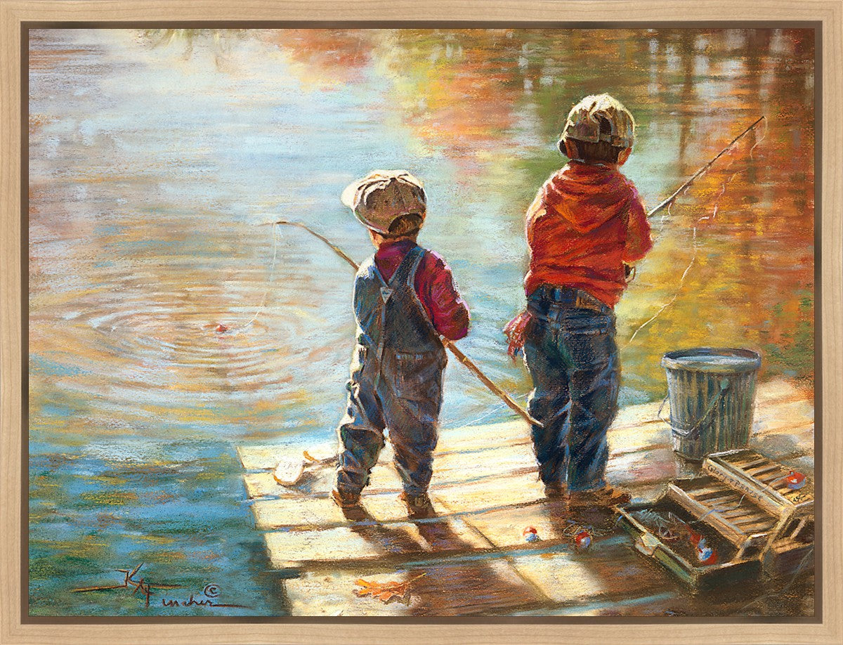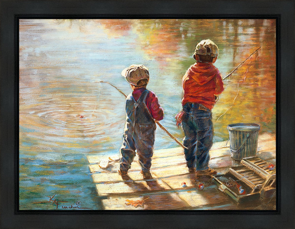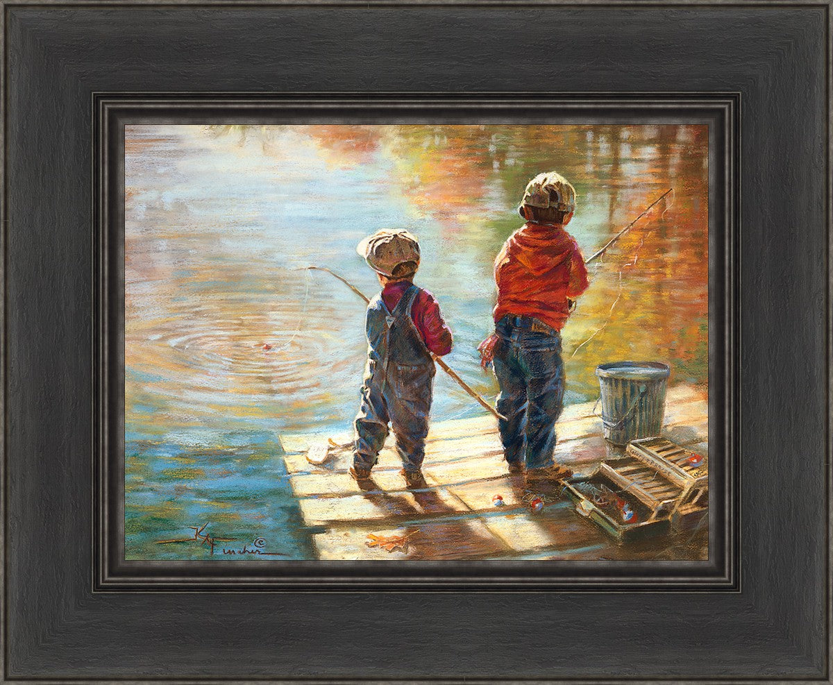 You’re a Keeper shares the story of two brothers learning to fish. The older brother proudly holds a new rod and reel with a fully stocked tacklebox at his feet. It is doubtful he will catch anything, for his line is slack and knotted. His younger brother is fishing with the basics—a cane pole and bread ball. He is awarded a bouncing bobber with a bite and quickly learns that it’s no longer fishing when you have a bite!