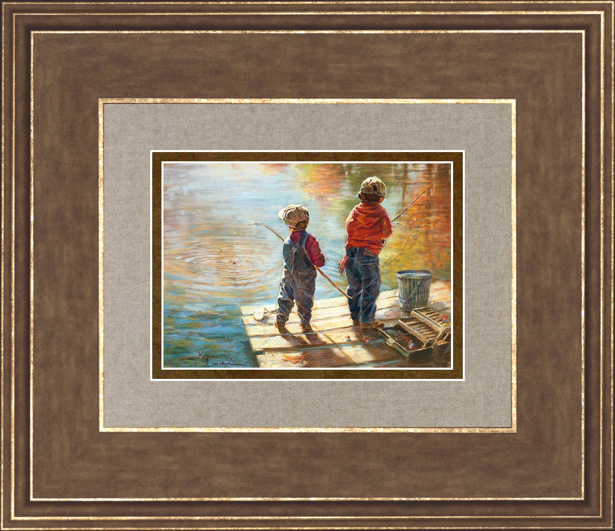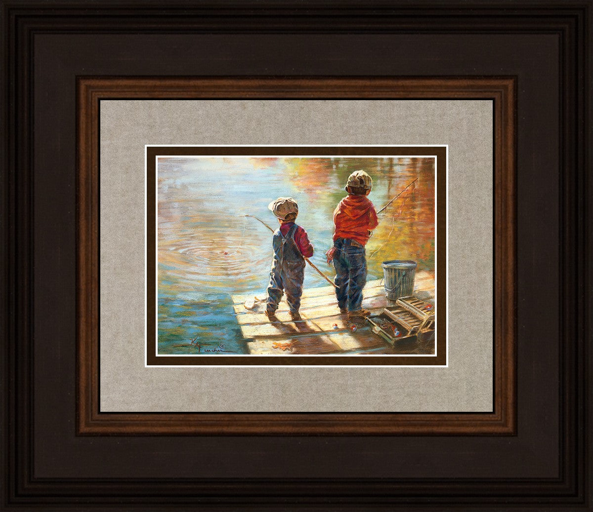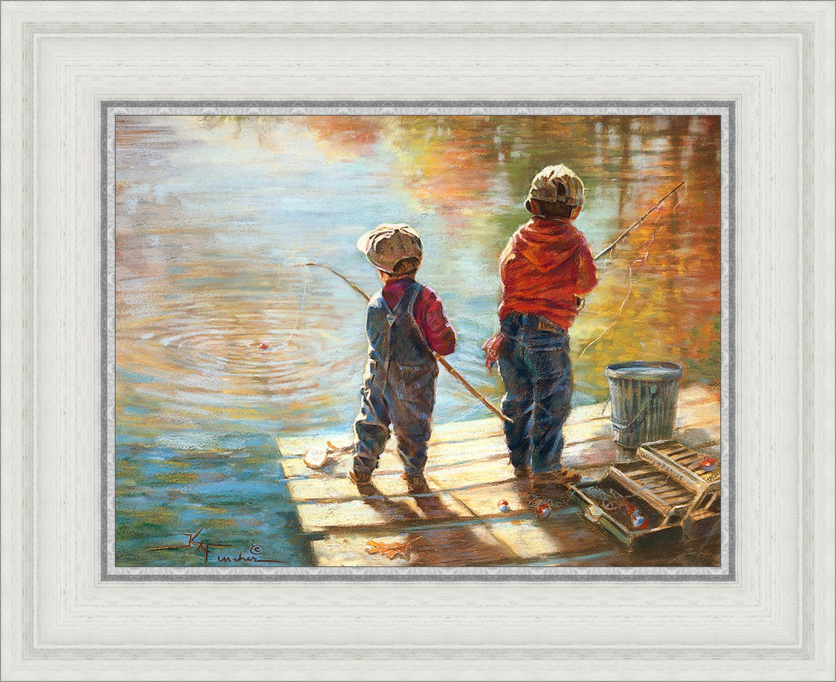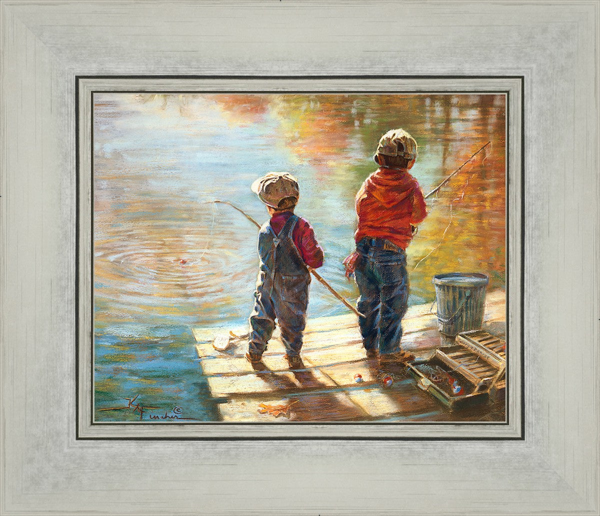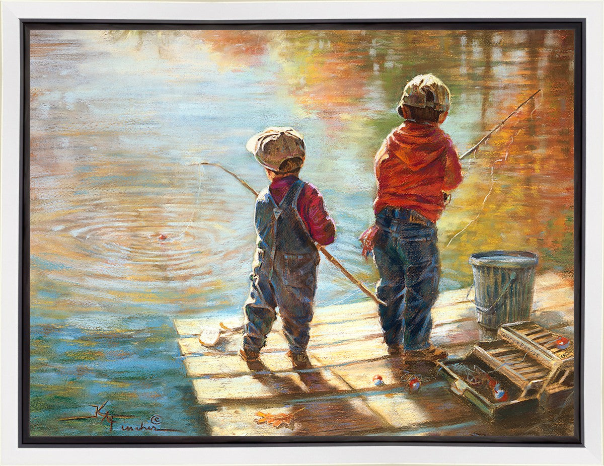 You’re a Keeper shares the story of two brothers learning to fish. The older brother proudly holds a new rod and reel with a fully stocked tacklebox at his feet. It is doubtful he will catch anything, for his line is slack and knotted. His younger brother is fishing with the basics—a cane pole and bread ball. He is awarded a bouncing bobber with a bite and quickly learns that it’s no longer fishing when you have a bite!