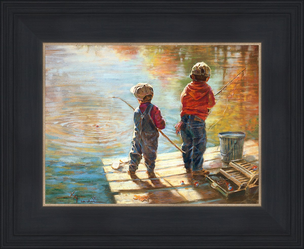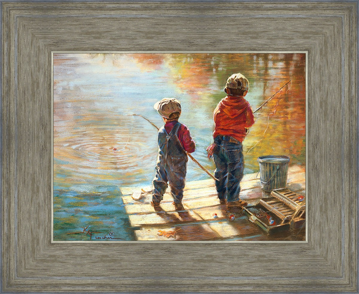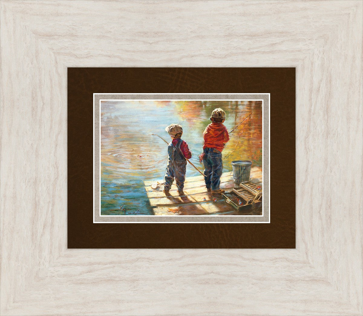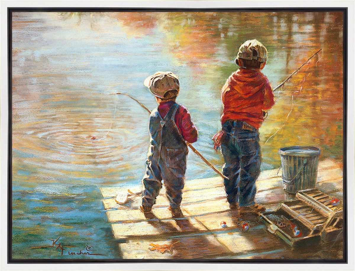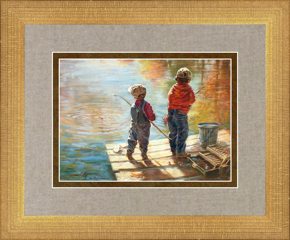 You’re a Keeper shares the story of two brothers learning to fish. The older brother proudly holds a new rod and reel with a fully stocked tacklebox at his feet. It is doubtful he will catch anything, for his line is slack and knotted. His younger brother is fishing with the basics—a cane pole and bread ball. He is awarded a bouncing bobber with a bite and quickly learns that it’s no longer fishing when you have a bite!