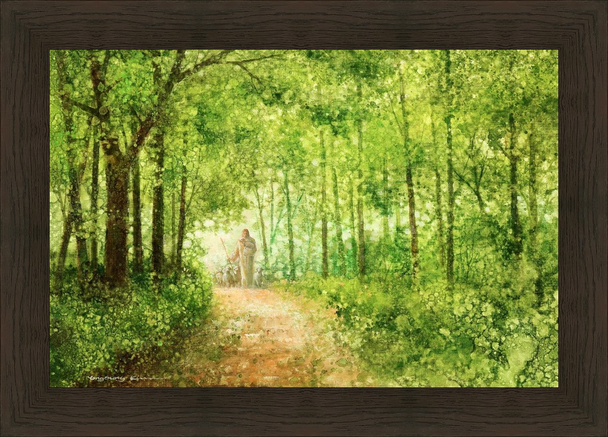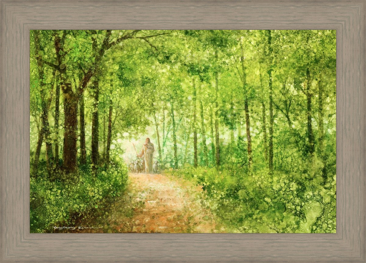 "Lead Thou Me On" by Yongsung Kim depicts Jesus Christ tenderly holding a lamb, leading a flock of sheep along a tree-lined path.
