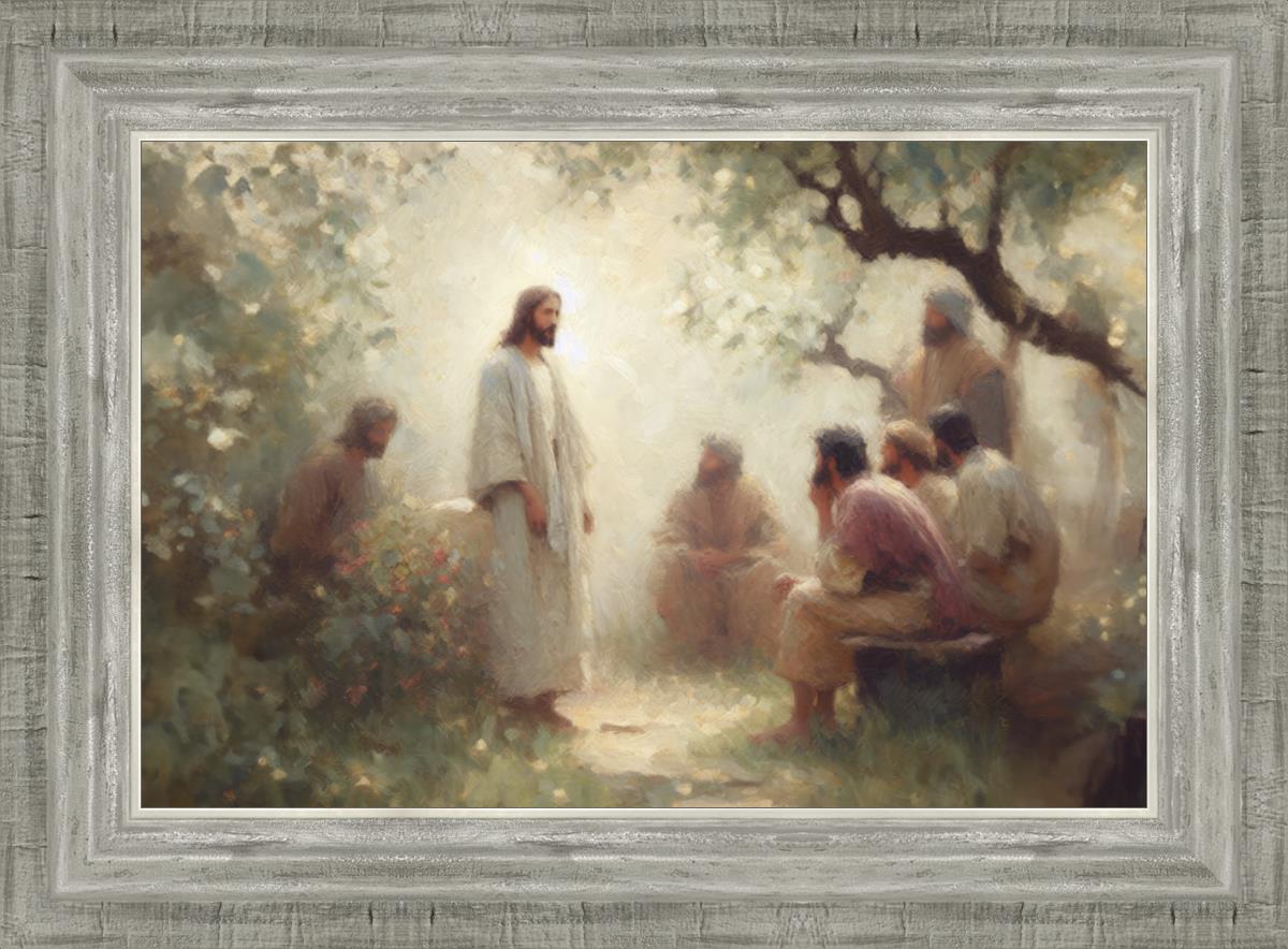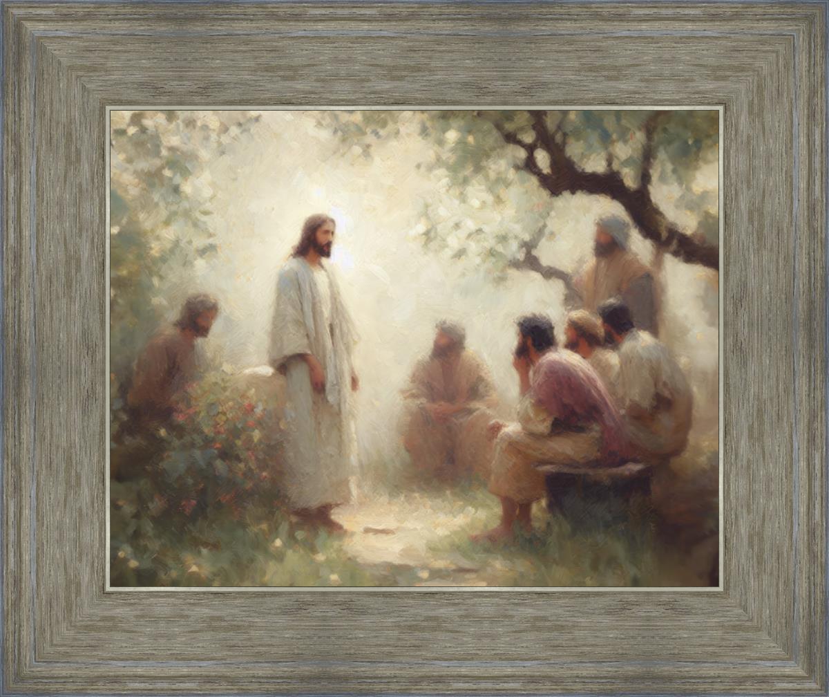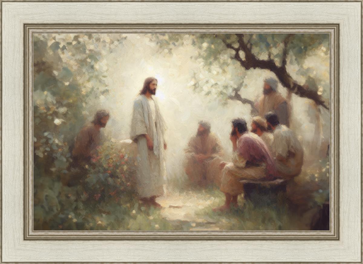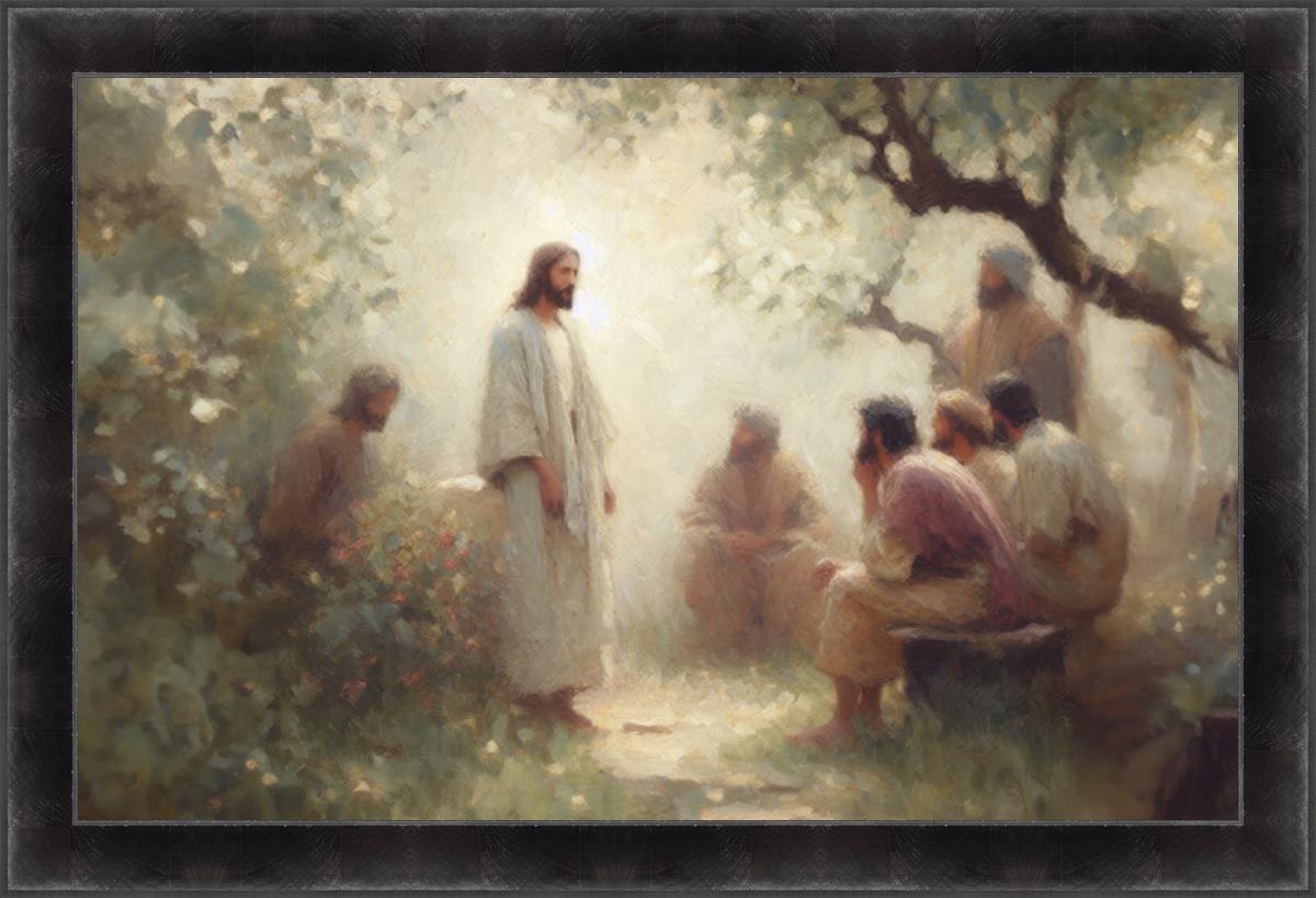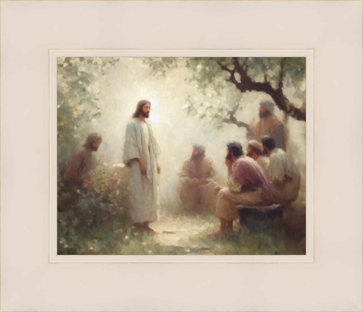 In "Learn of Me," Jesus teaches a small group of individuals in a grove of trees. With calmness, he imparts wisdom to his listeners, embodying Matthew 11:29: "Take my yoke upon you, and learn of me; for I am meek and lowly in heart: and ye shall find rest unto your souls.”