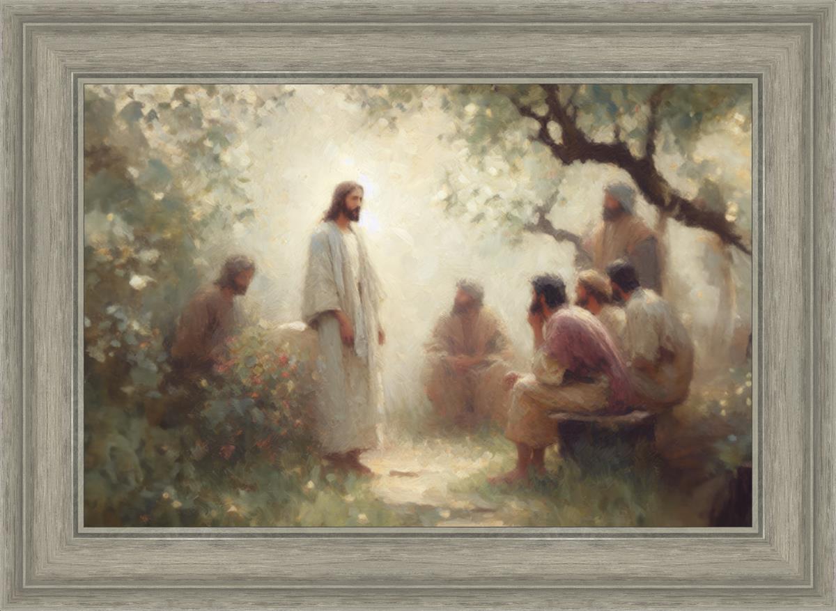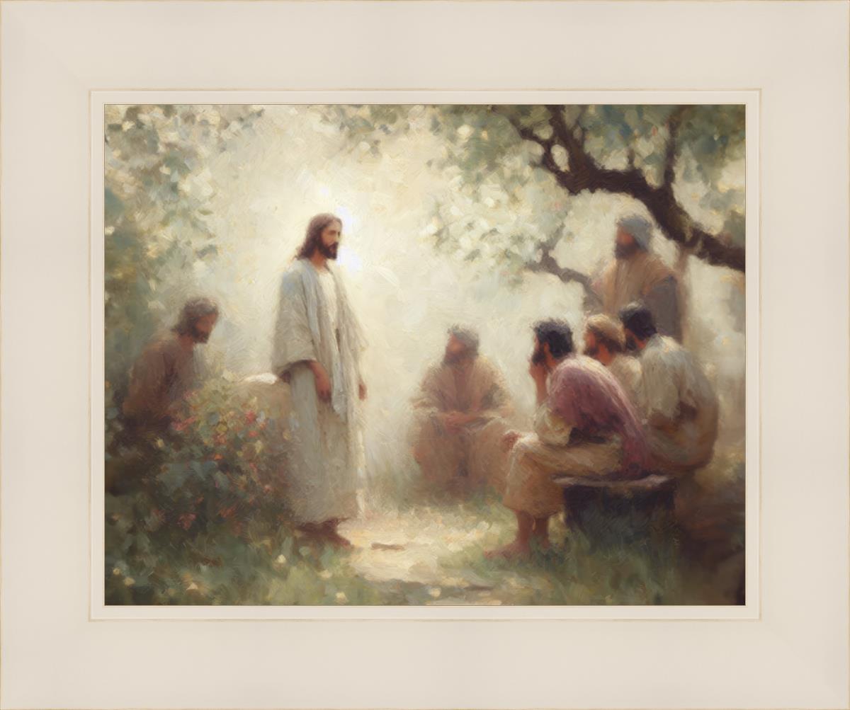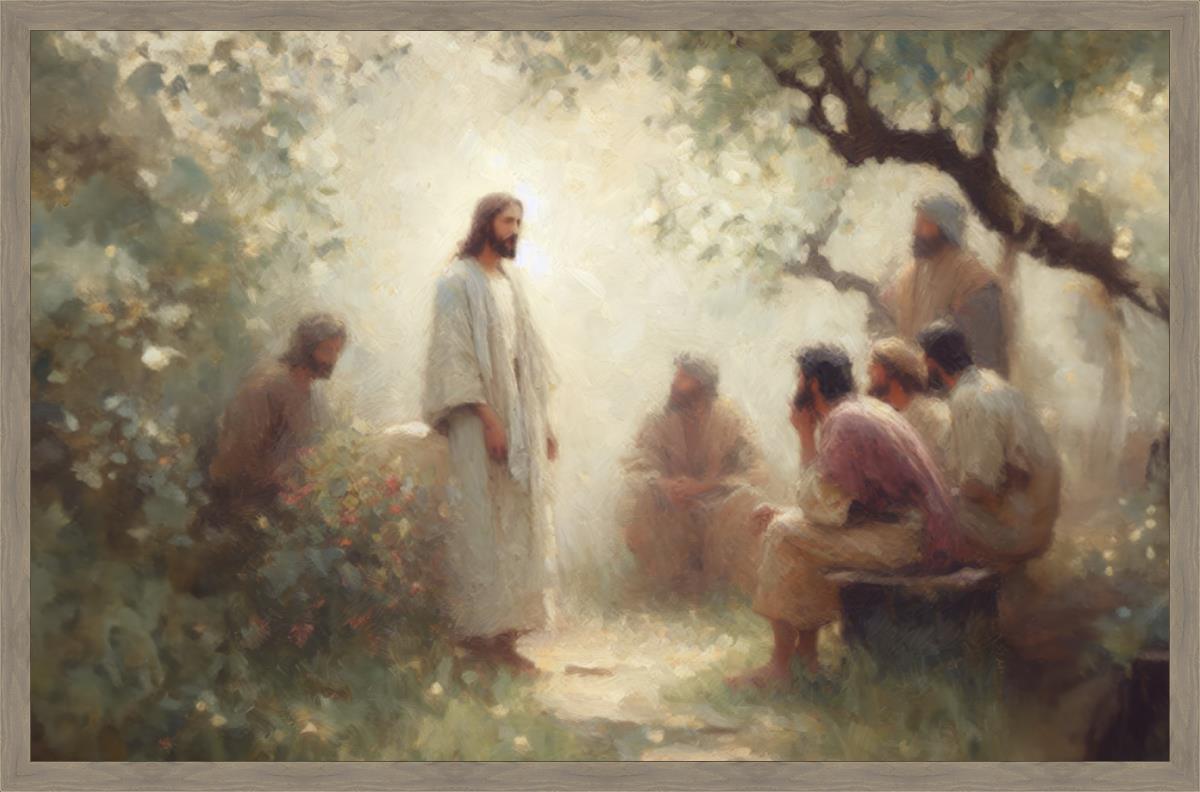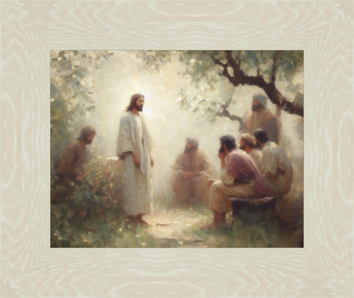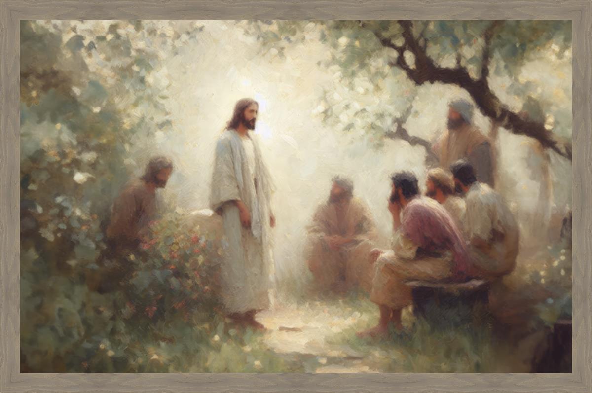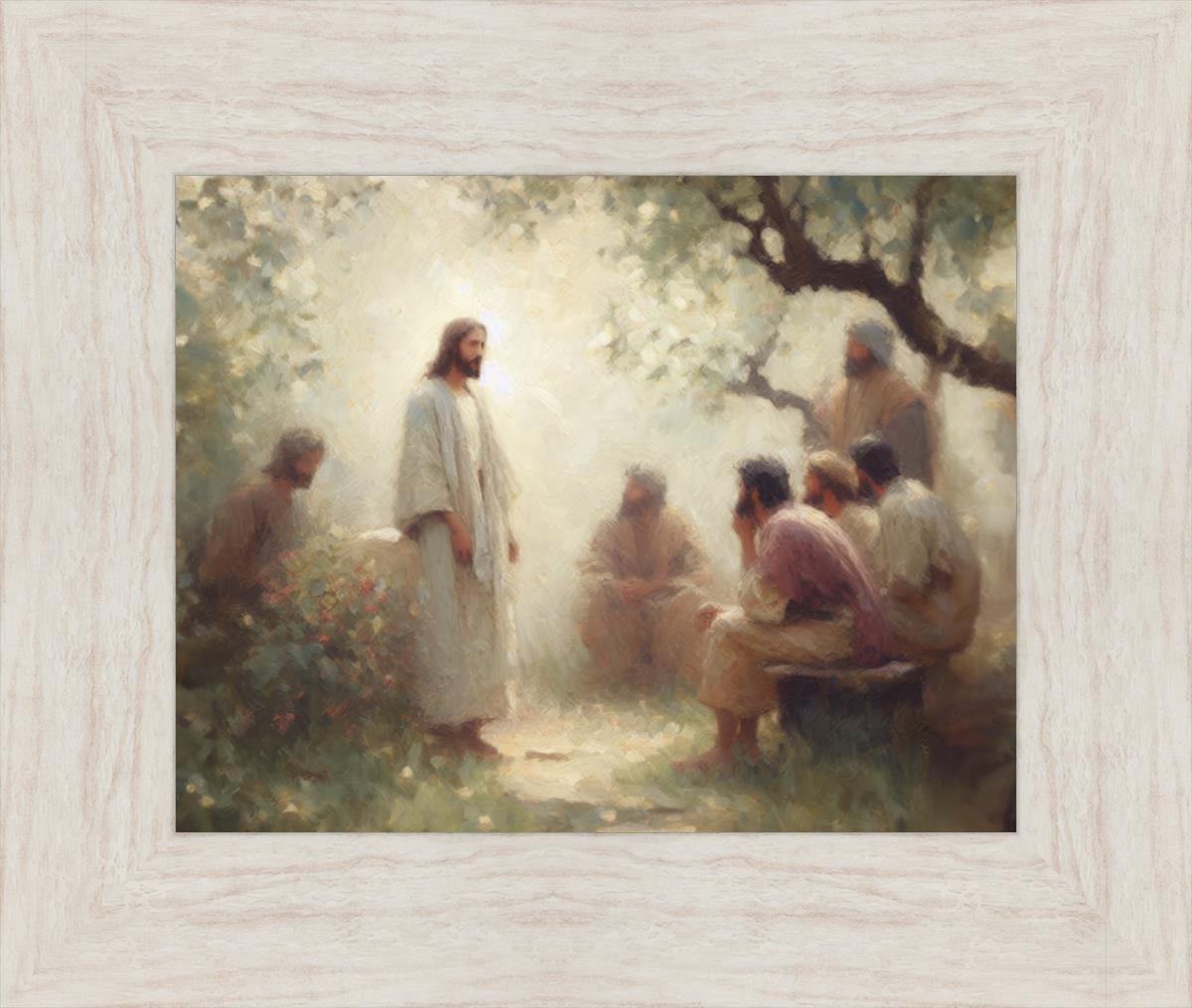 In "Learn of Me," Jesus teaches a small group of individuals in a grove of trees. With calmness, he imparts wisdom to his listeners, embodying Matthew 11:29: "Take my yoke upon you, and learn of me; for I am meek and lowly in heart: and ye shall find rest unto your souls.”