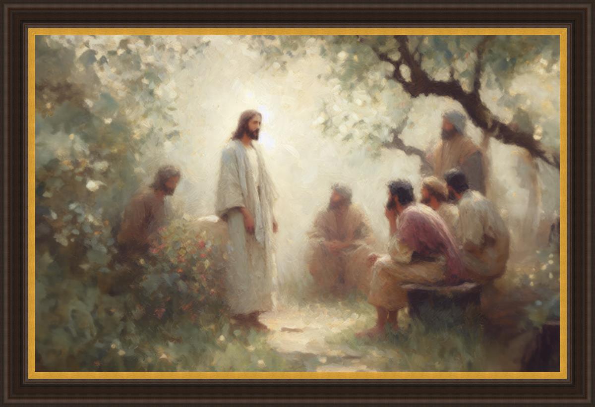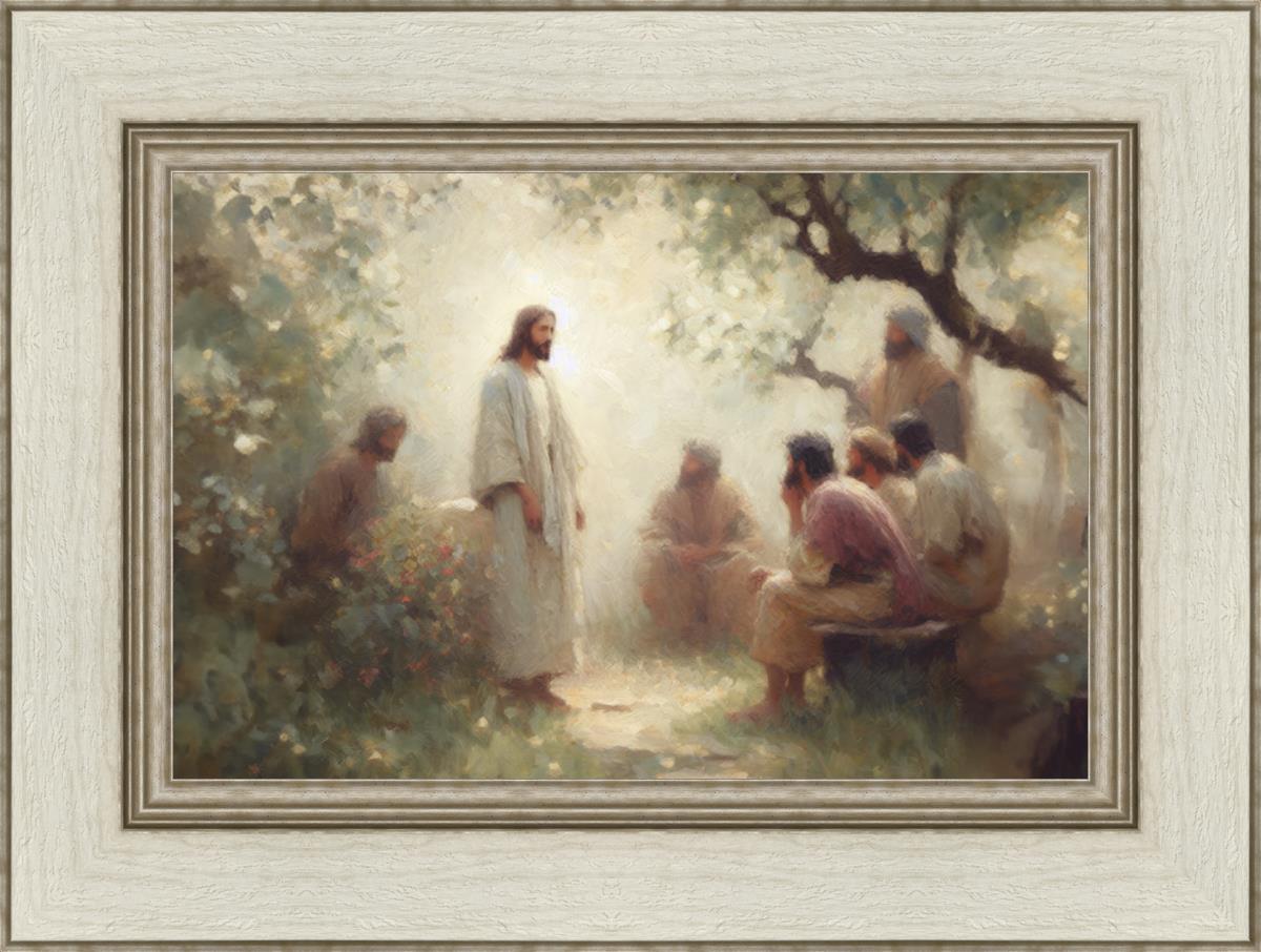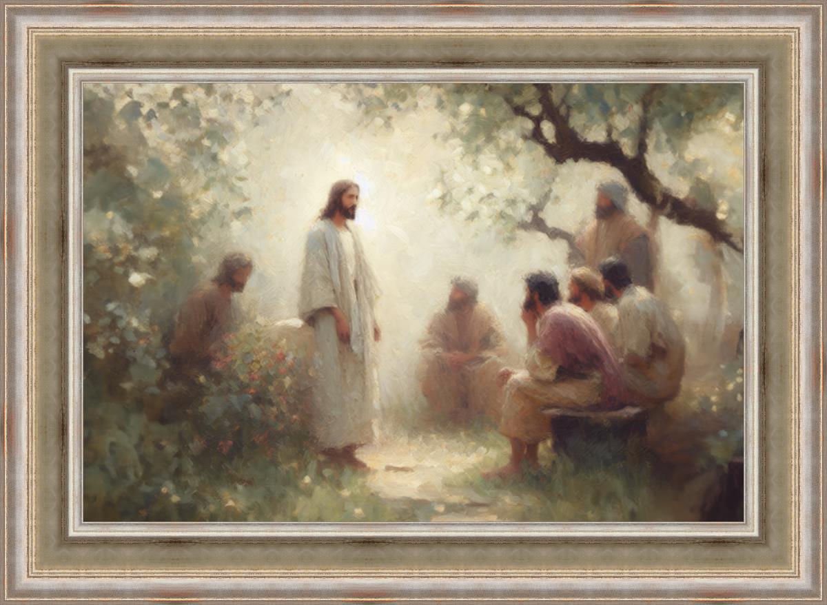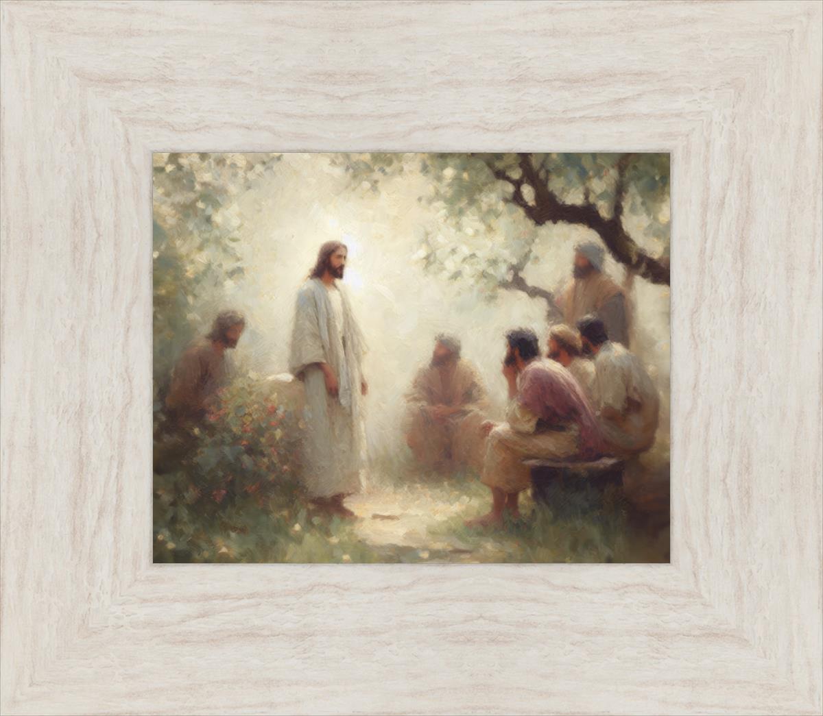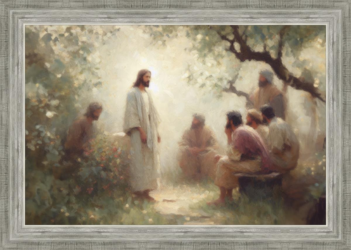 In "Learn of Me," Jesus teaches a small group of individuals in a grove of trees. With calmness, he imparts wisdom to his listeners, embodying Matthew 11:29: "Take my yoke upon you, and learn of me; for I am meek and lowly in heart: and ye shall find rest unto your souls.”