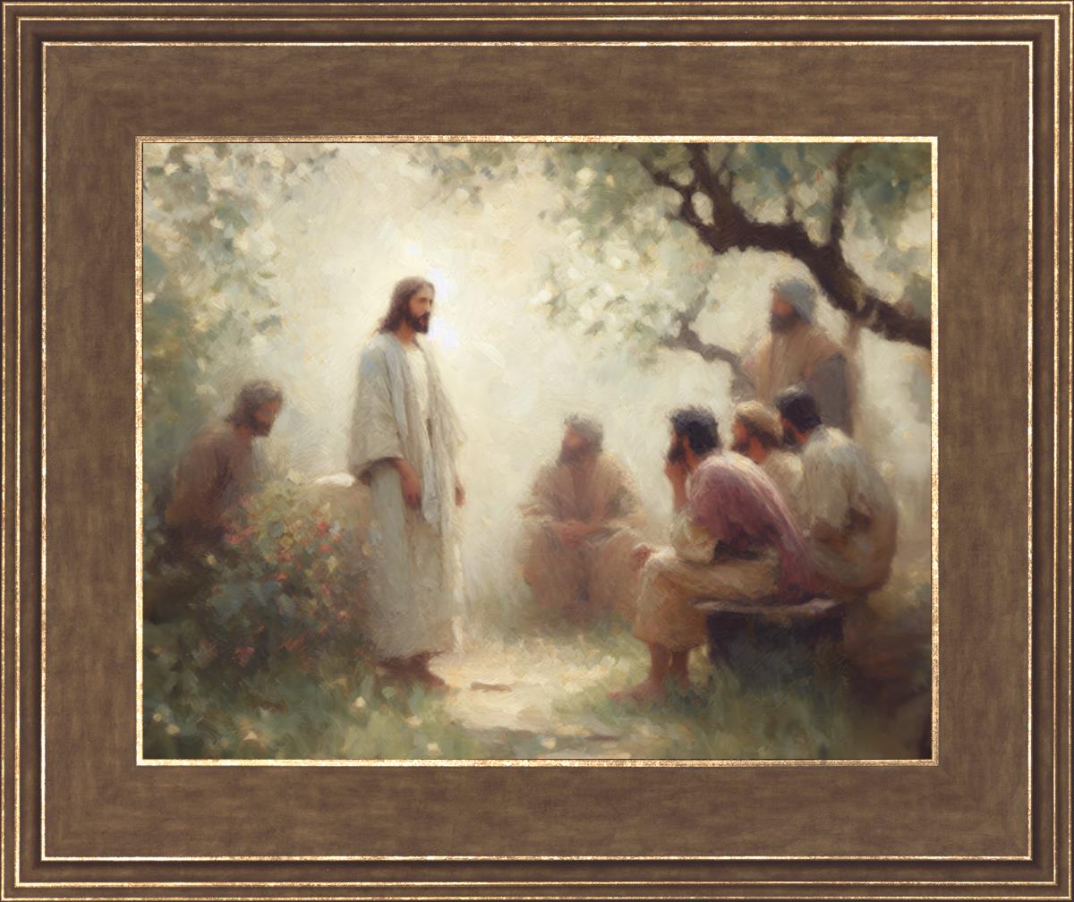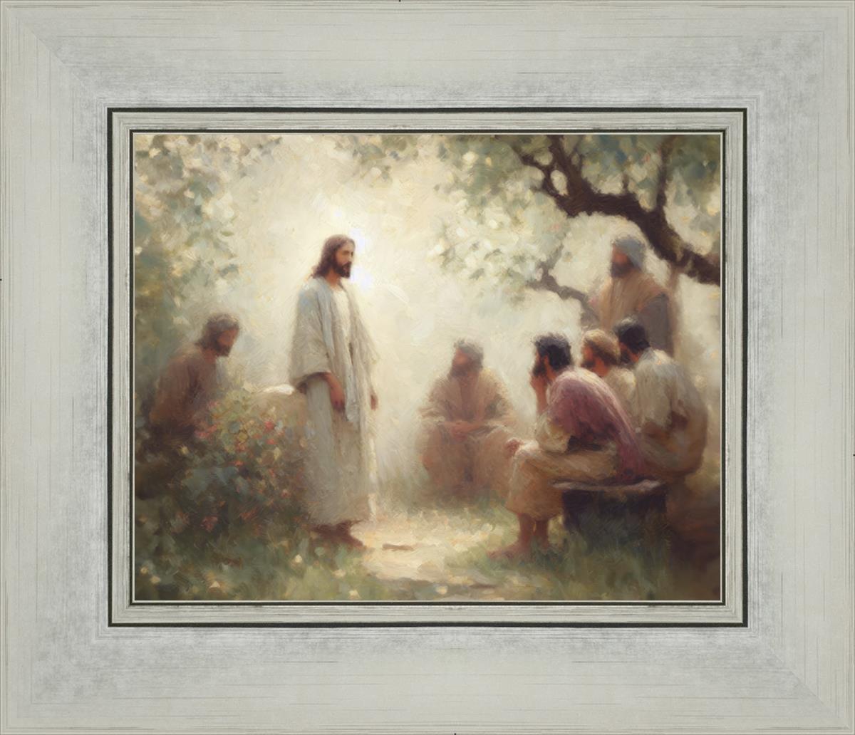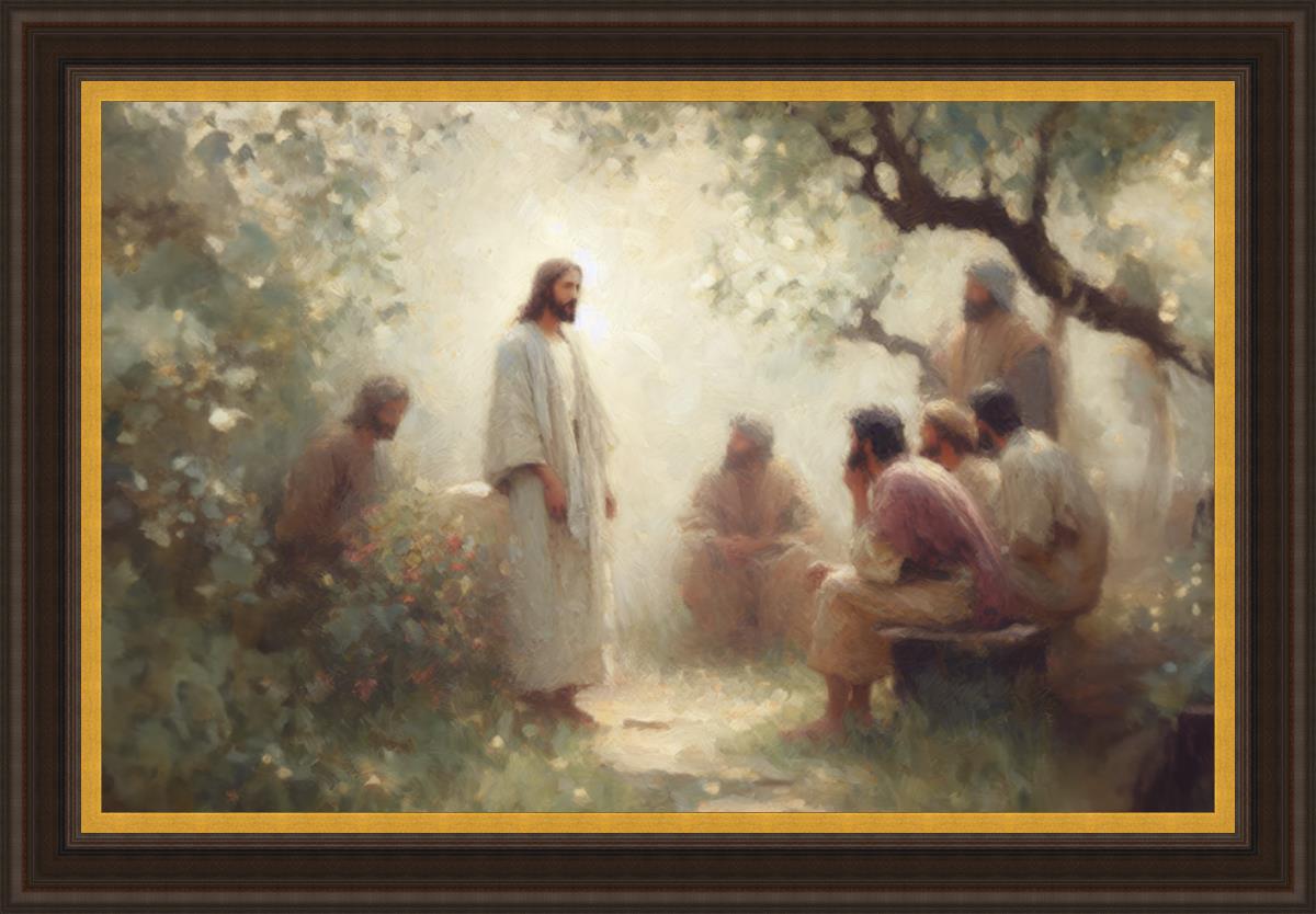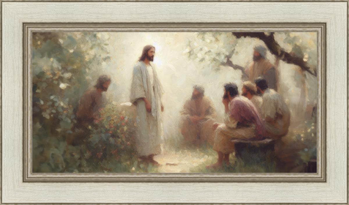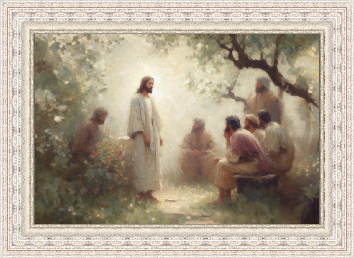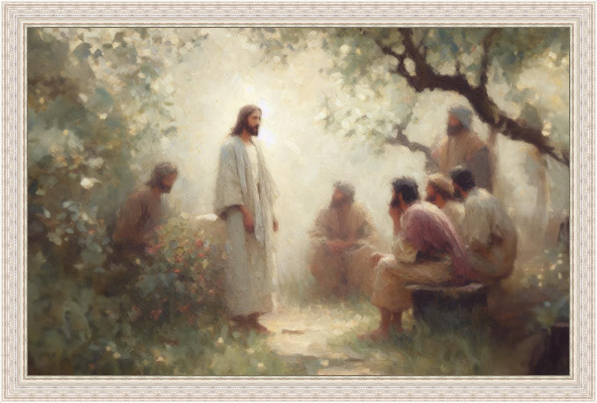 In "Learn of Me," Jesus teaches a small group of individuals in a grove of trees. With calmness, he imparts wisdom to his listeners, embodying Matthew 11:29: "Take my yoke upon you, and learn of me; for I am meek and lowly in heart: and ye shall find rest unto your souls.”