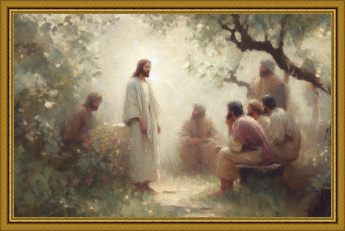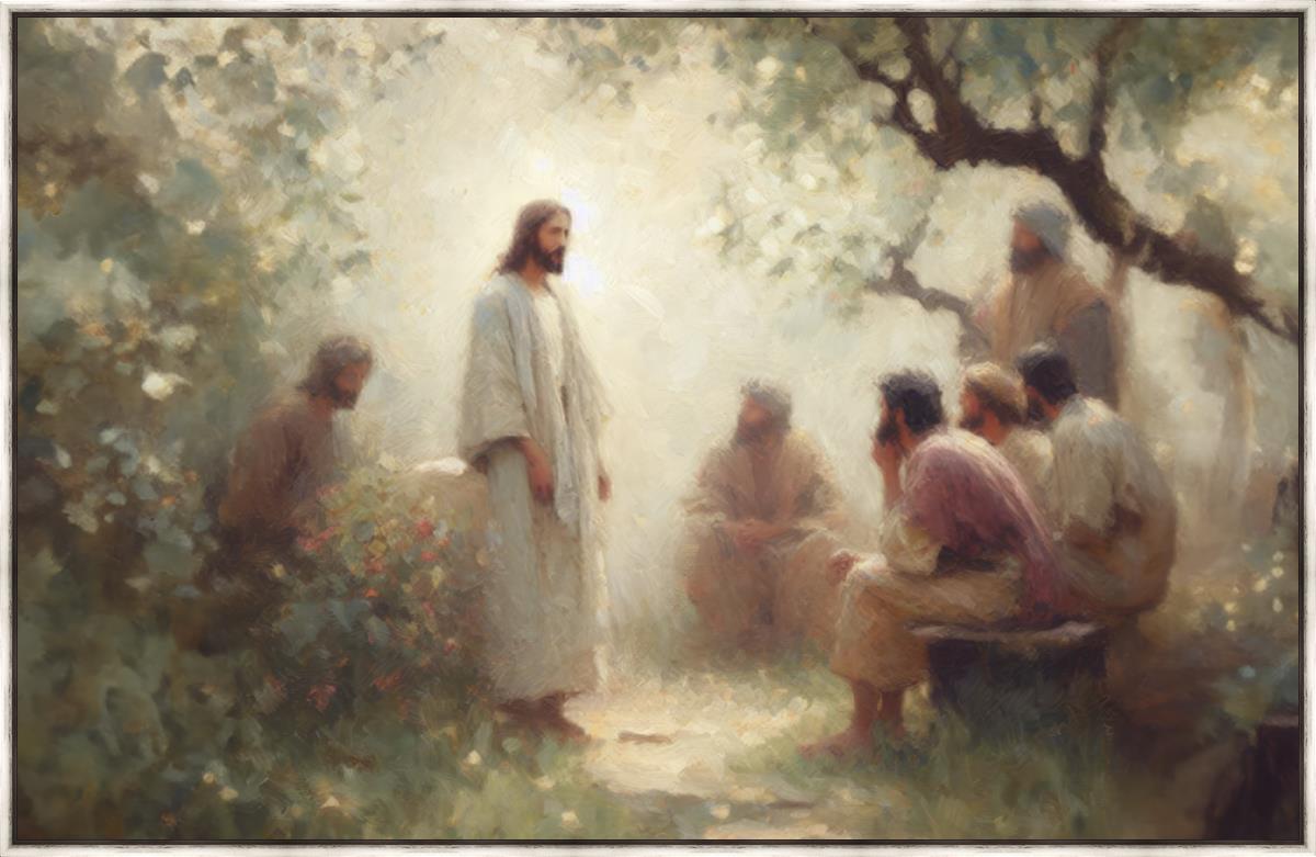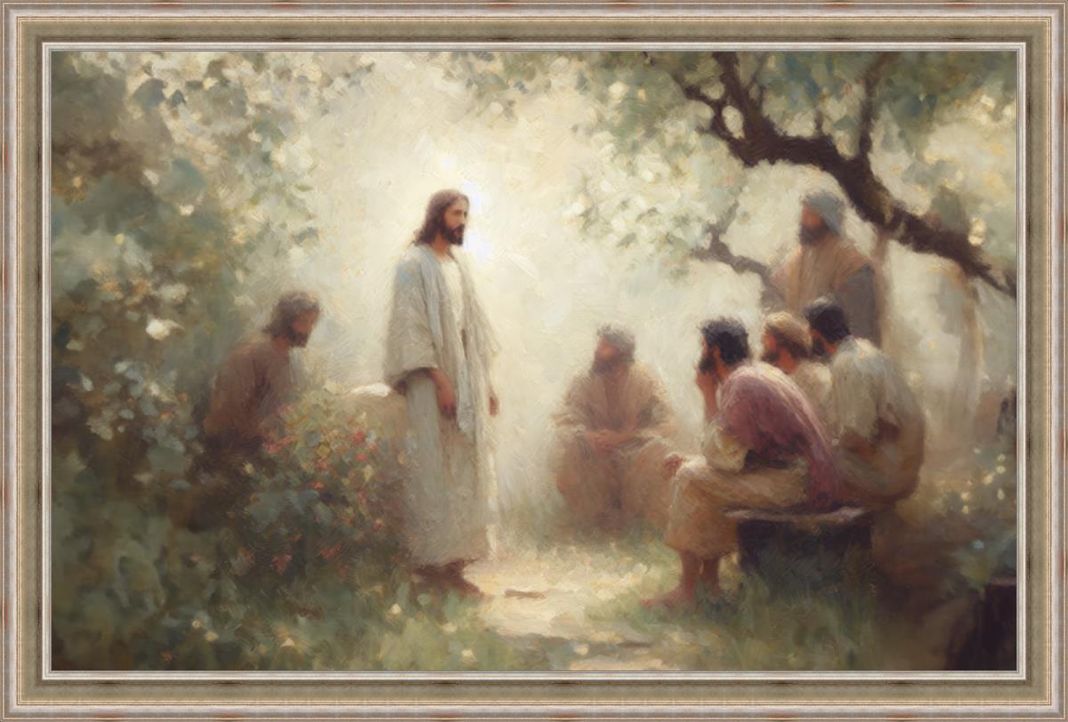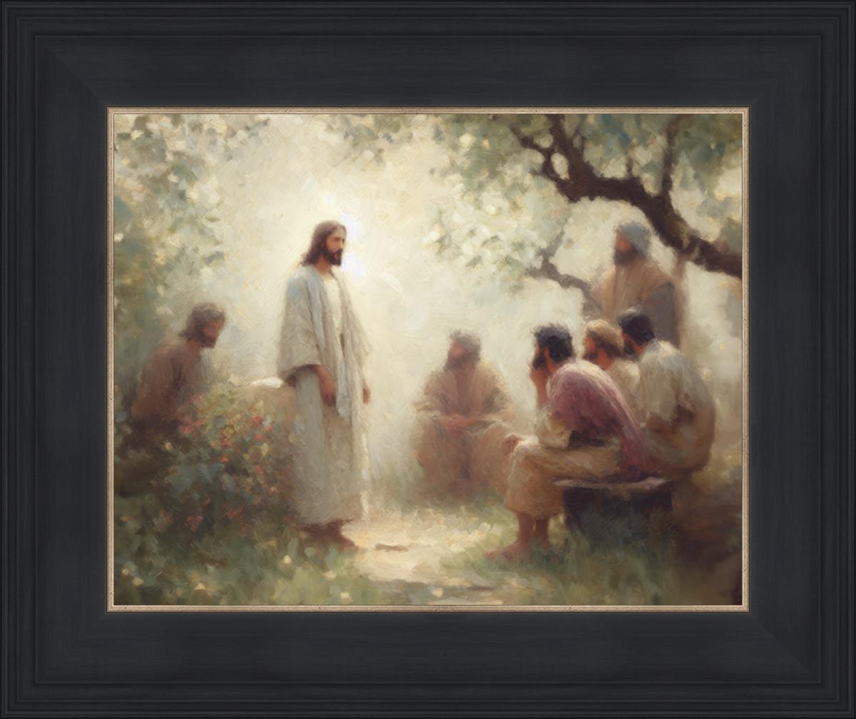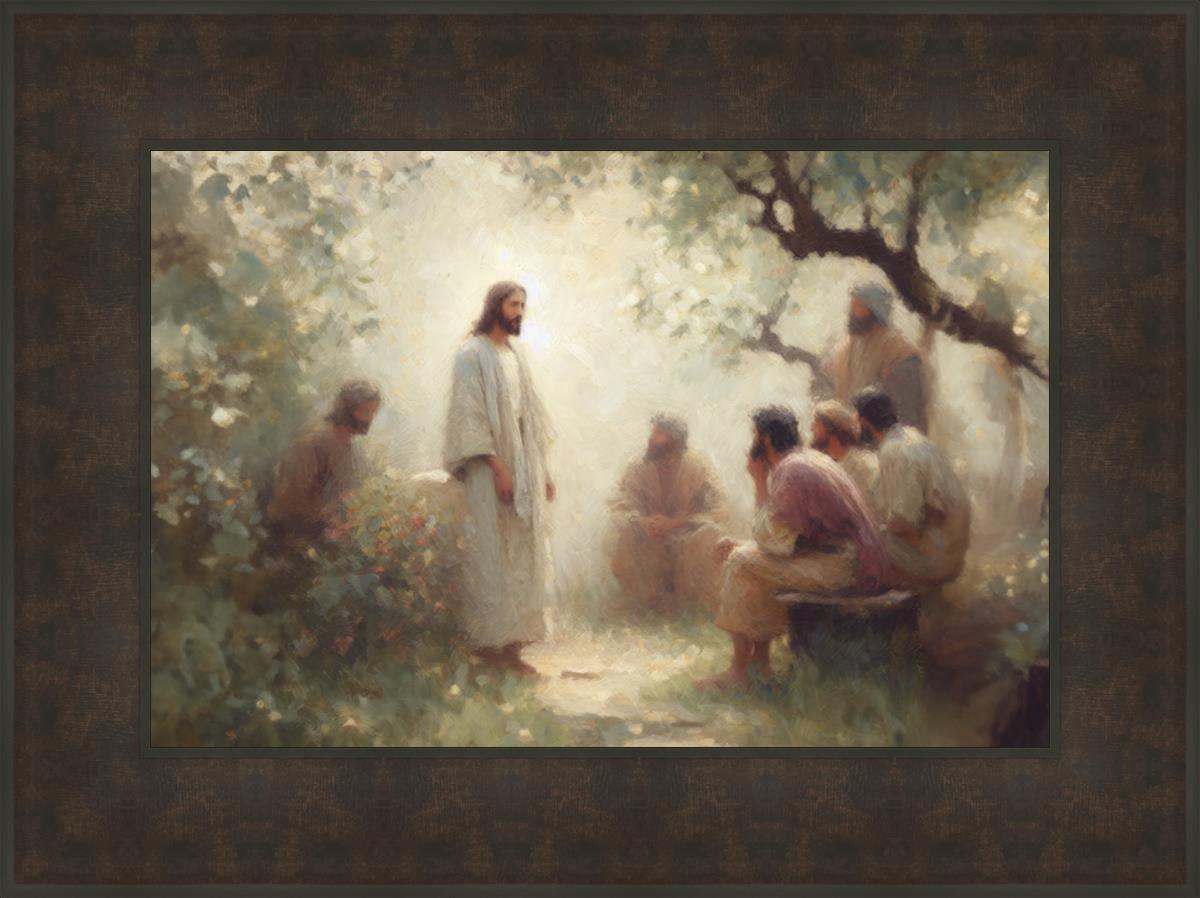 In "Learn of Me," Jesus teaches a small group of individuals in a grove of trees. With calmness, he imparts wisdom to his listeners, embodying Matthew 11:29: "Take my yoke upon you, and learn of me; for I am meek and lowly in heart: and ye shall find rest unto your souls.”