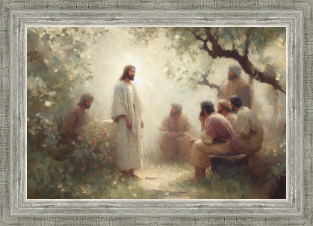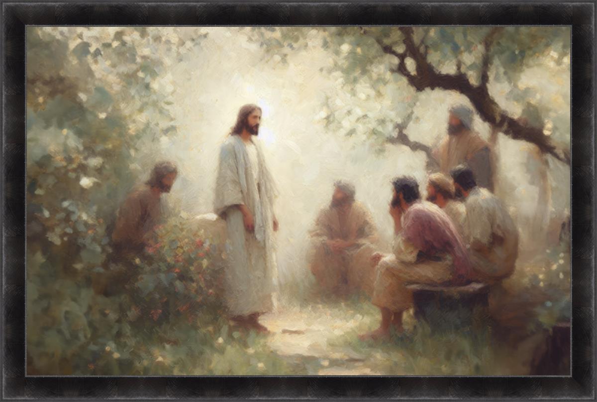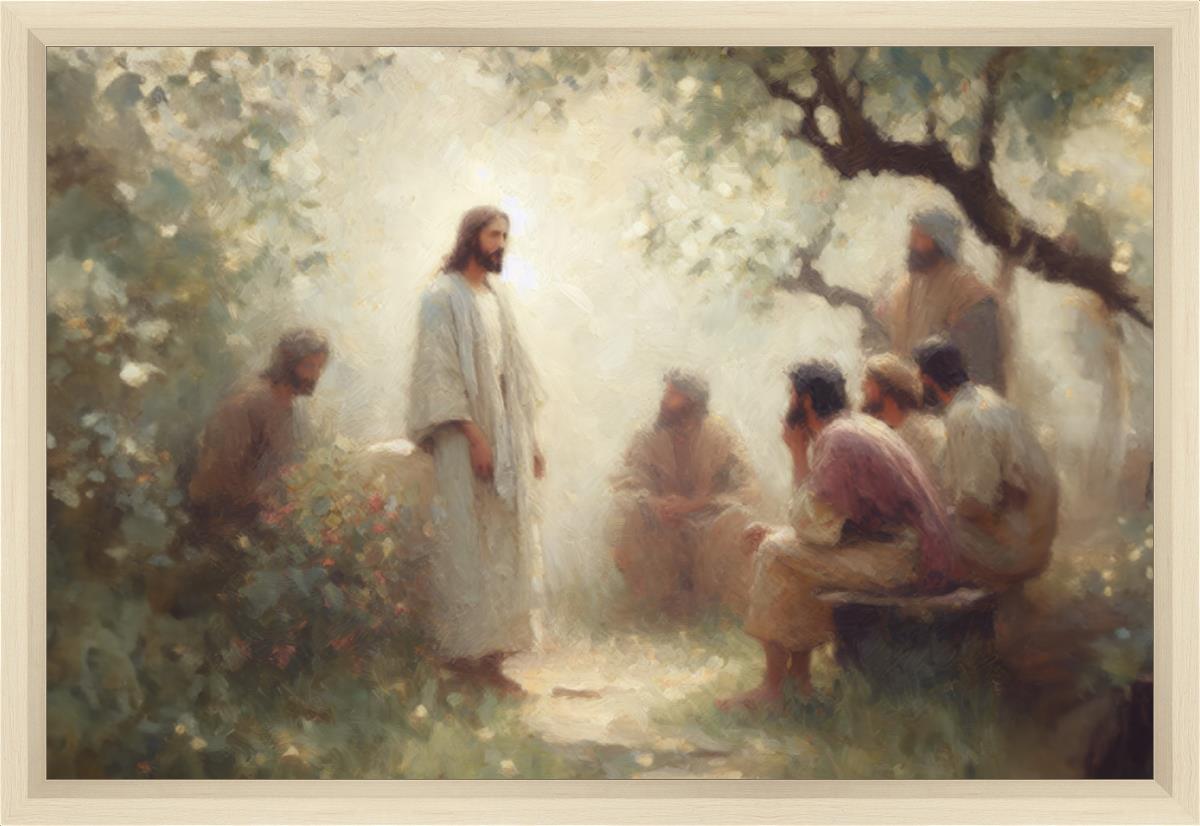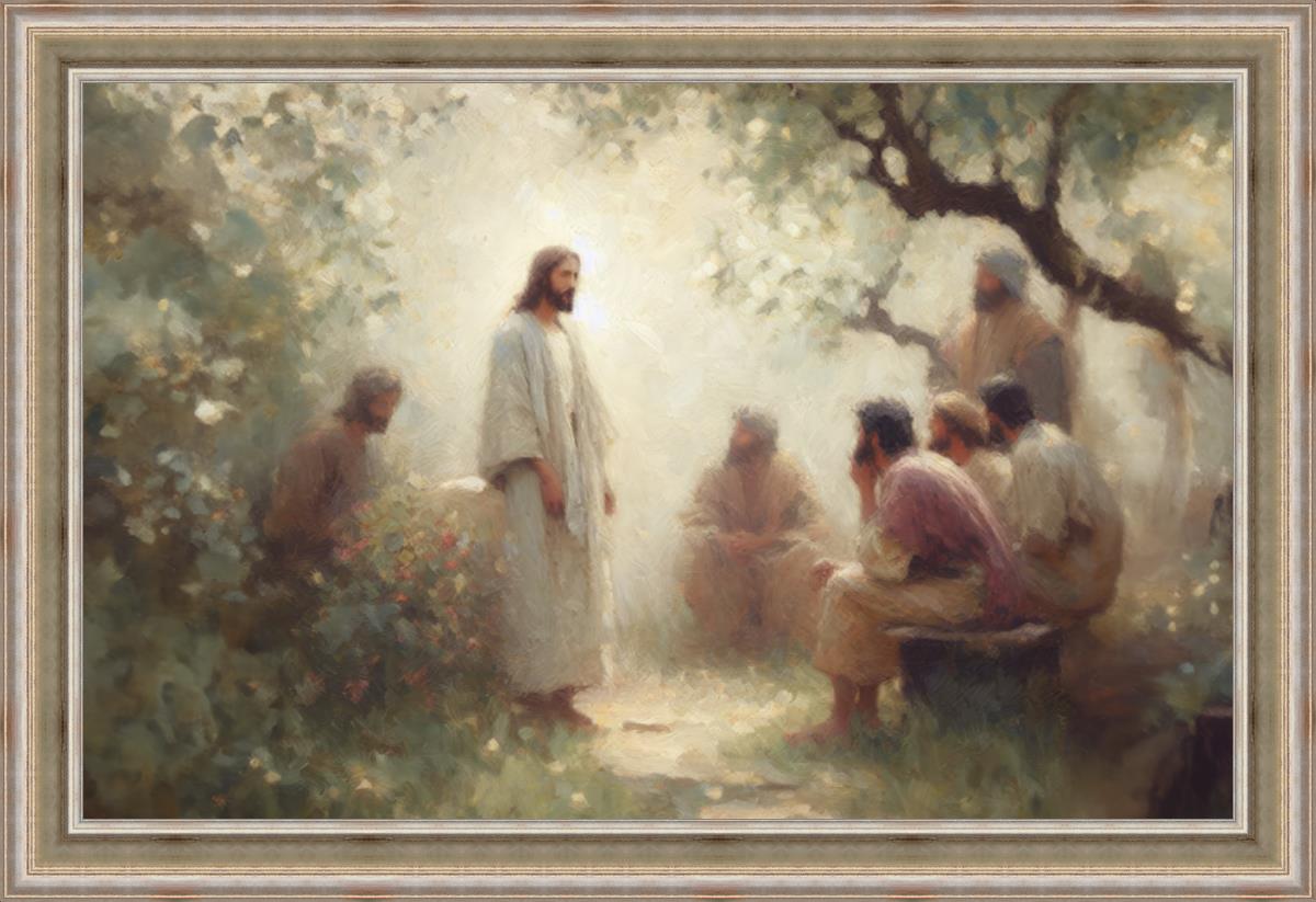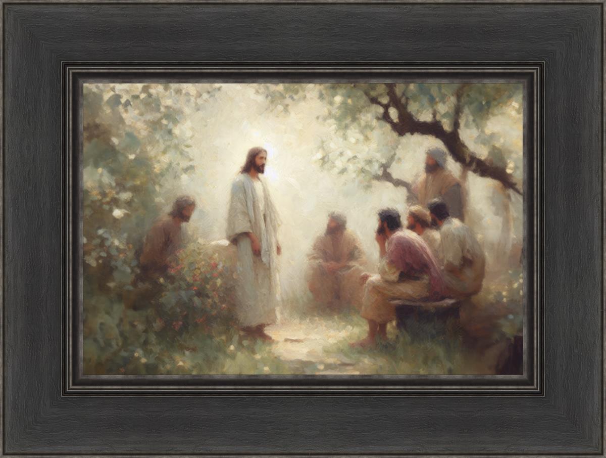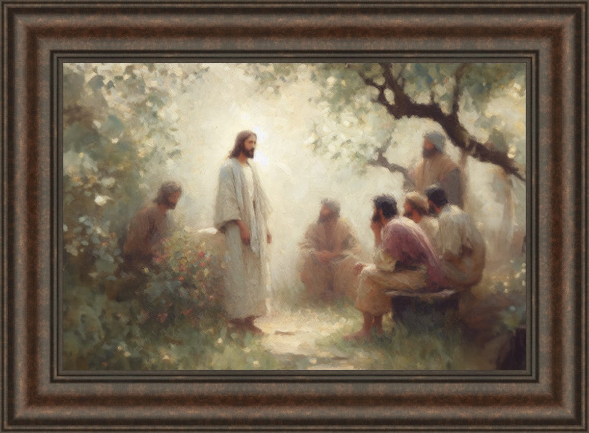 In "Learn of Me," Jesus teaches a small group of individuals in a grove of trees. With calmness, he imparts wisdom to his listeners, embodying Matthew 11:29: "Take my yoke upon you, and learn of me; for I am meek and lowly in heart: and ye shall find rest unto your souls.”