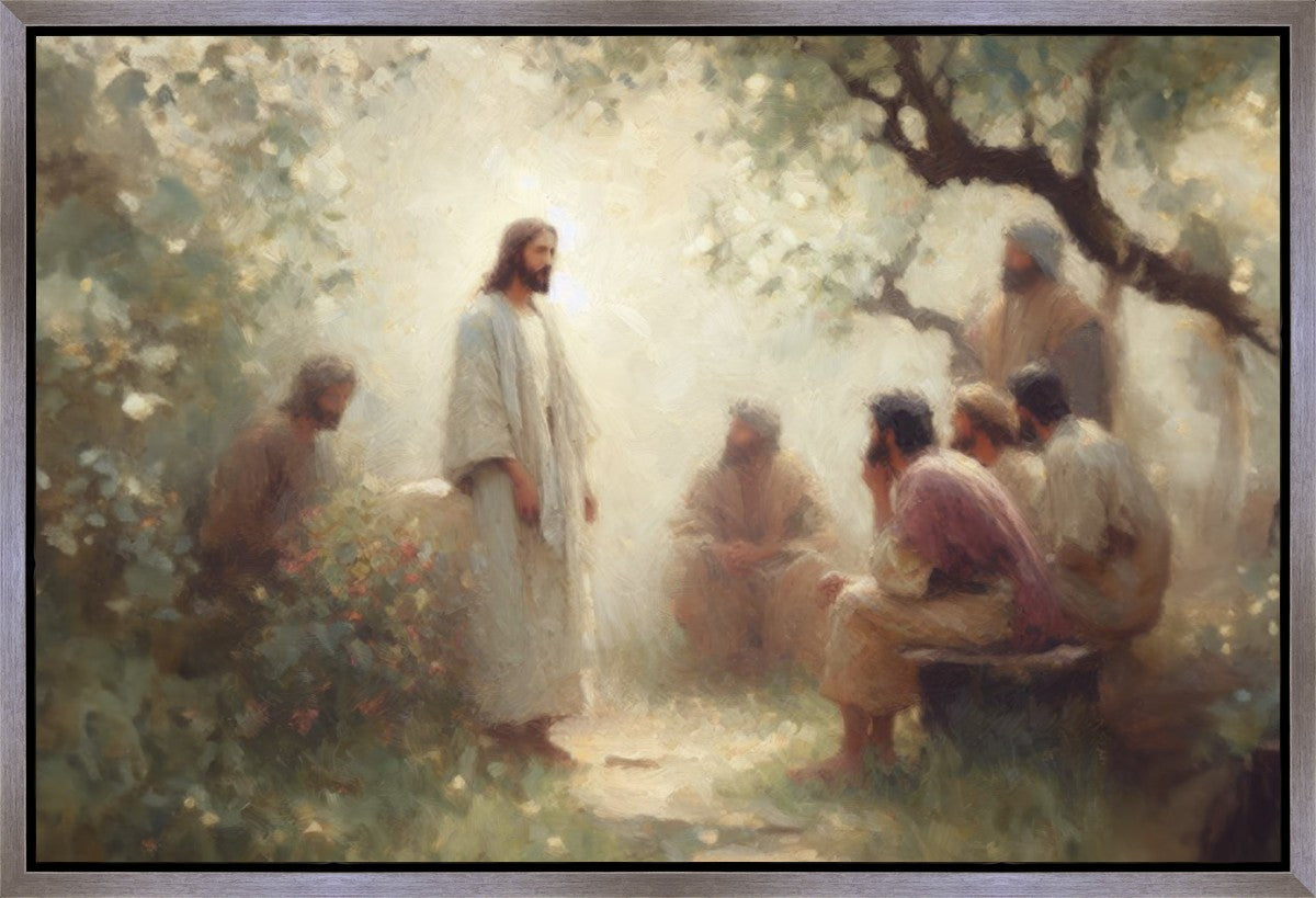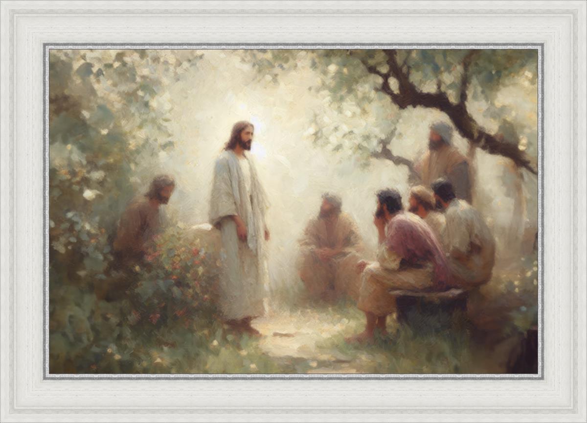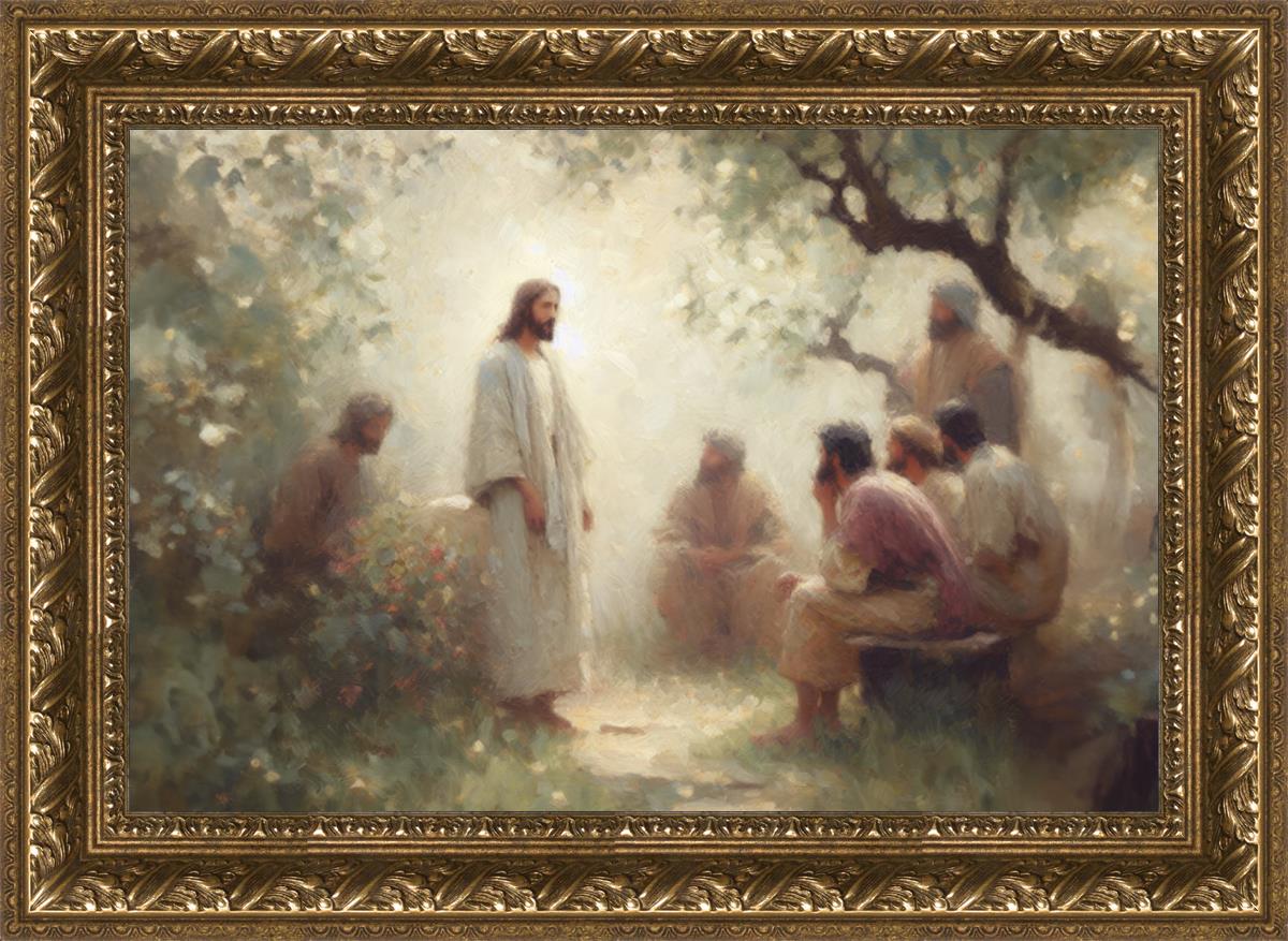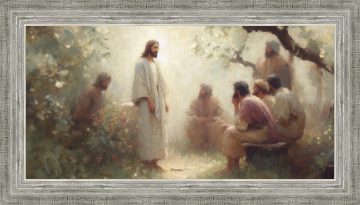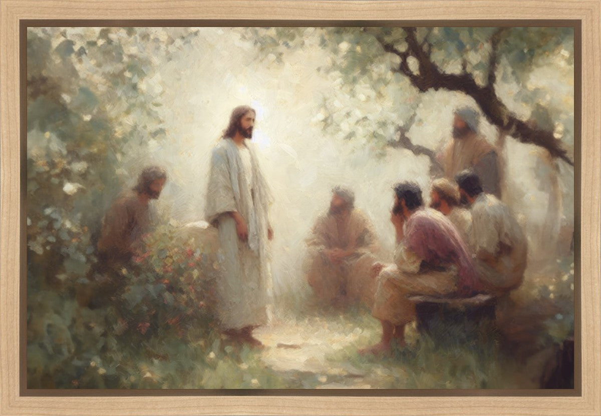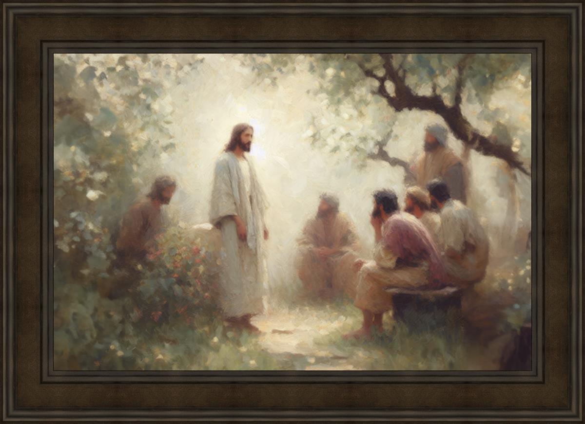In "Learn of Me," Jesus teaches a small group of individuals in a grove of trees. With calmness, he imparts wisdom to his listeners, embodying Matthew 11:29: "Take my yoke upon you, and learn of me; for I am meek and lowly in heart: and ye shall find rest unto your souls.”
