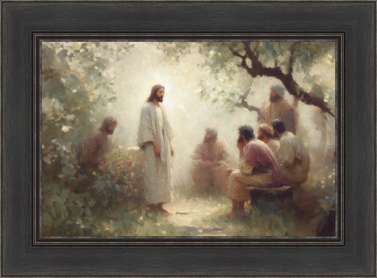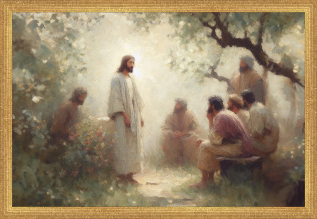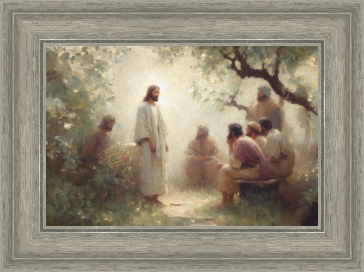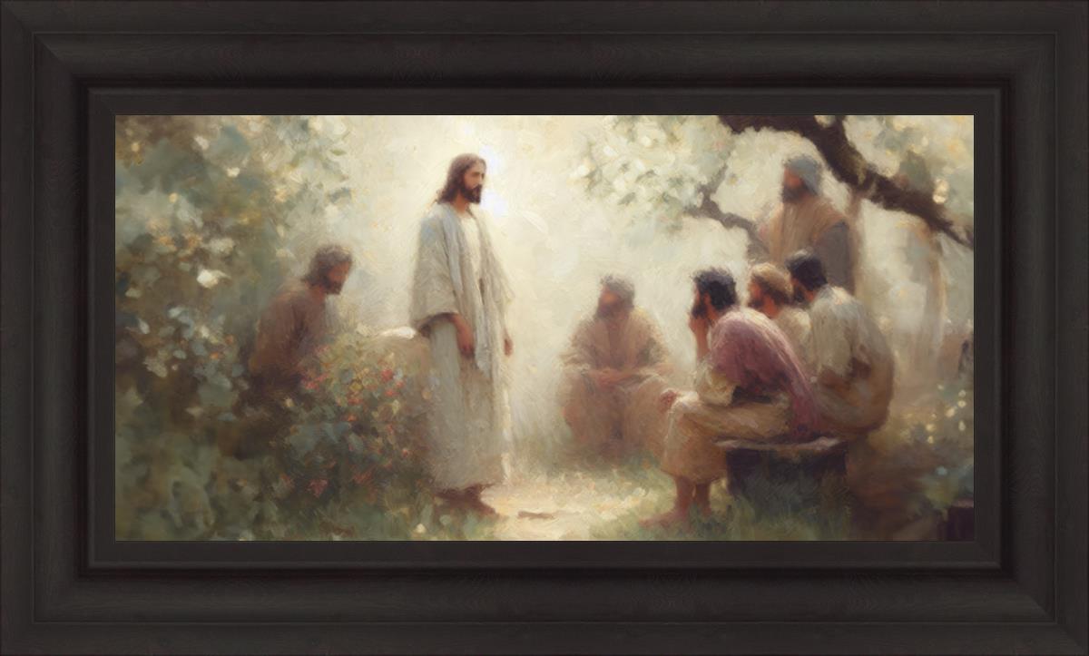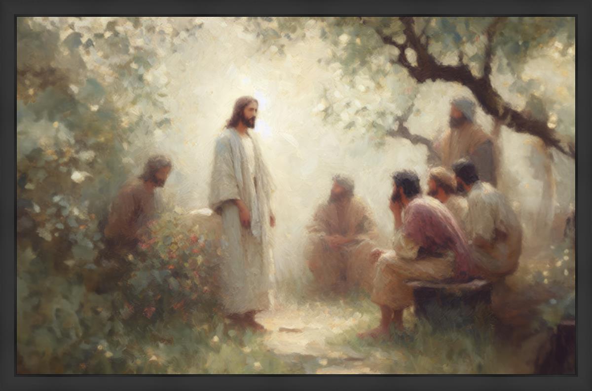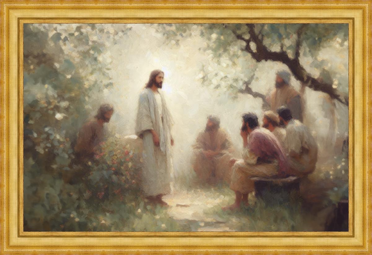In "Learn of Me," Jesus teaches a small group of individuals in a grove of trees. With calmness, he imparts wisdom to his listeners, embodying Matthew 11:29: "Take my yoke upon you, and learn of me; for I am meek and lowly in heart: and ye shall find rest unto your souls.”