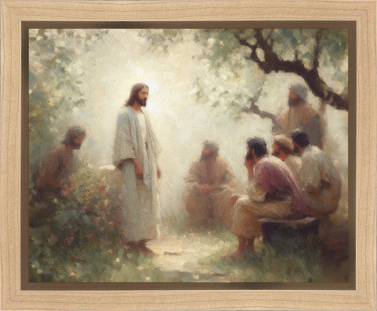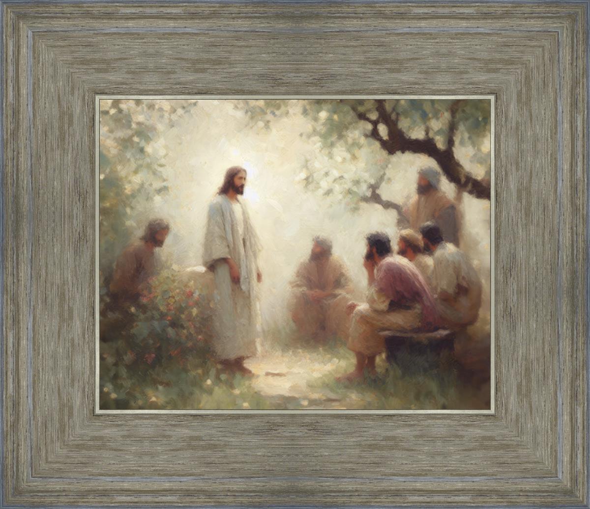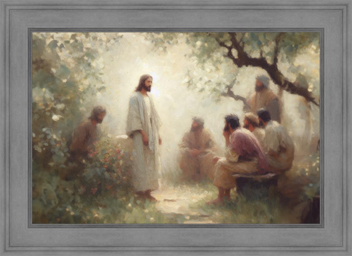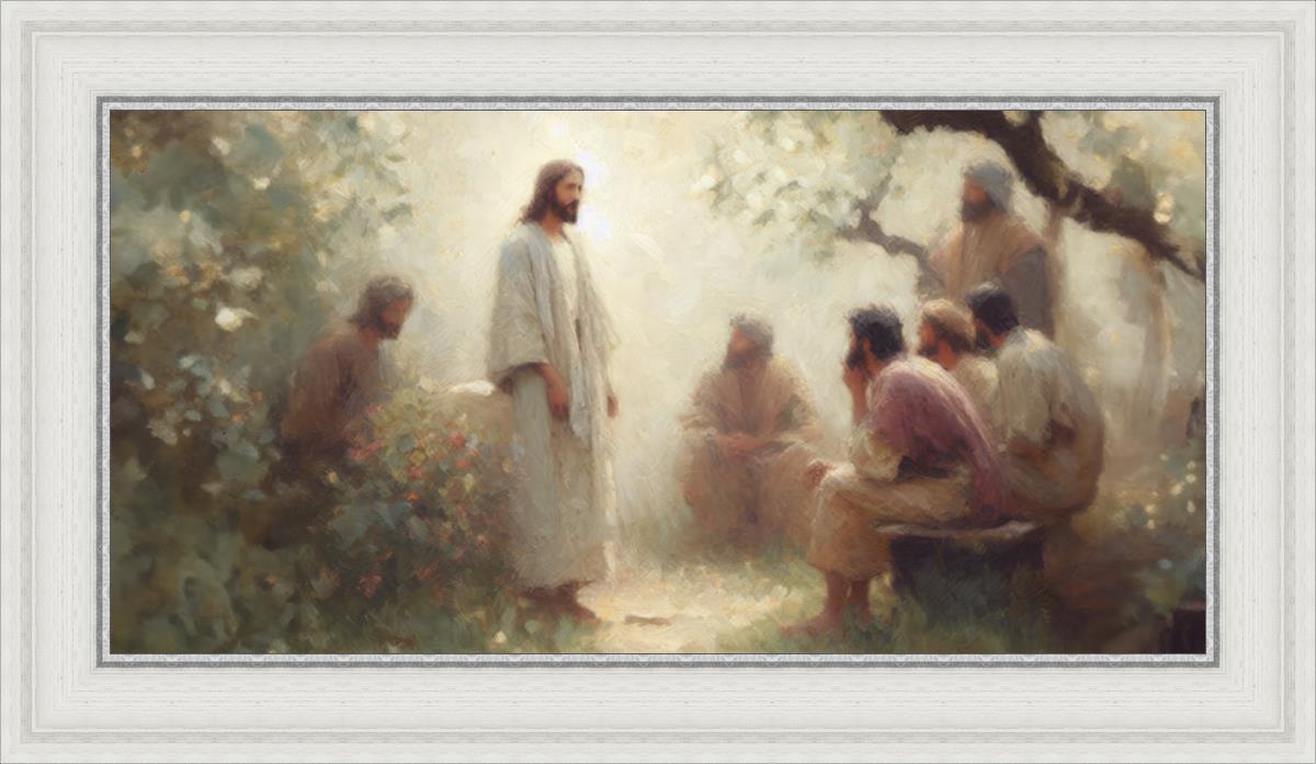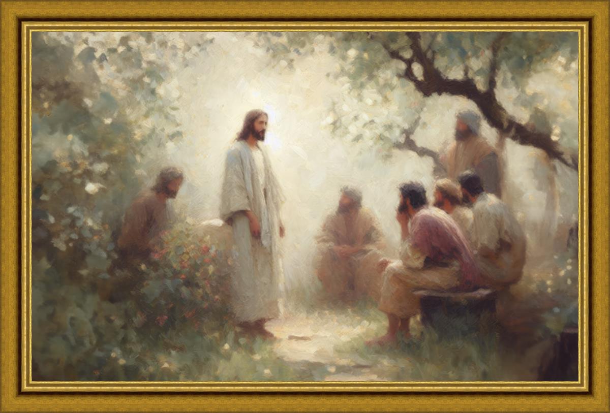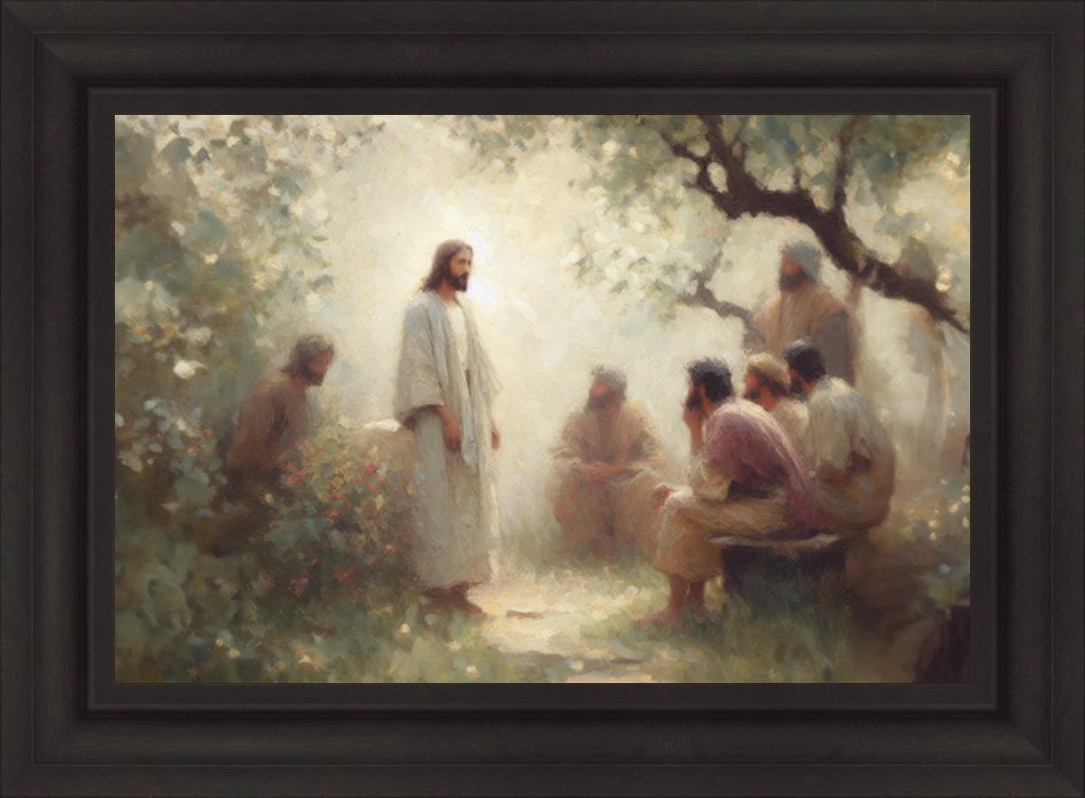 In "Learn of Me," Jesus teaches a small group of individuals in a grove of trees. With calmness, he imparts wisdom to his listeners, embodying Matthew 11:29: "Take my yoke upon you, and learn of me; for I am meek and lowly in heart: and ye shall find rest unto your souls.”