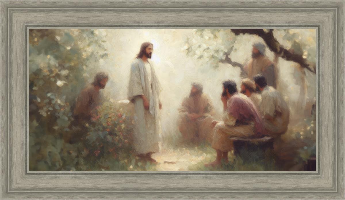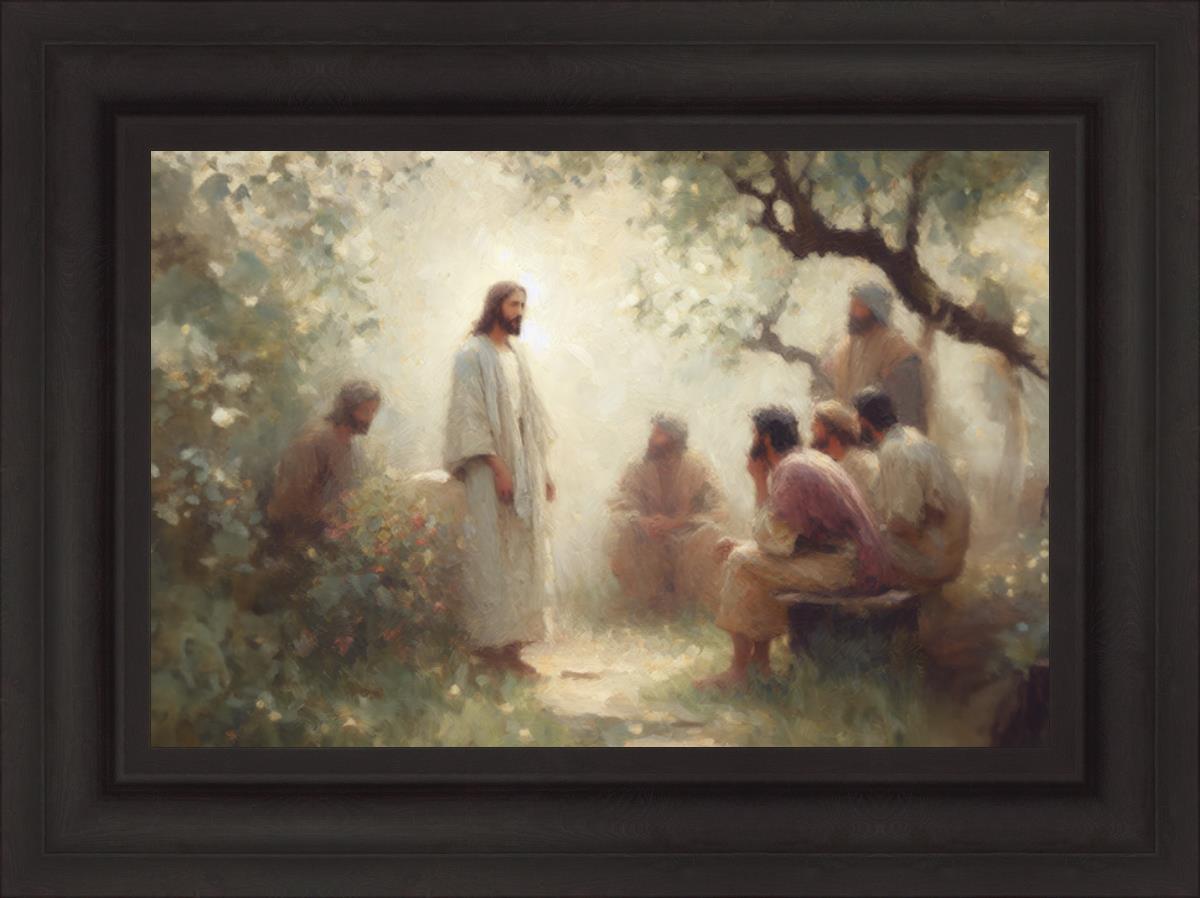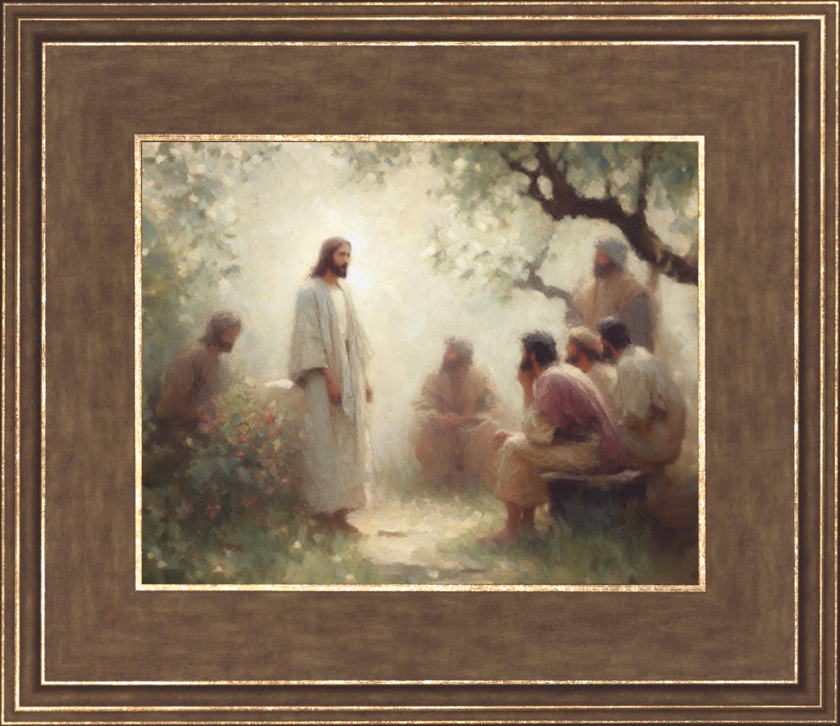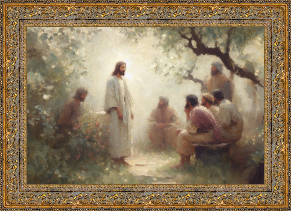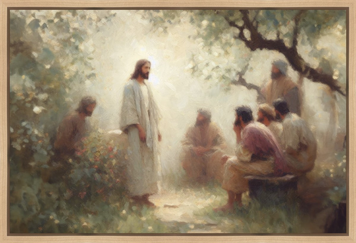 In "Learn of Me," Jesus teaches a small group of individuals in a grove of trees. With calmness, he imparts wisdom to his listeners, embodying Matthew 11:29: "Take my yoke upon you, and learn of me; for I am meek and lowly in heart: and ye shall find rest unto your souls.”