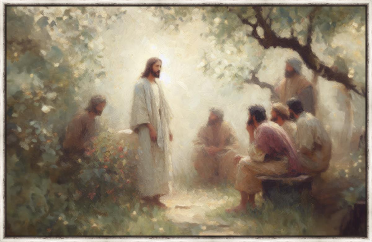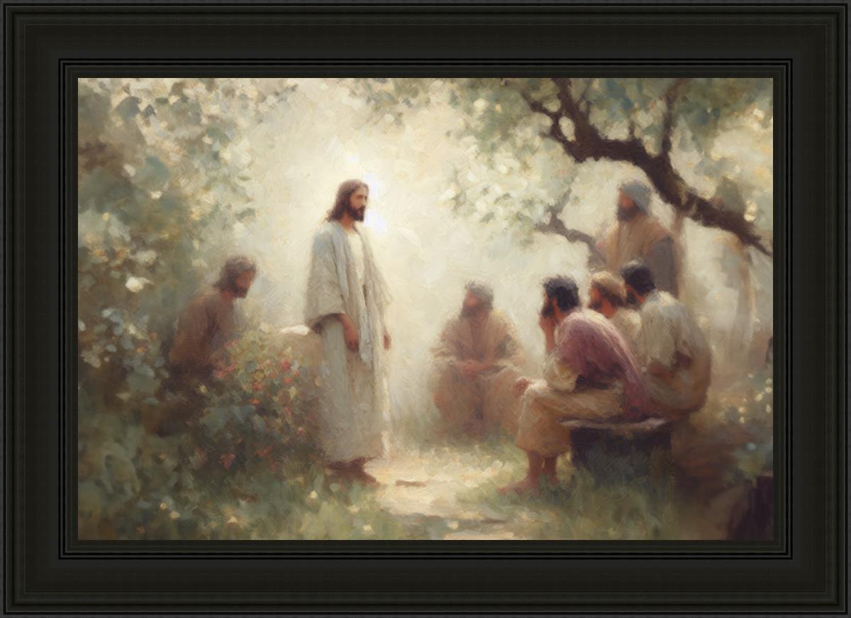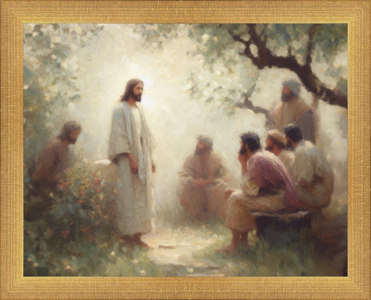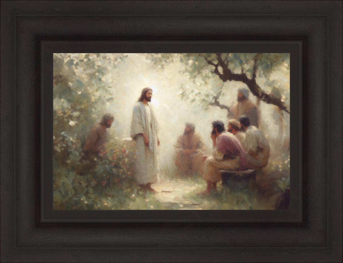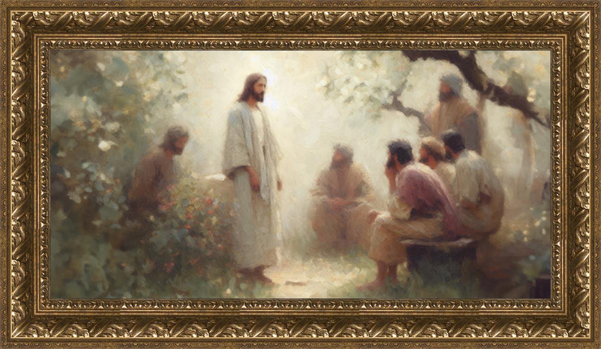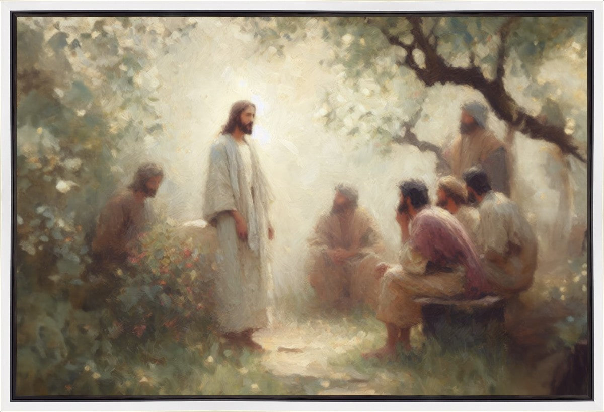 In "Learn of Me," Jesus teaches a small group of individuals in a grove of trees. With calmness, he imparts wisdom to his listeners, embodying Matthew 11:29: "Take my yoke upon you, and learn of me; for I am meek and lowly in heart: and ye shall find rest unto your souls.”