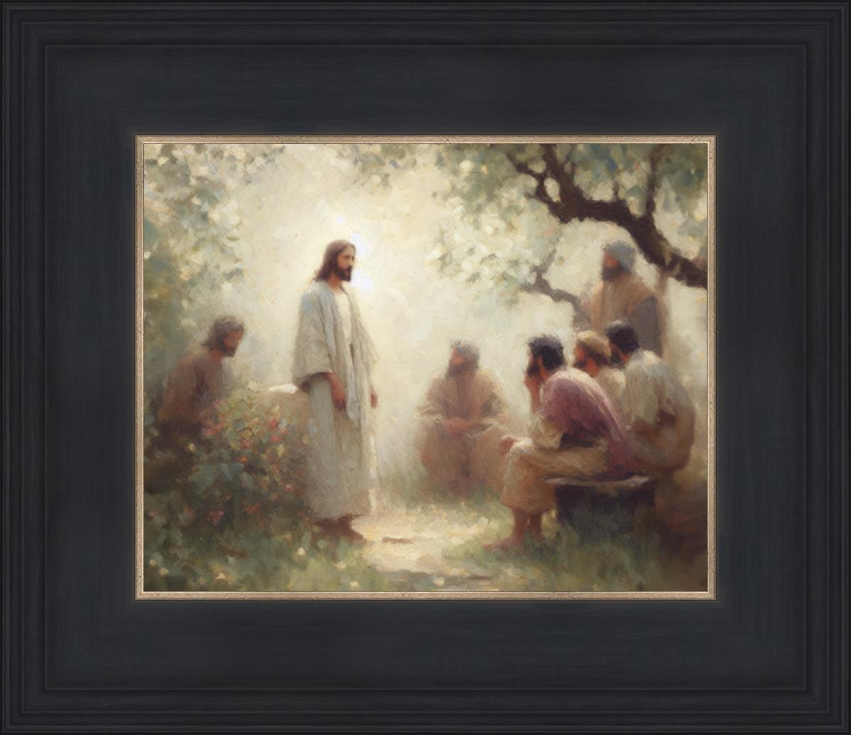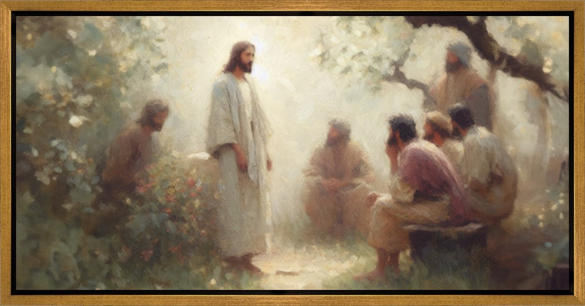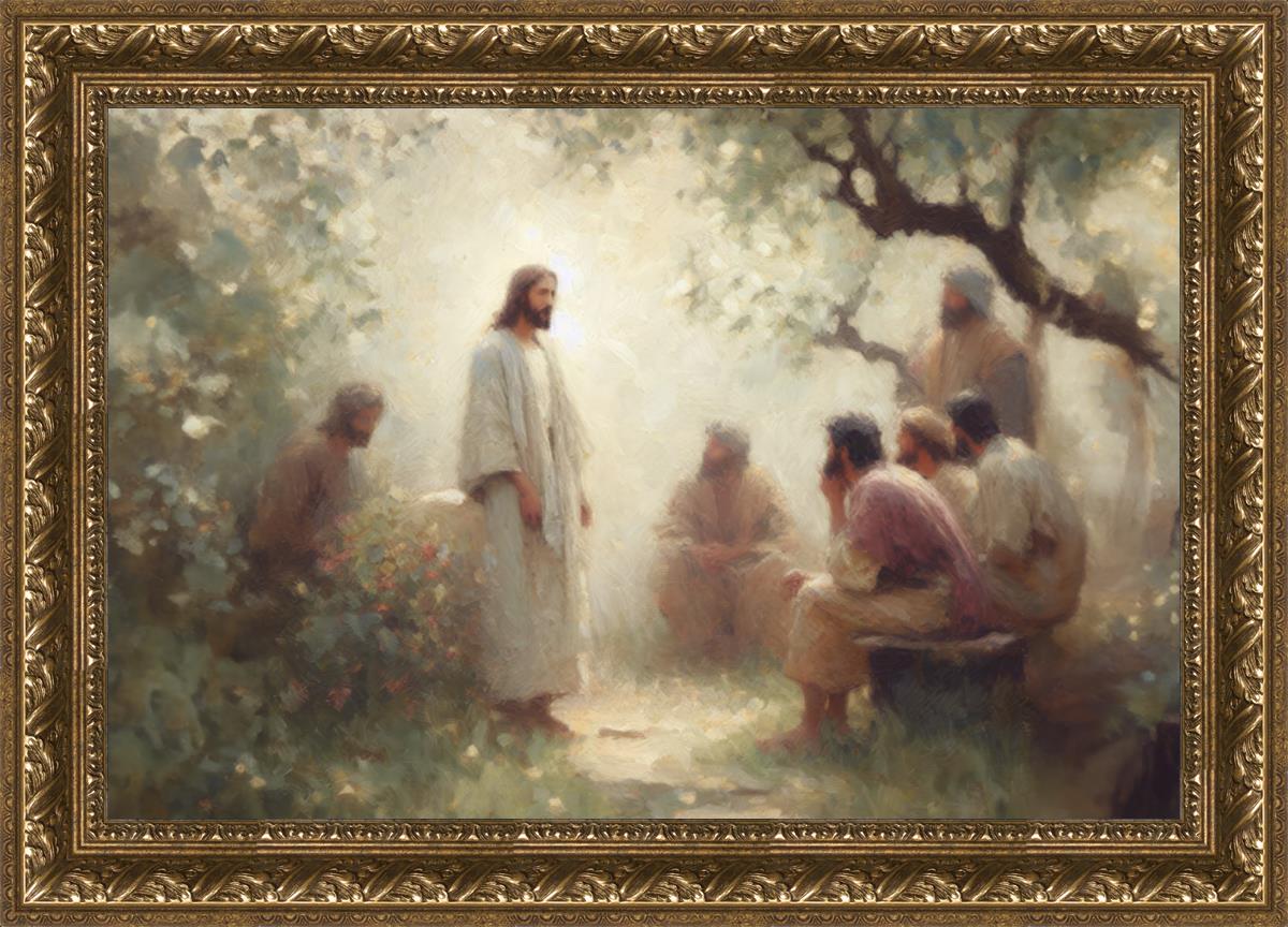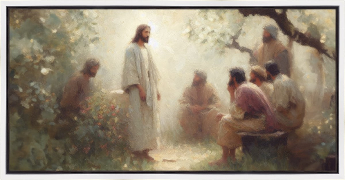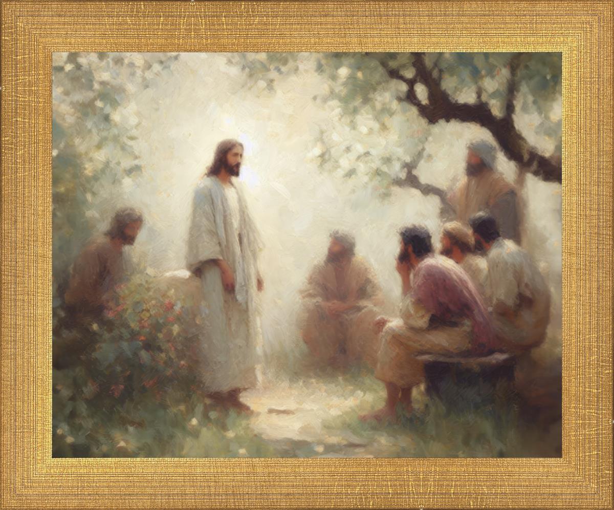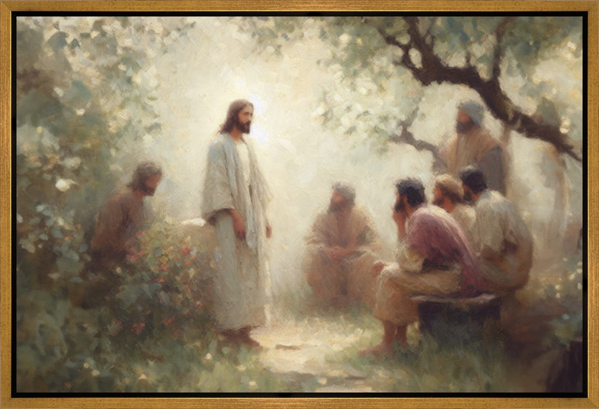 In "Learn of Me," Jesus teaches a small group of individuals in a grove of trees. With calmness, he imparts wisdom to his listeners, embodying Matthew 11:29: "Take my yoke upon you, and learn of me; for I am meek and lowly in heart: and ye shall find rest unto your souls.”