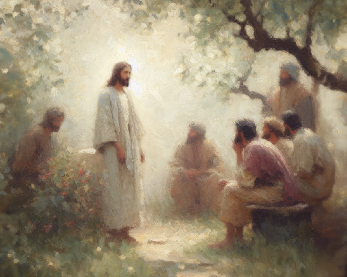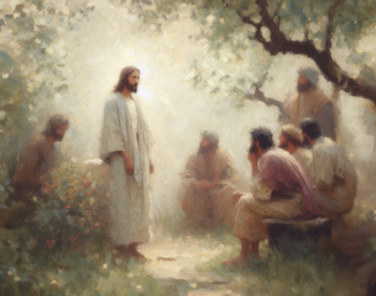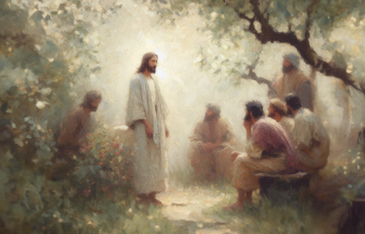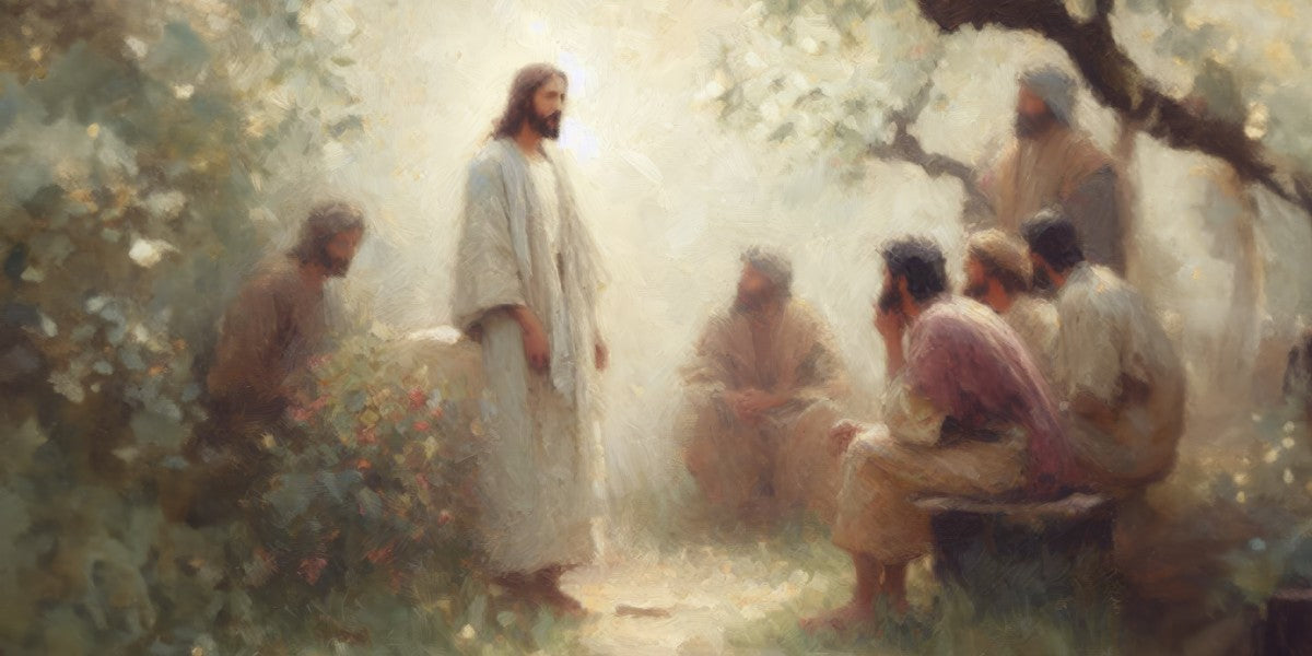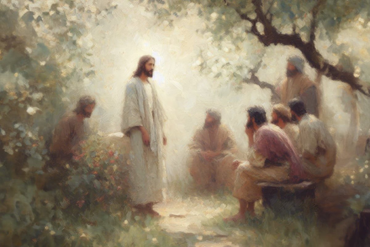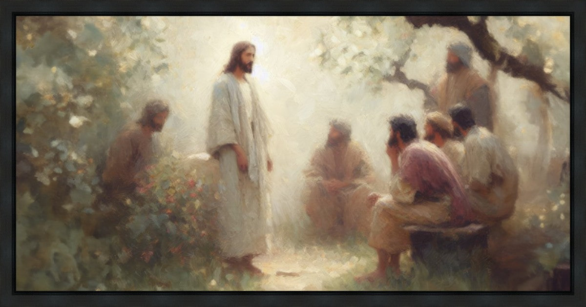 In "Learn of Me," Jesus teaches a small group of individuals in a grove of trees. With calmness, he imparts wisdom to his listeners, embodying Matthew 11:29: "Take my yoke upon you, and learn of me; for I am meek and lowly in heart: and ye shall find rest unto your souls.”