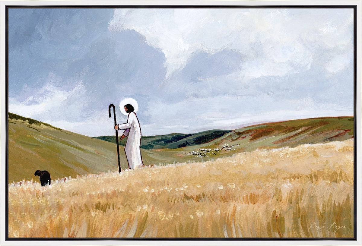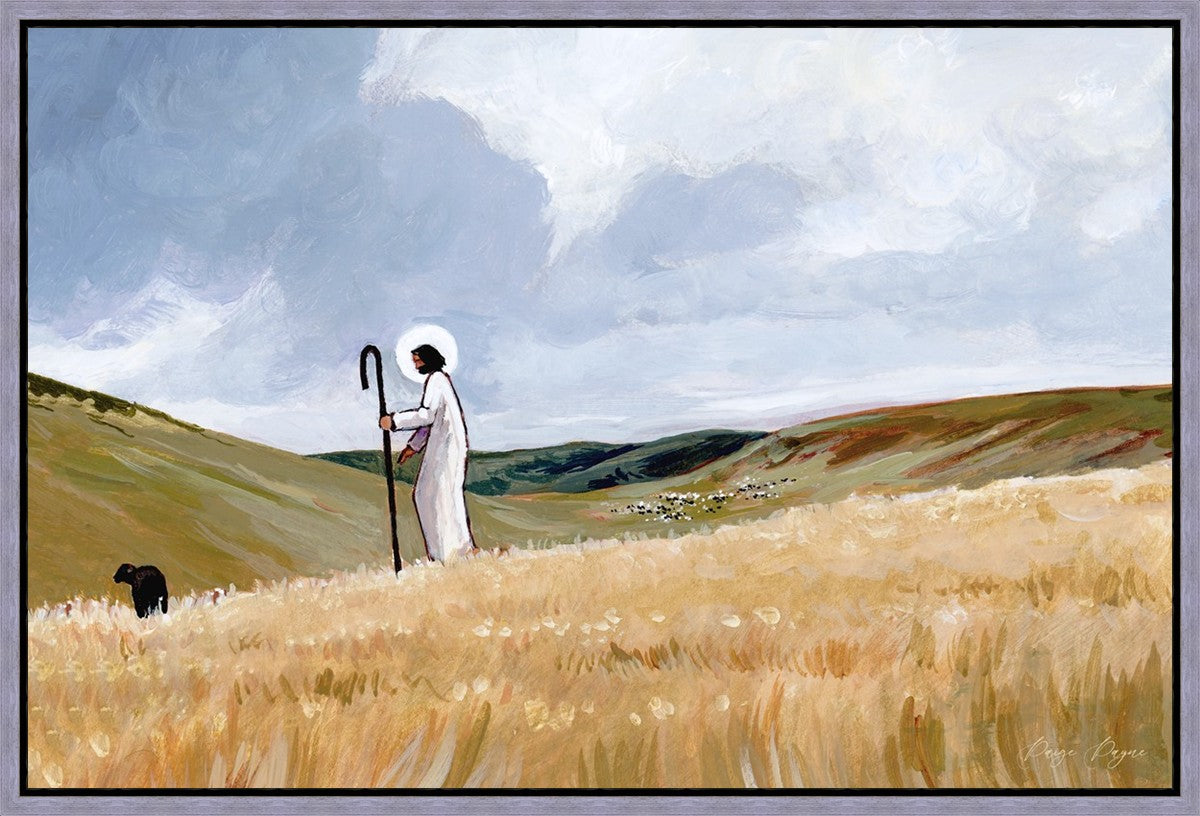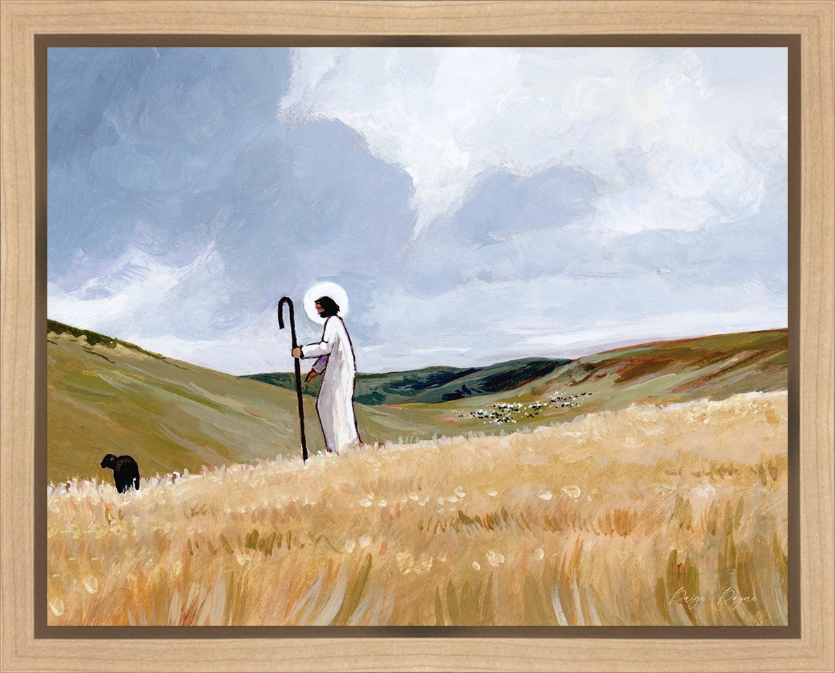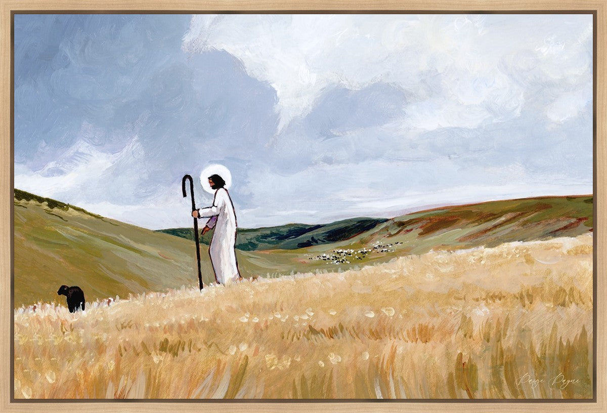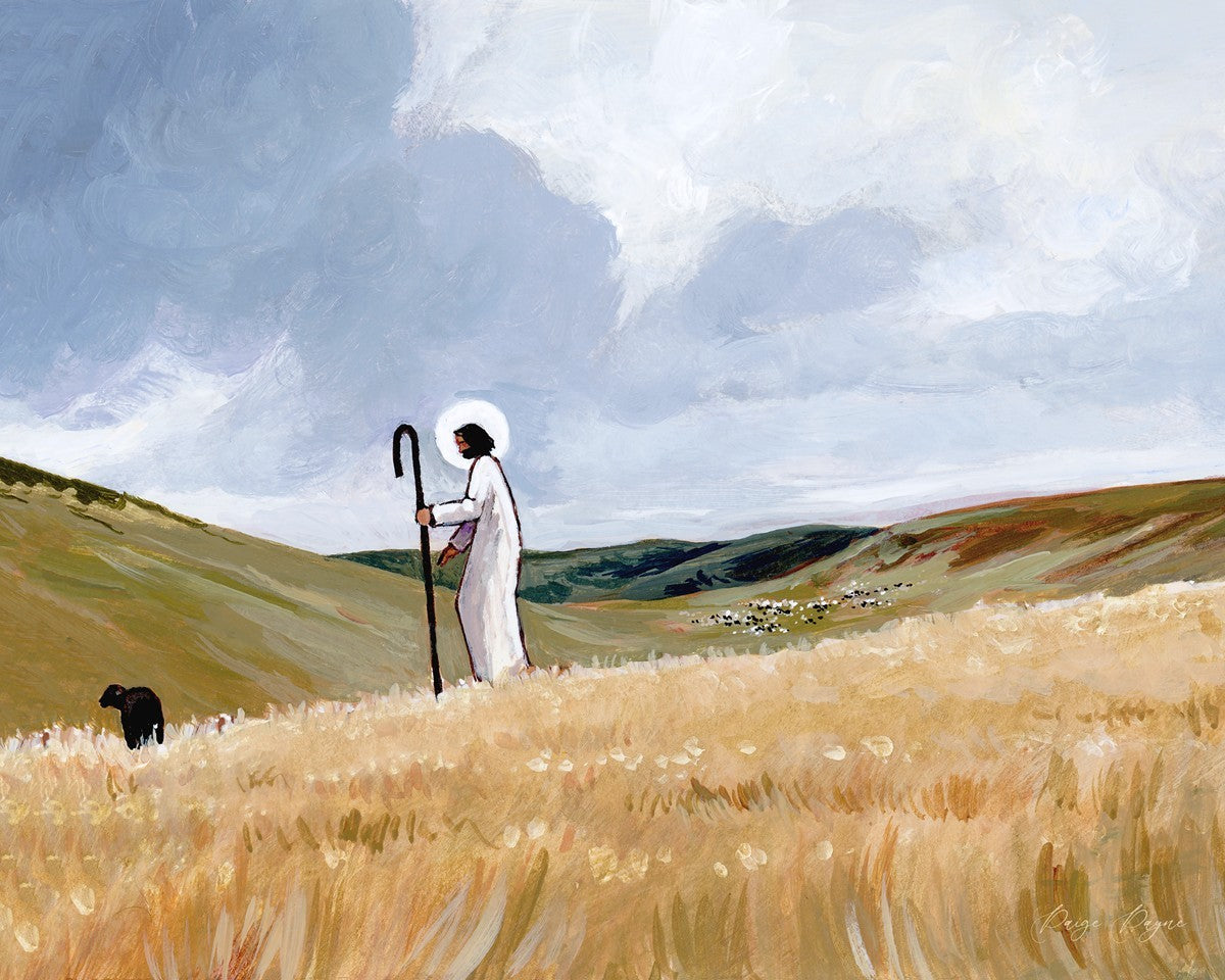 If you look closely at this piece, you can see the herd of sheep very far in the distance of this painting. When I see that, I am reminded of how far He travels to find me. How many mountains and valleys and streams He has to pass through to be reunited with me. And He does it over and over again. He does it for me, and He does it for you. He will always leave the ninety and nine, and go into the mountains to find the one