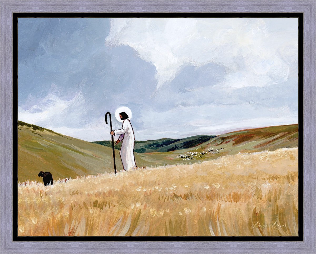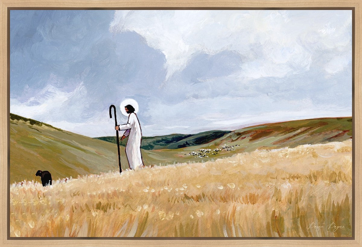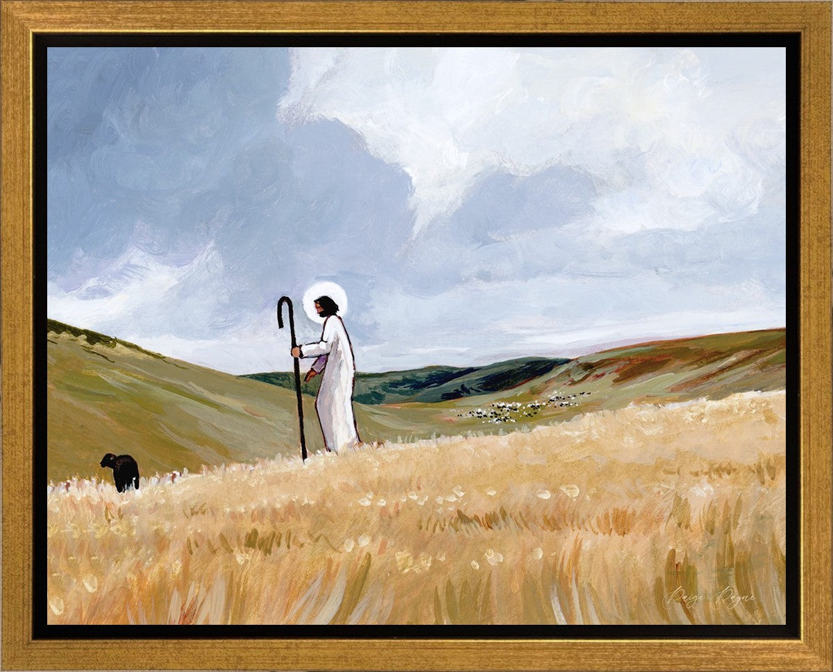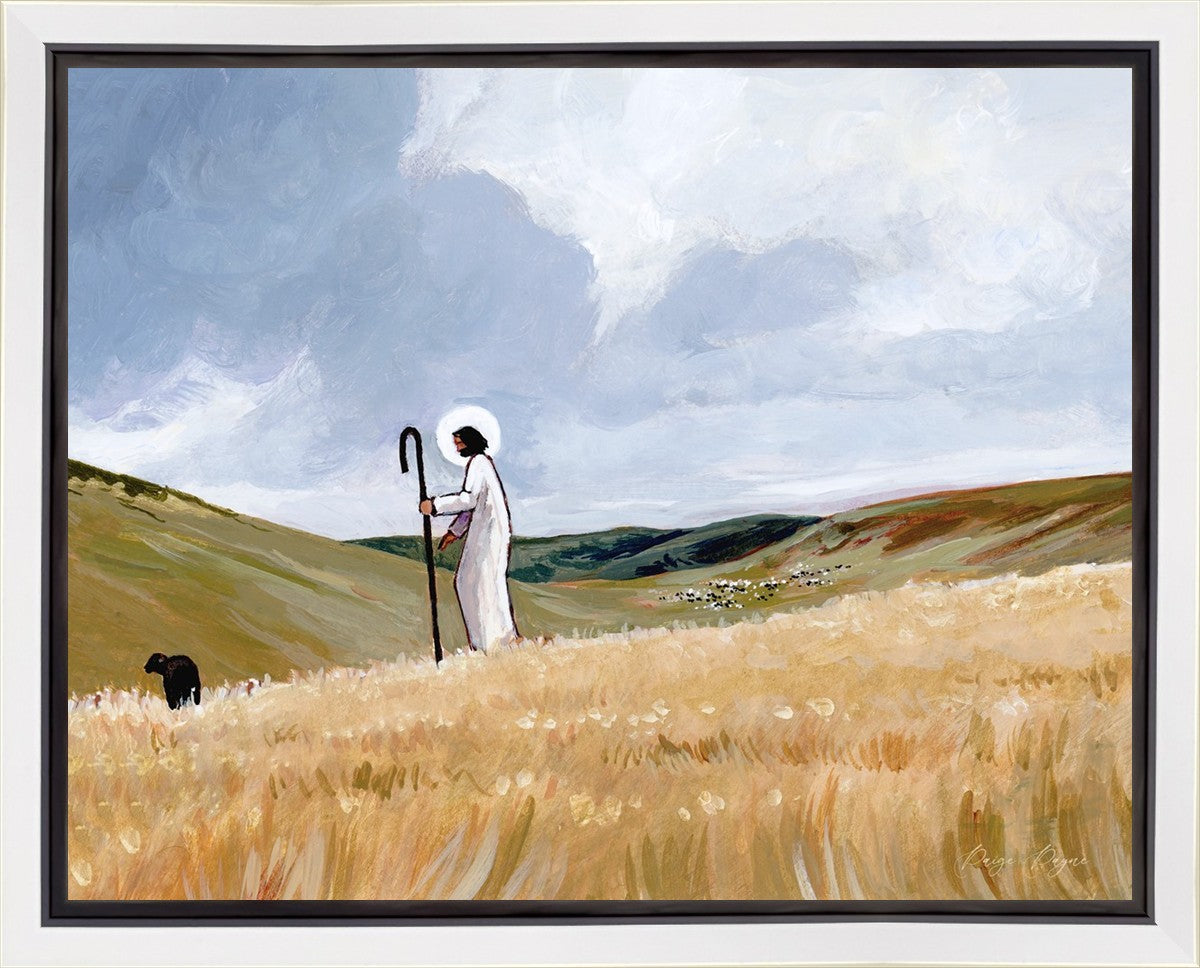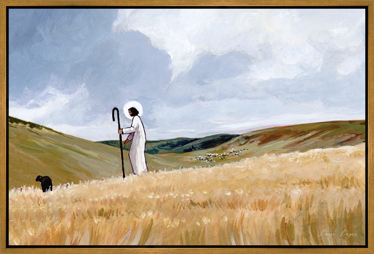 If you look closely at this piece, you can see the herd of sheep very far in the distance of this painting. When I see that, I am reminded of how far He travels to find me. How many mountains and valleys and streams He has to pass through to be reunited with me. And He does it over and over again. He does it for me, and He does it for you. He will always leave the ninety and nine, and go into the mountains to find the one