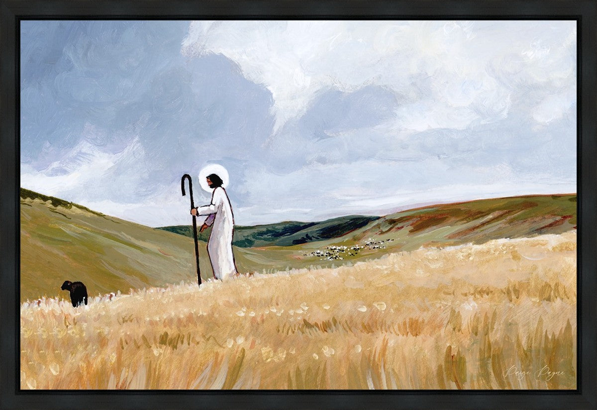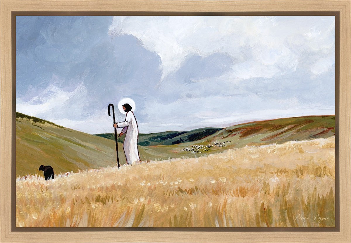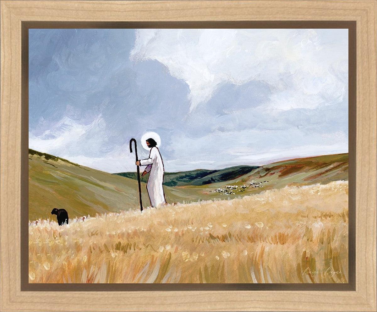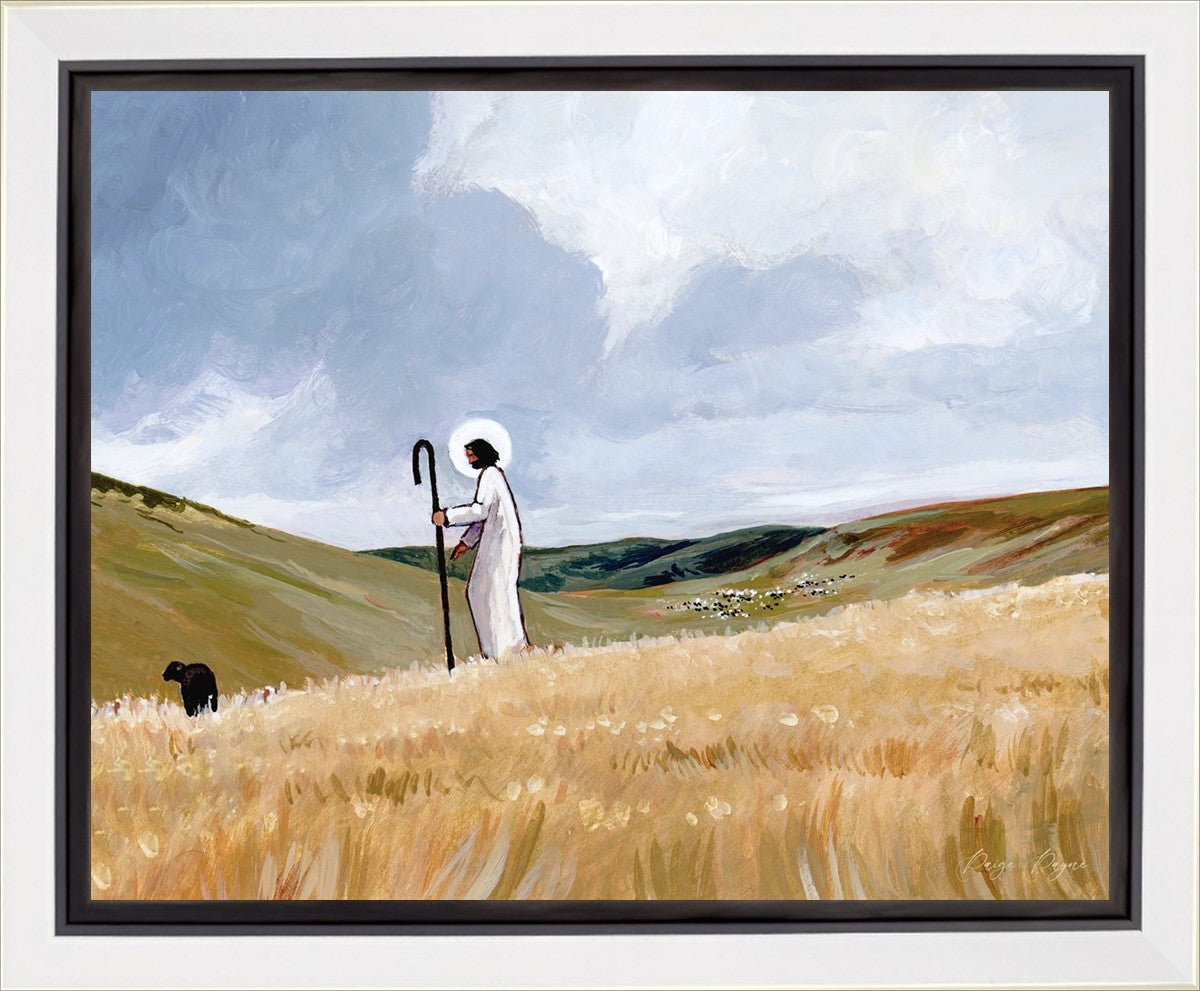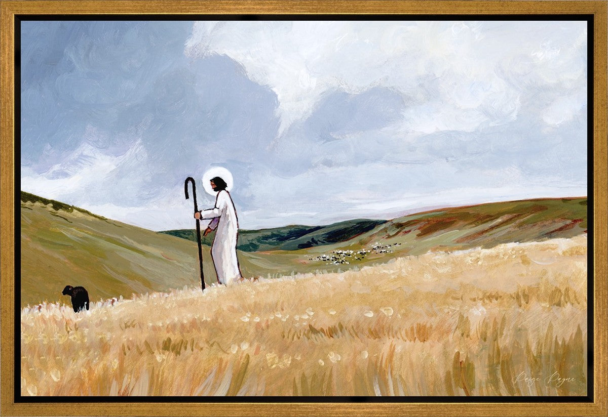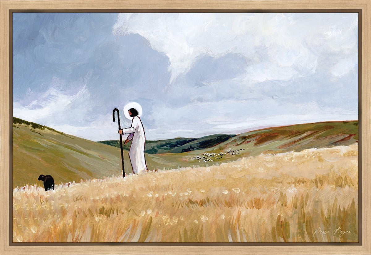 If you look closely at this piece, you can see the herd of sheep very far in the distance of this painting. When I see that, I am reminded of how far He travels to find me. How many mountains and valleys and streams He has to pass through to be reunited with me. And He does it over and over again. He does it for me, and He does it for you. He will always leave the ninety and nine, and go into the mountains to find the one