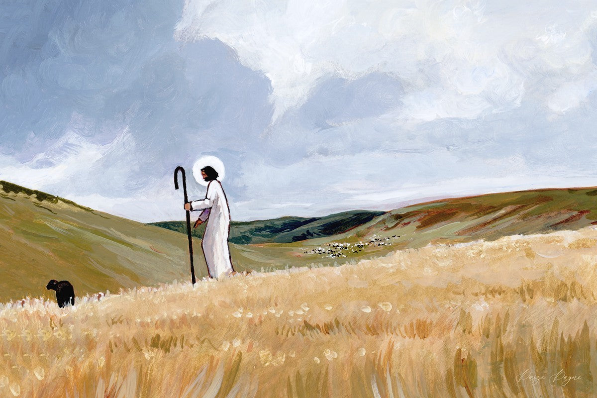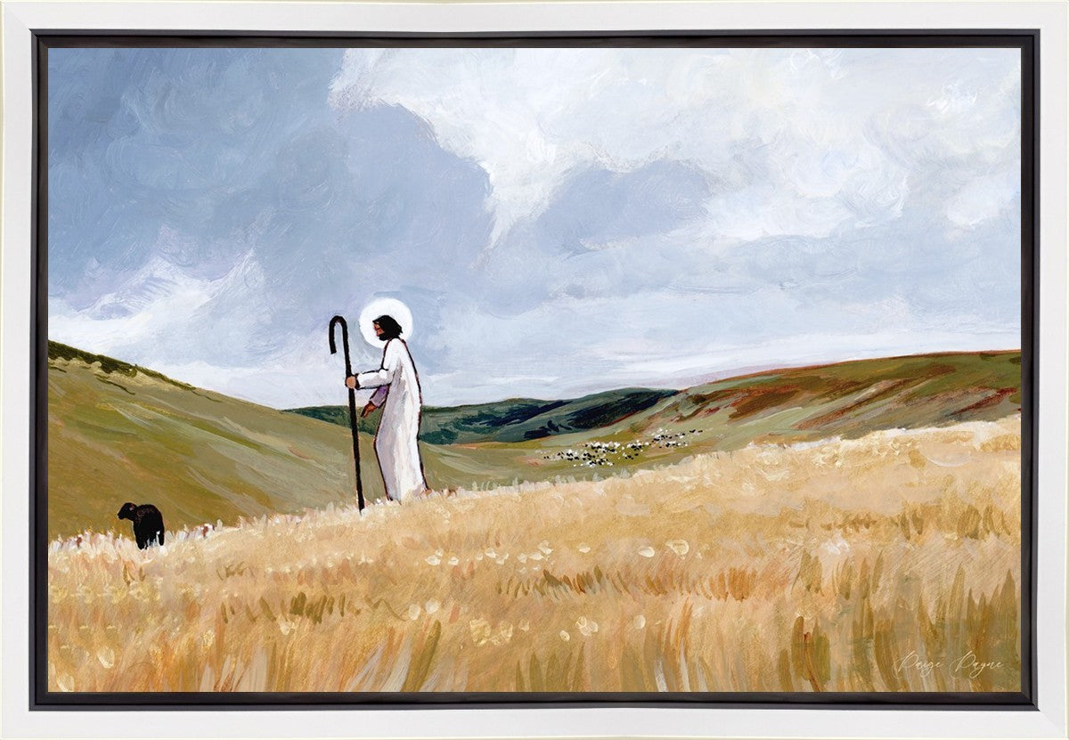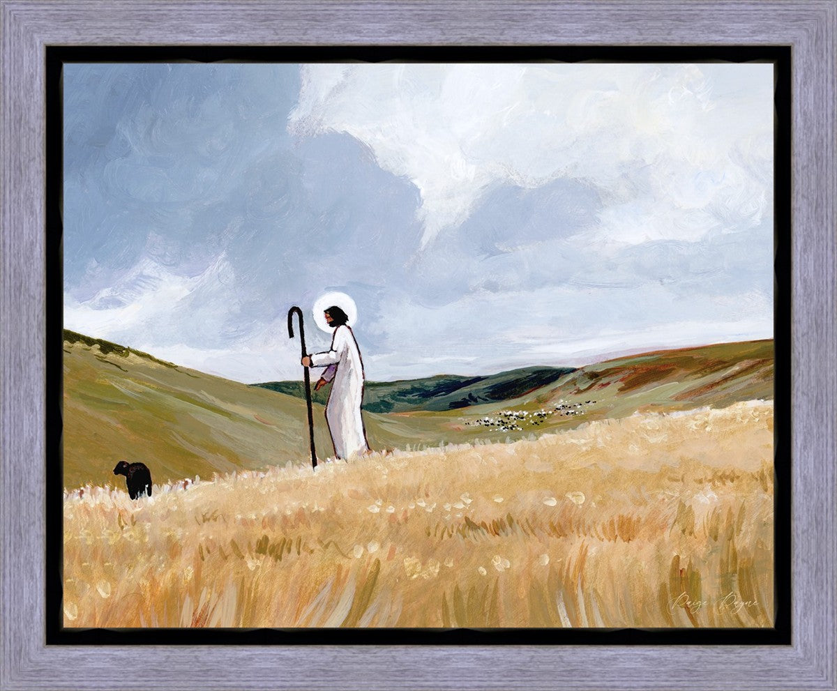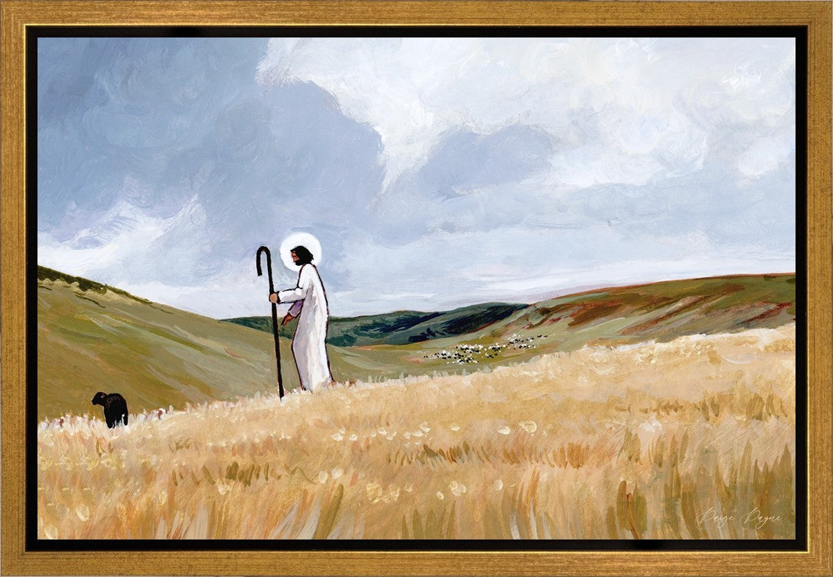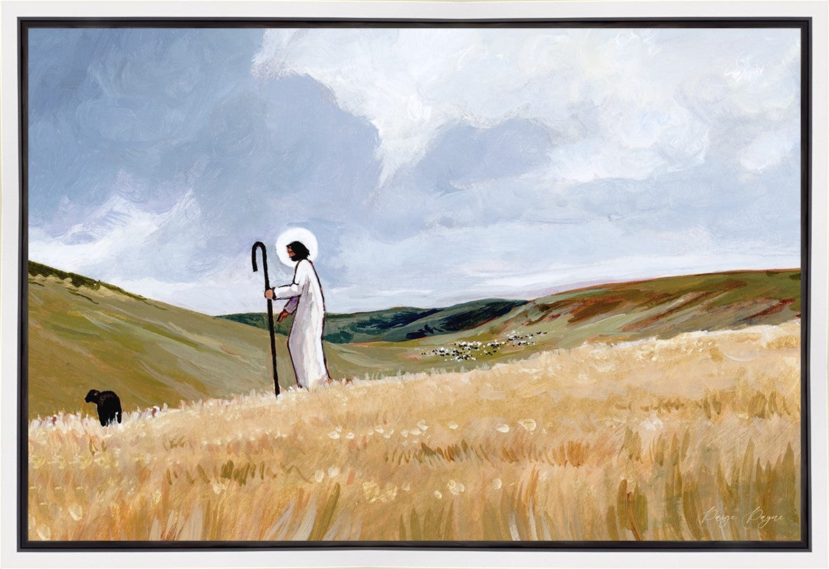 If you look closely at this piece, you can see the herd of sheep very far in the distance of this painting. When I see that, I am reminded of how far He travels to find me. How many mountains and valleys and streams He has to pass through to be reunited with me. And He does it over and over again. He does it for me, and He does it for you. He will always leave the ninety and nine, and go into the mountains to find the one