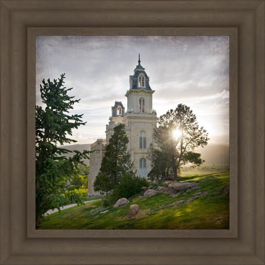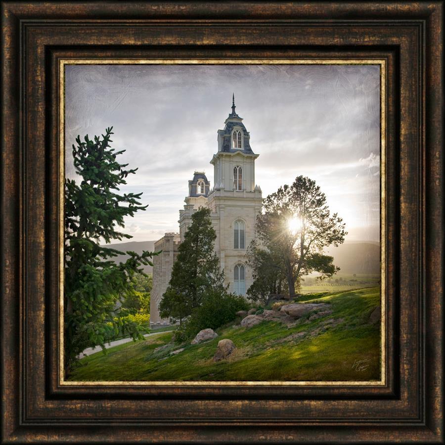 Since 1999 Landon has worked as an artisan in nearly 40 temples doing the decorative paint and gold leaf. He continues to do so as well as wood repair and graining. He was married in 2001 to Jacey Thomas in the Manti Utah temple. When she couldn’t find an image of the temple that she liked enough to purchase for their home, he decided to take one himself. That desire to create something original and different inspired his current series of temple art. They are taken from a panoramic viewpoint and stylized with an artistic border that reflect his paintings. All modern structures apart from the temple have been omitted.