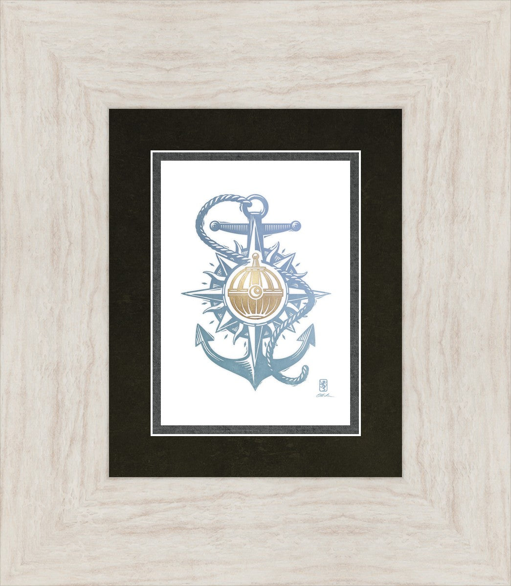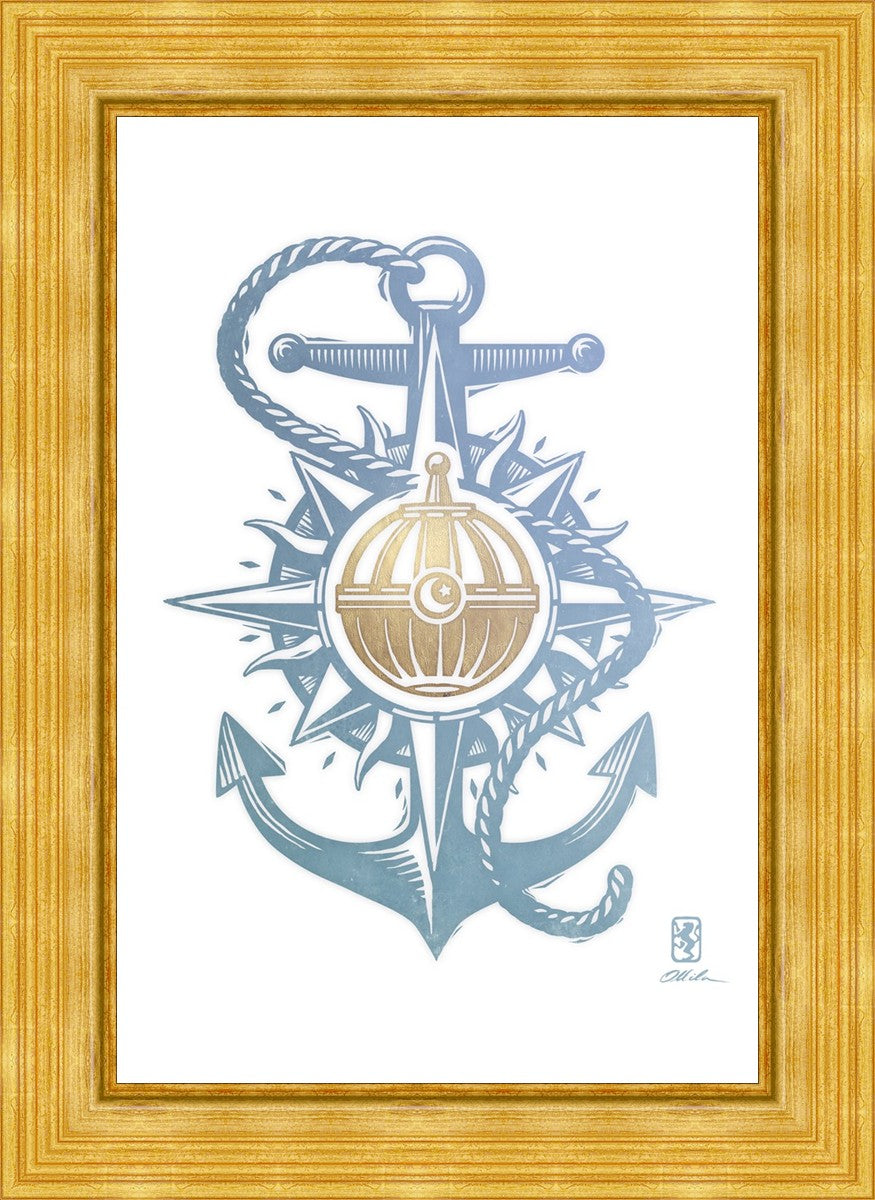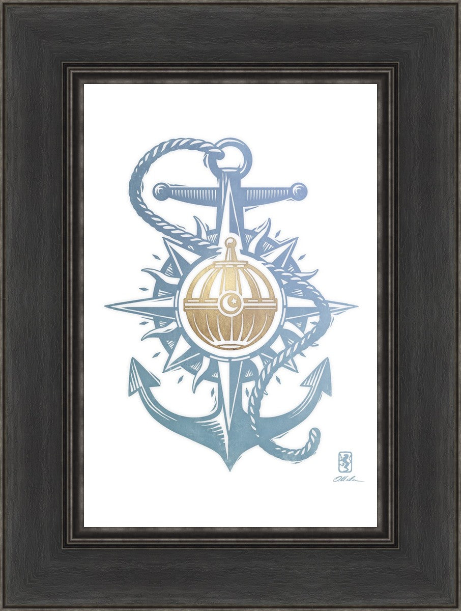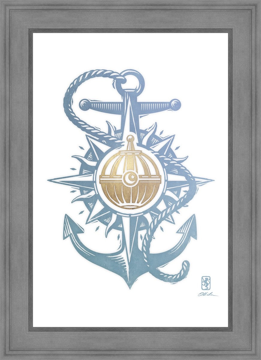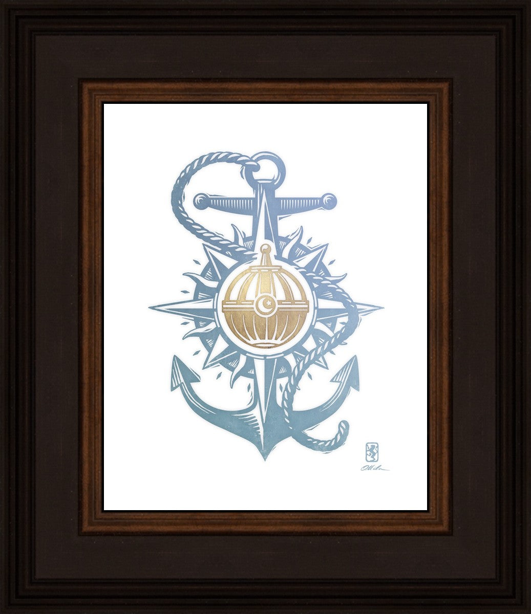 This piece is a hand carved woodcut relief print. The artist was inspired to create this piece by the story of Lehi's journey across the sea. The Liahona represents the word of Christ, which can act as a compass to guide us, and an anchor to which we may hold.
