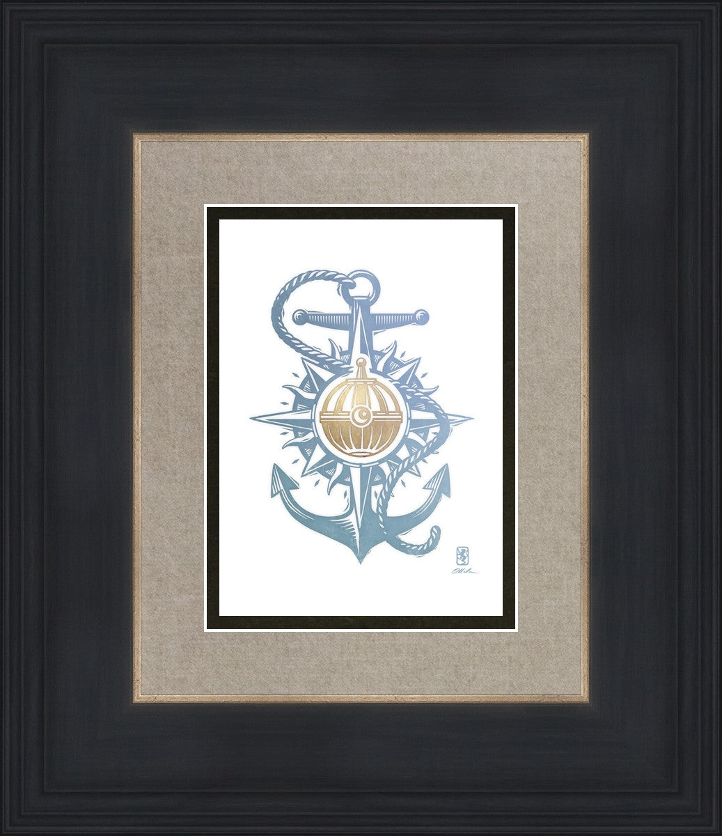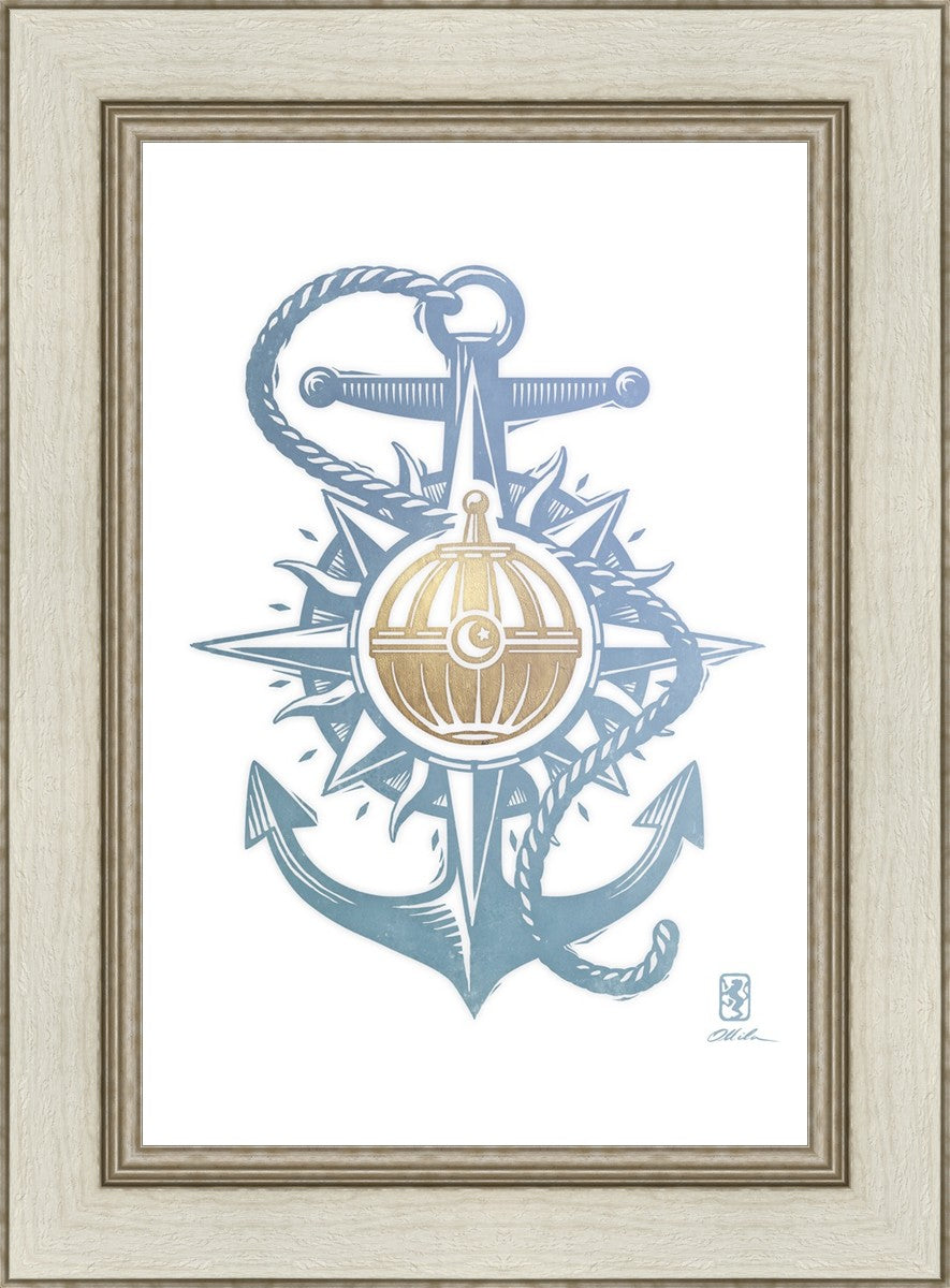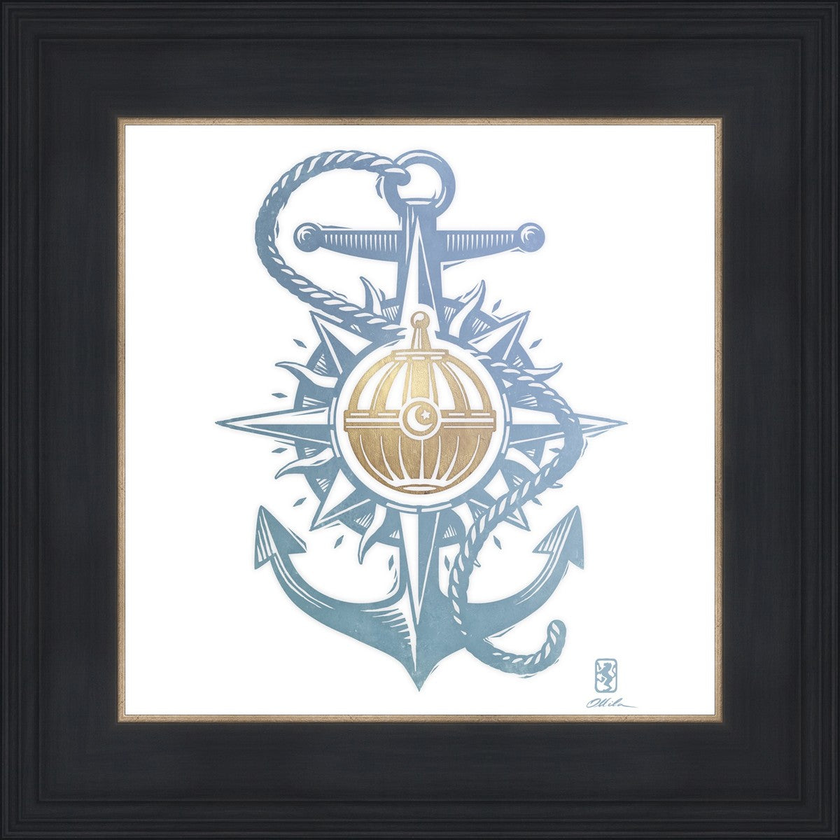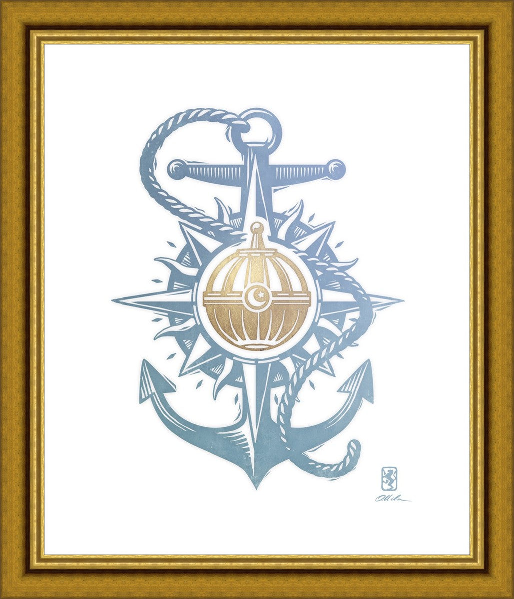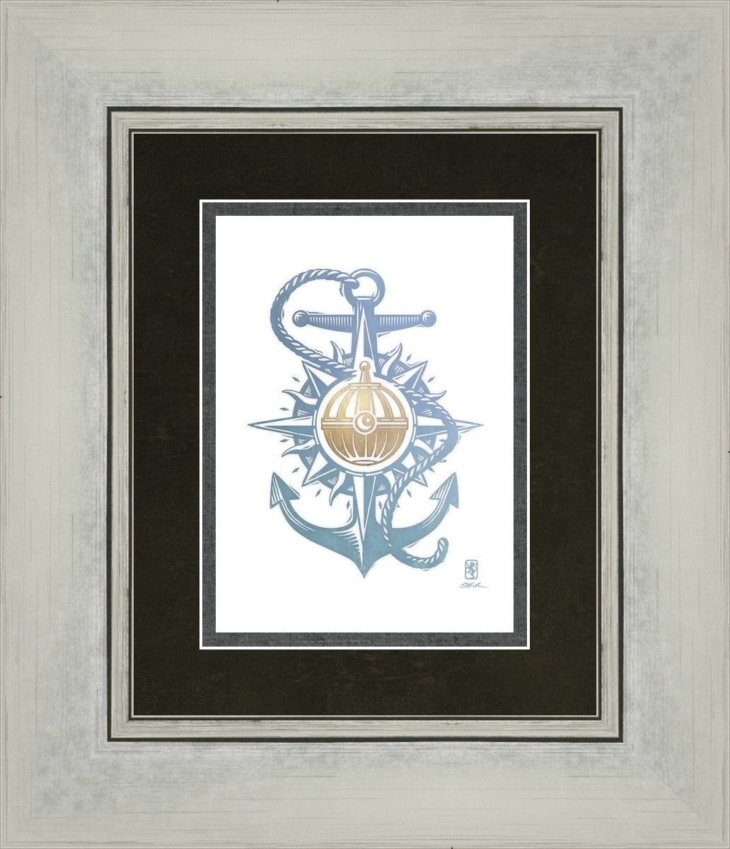 This piece is a hand carved woodcut relief print. The artist was inspired to create this piece by the story of Lehi's journey across the sea. The Liahona represents the word of Christ, which can act as a compass to guide us, and an anchor to which we may hold.