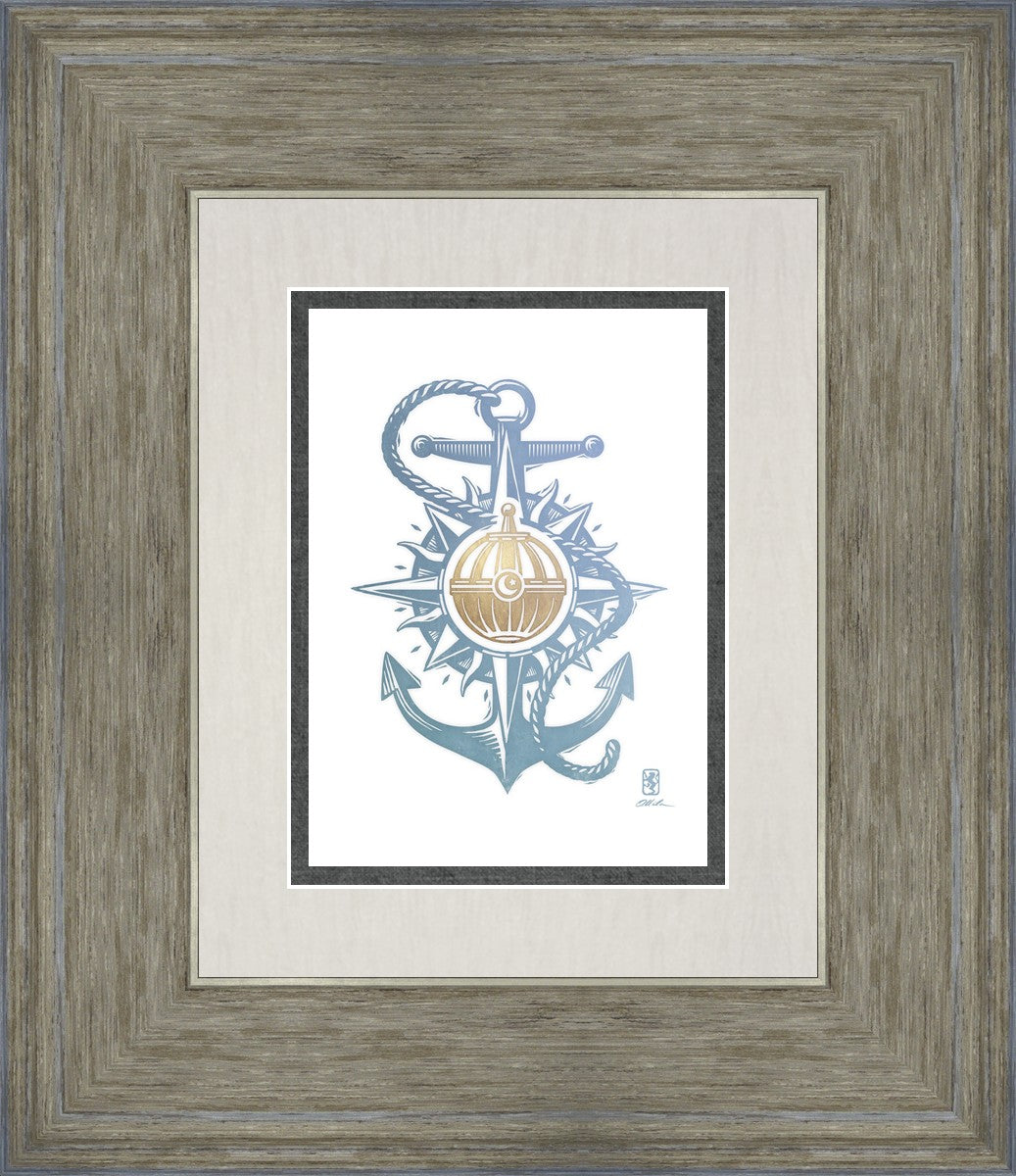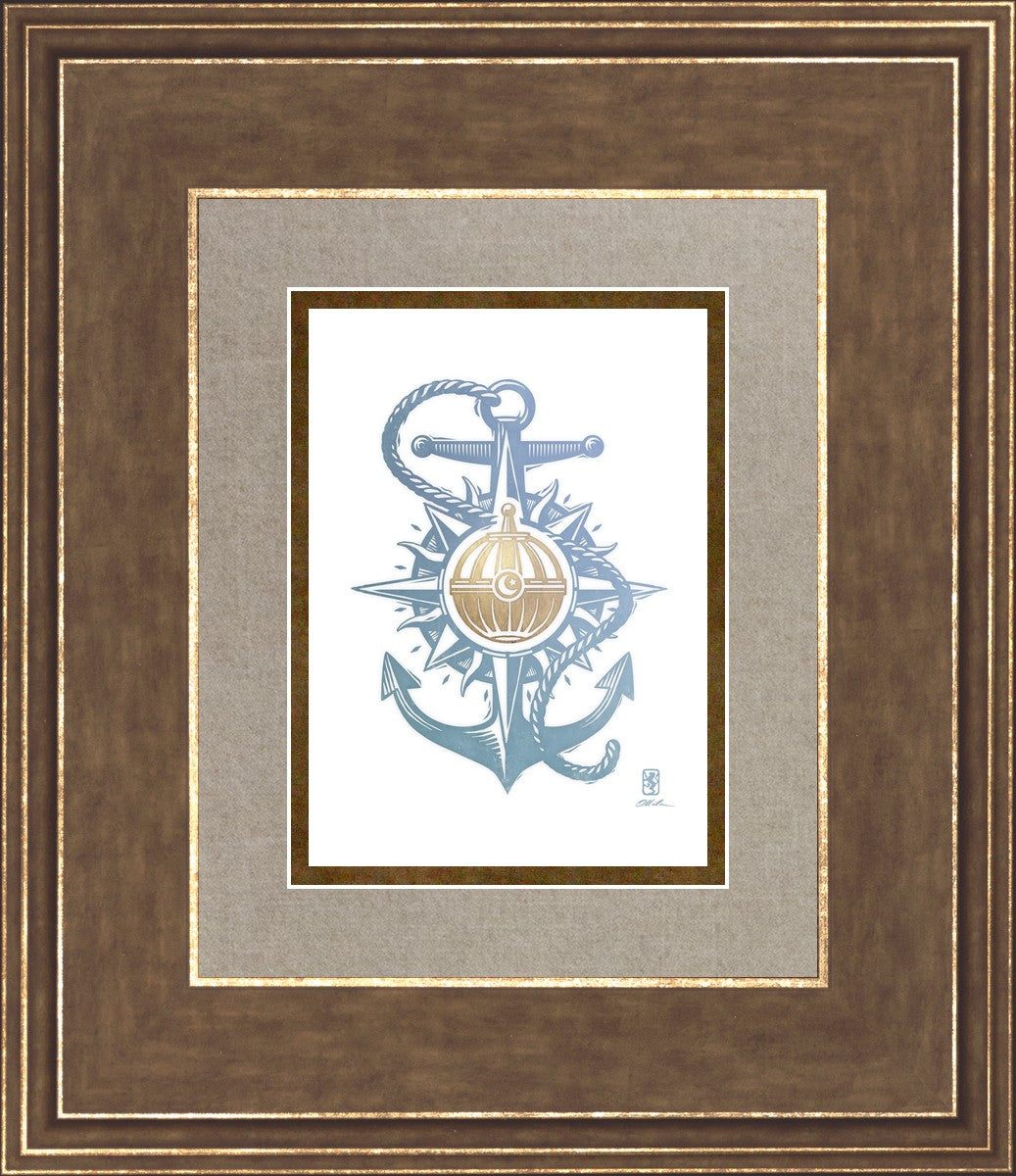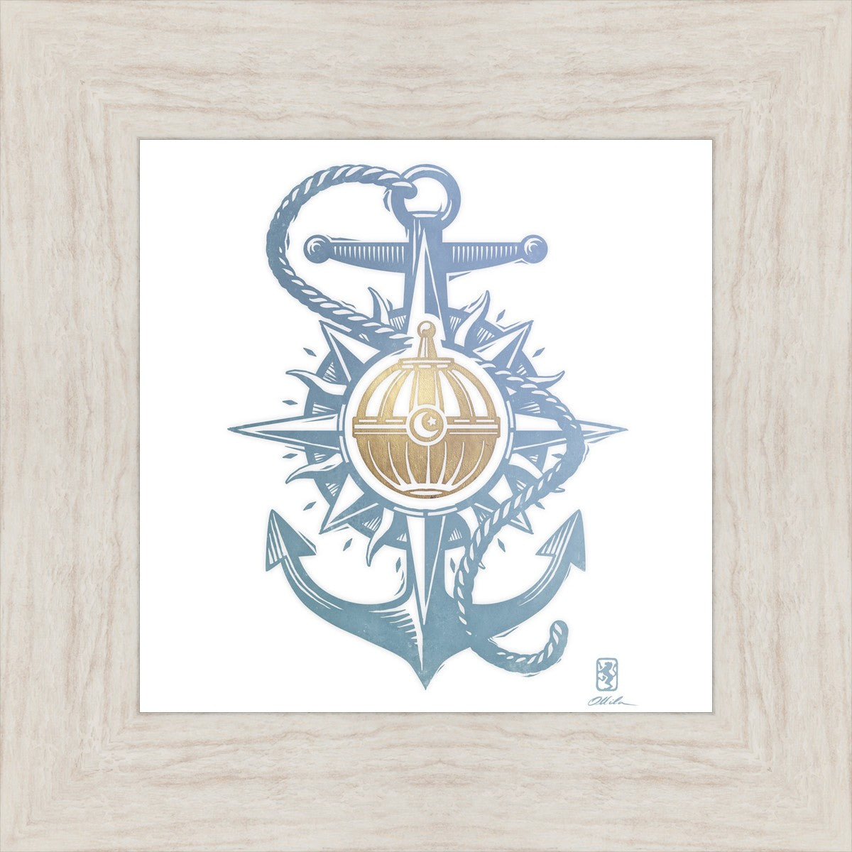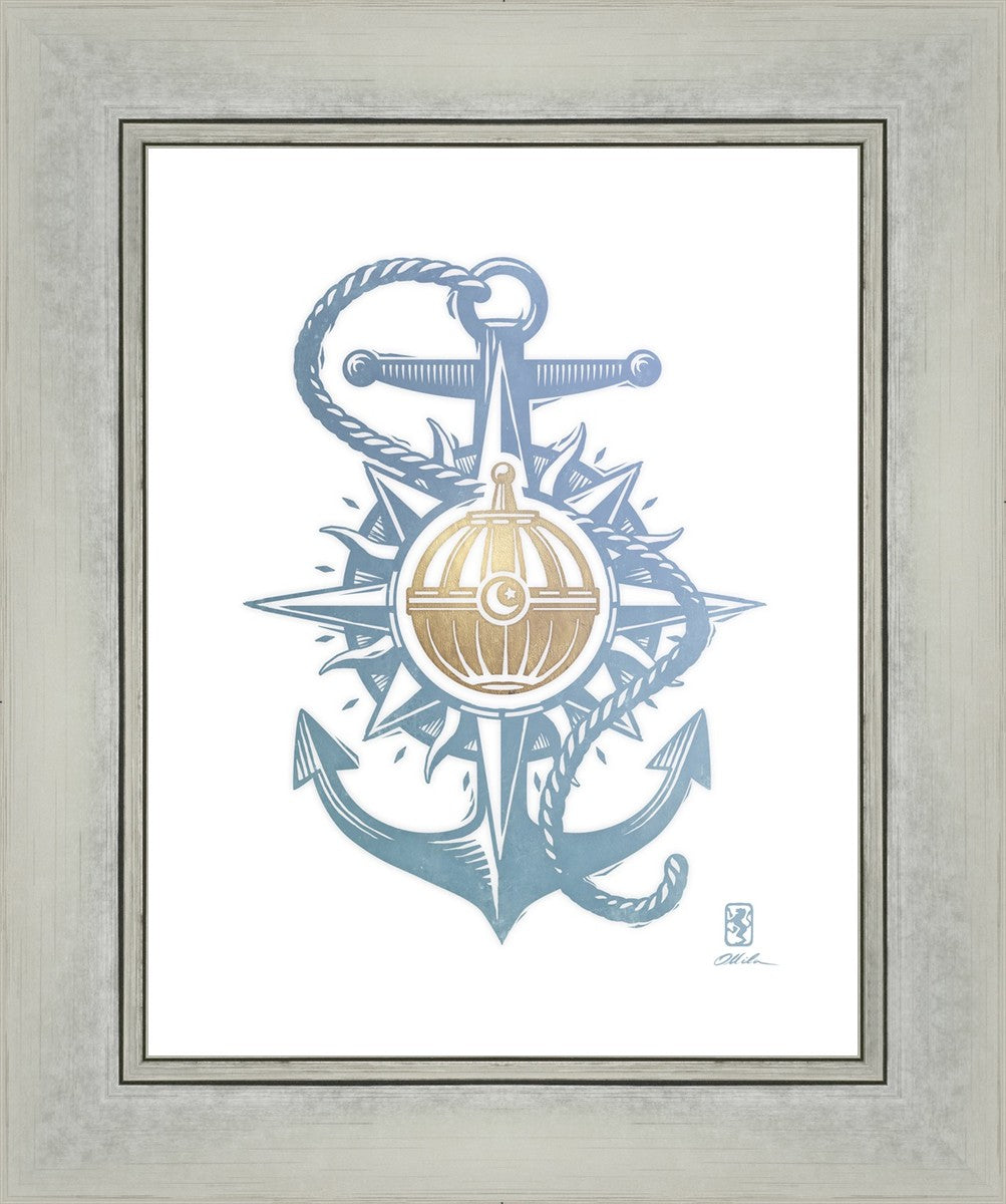 This piece is a hand carved woodcut relief print. The artist was inspired to create this piece by the story of Lehi's journey across the sea. The Liahona represents the word of Christ, which can act as a compass to guide us, and an anchor to which we may hold.