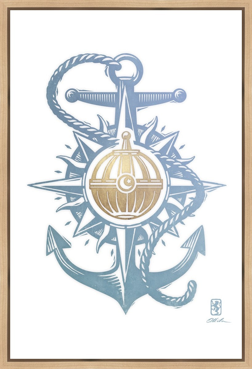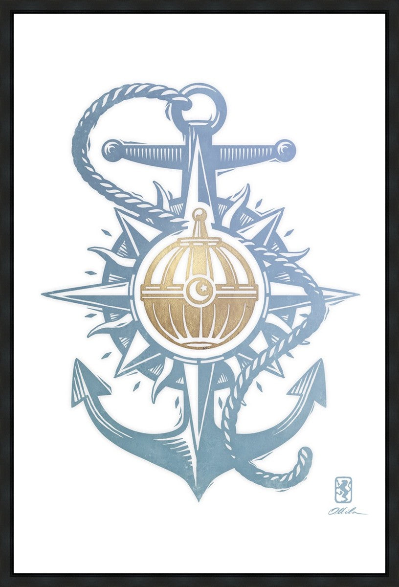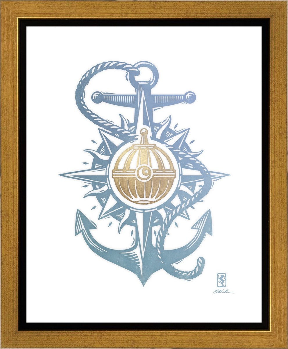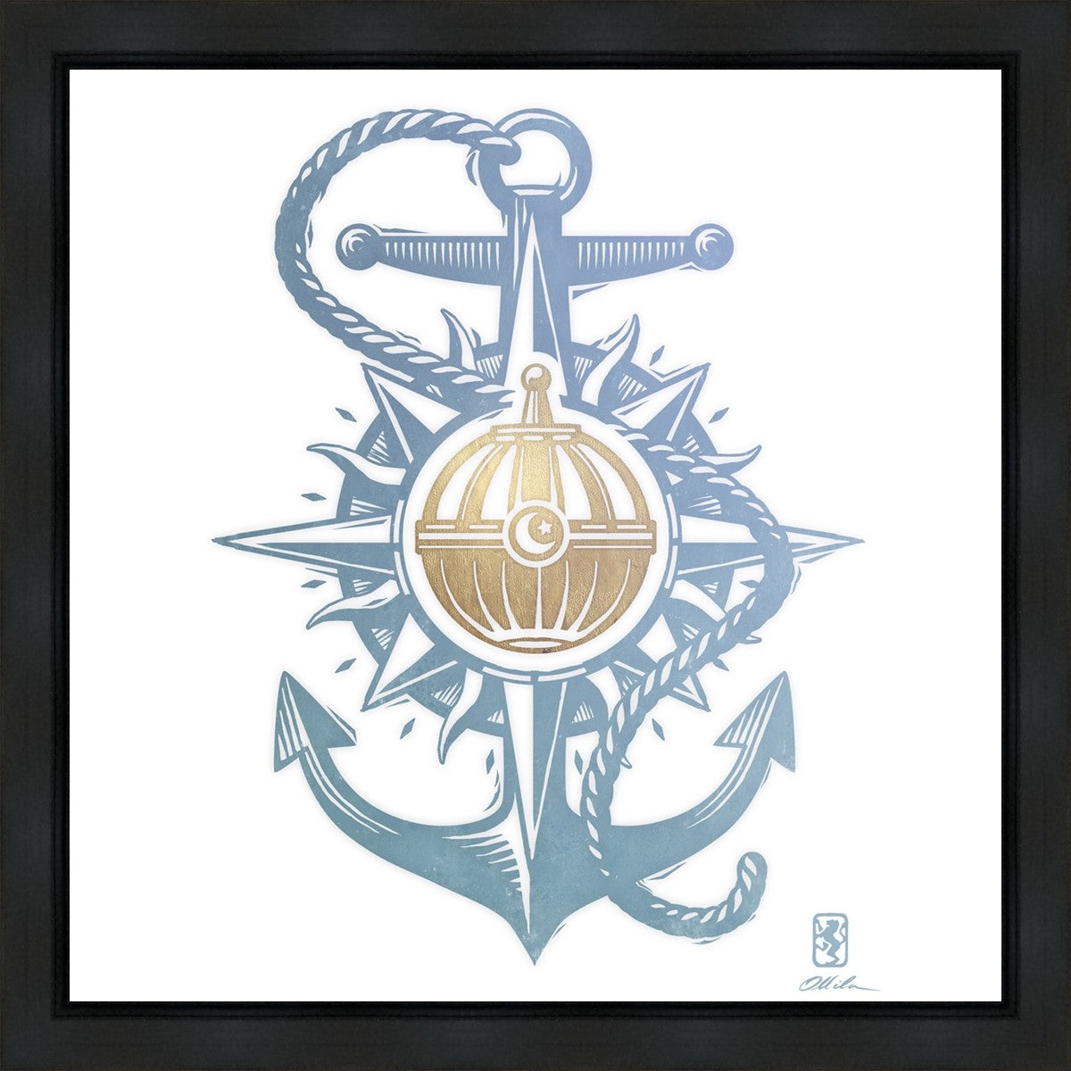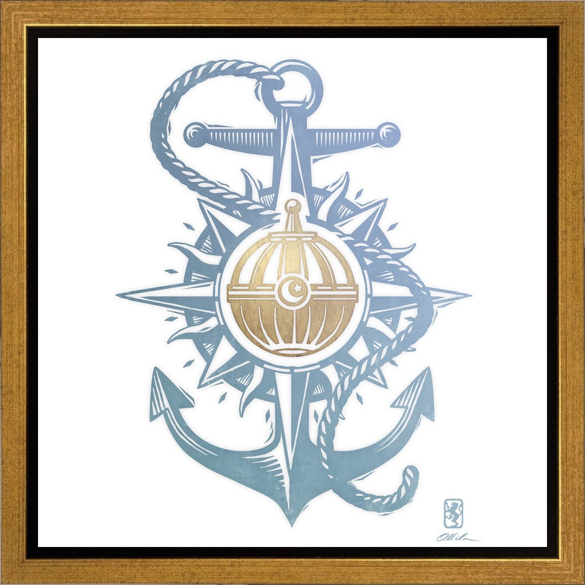 This piece is a hand carved woodcut relief print. The artist was inspired to create this piece by the story of Lehi's journey across the sea. The Liahona represents the word of Christ, which can act as a compass to guide us, and an anchor to which we may hold.