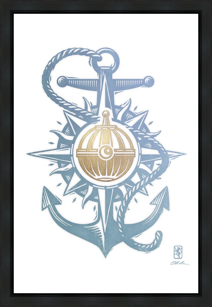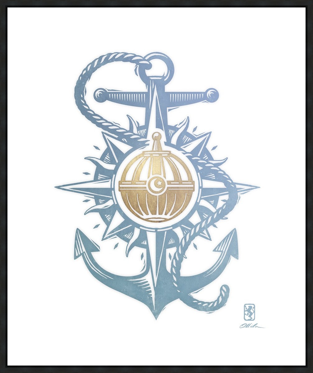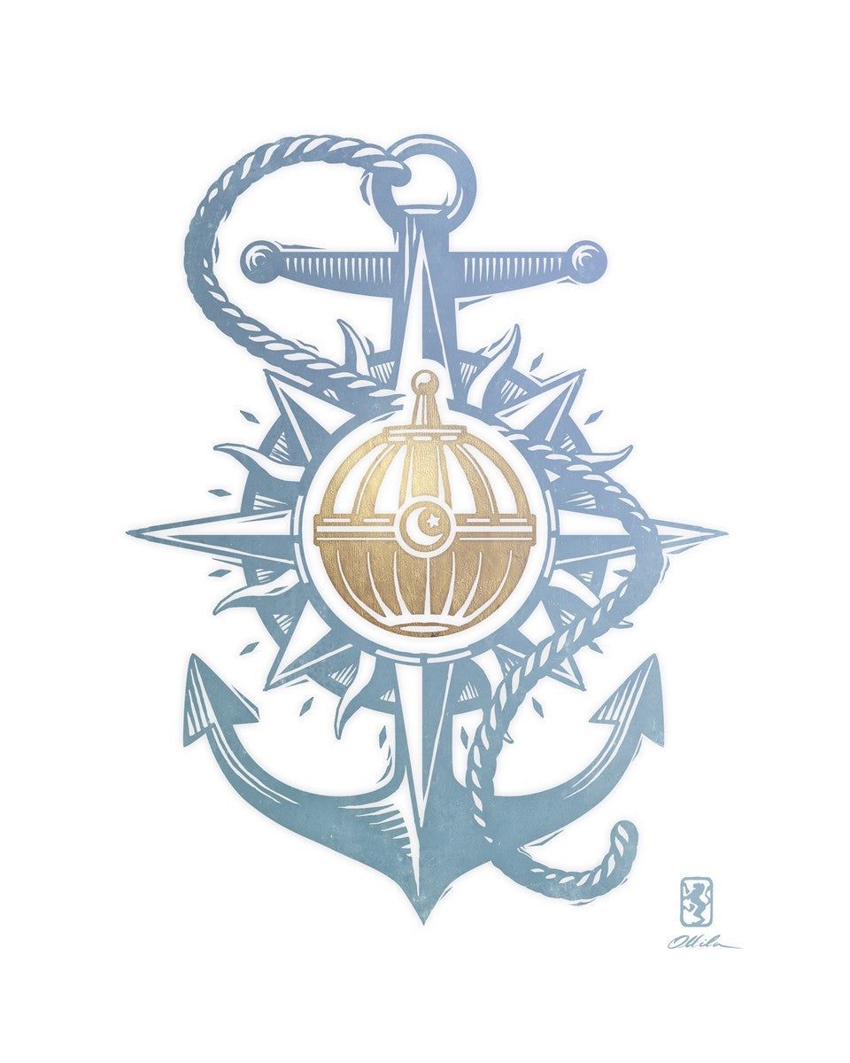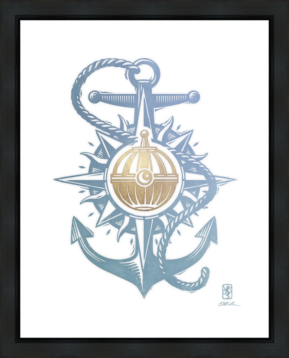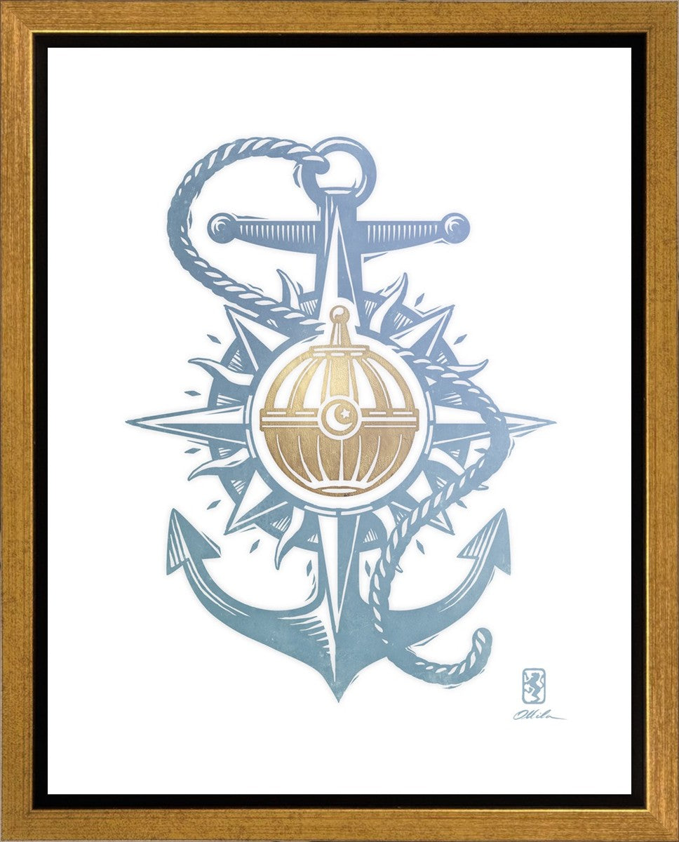 This piece is a hand carved woodcut relief print. The artist was inspired to create this piece by the story of Lehi's journey across the sea. The Liahona represents the word of Christ, which can act as a compass to guide us, and an anchor to which we may hold.