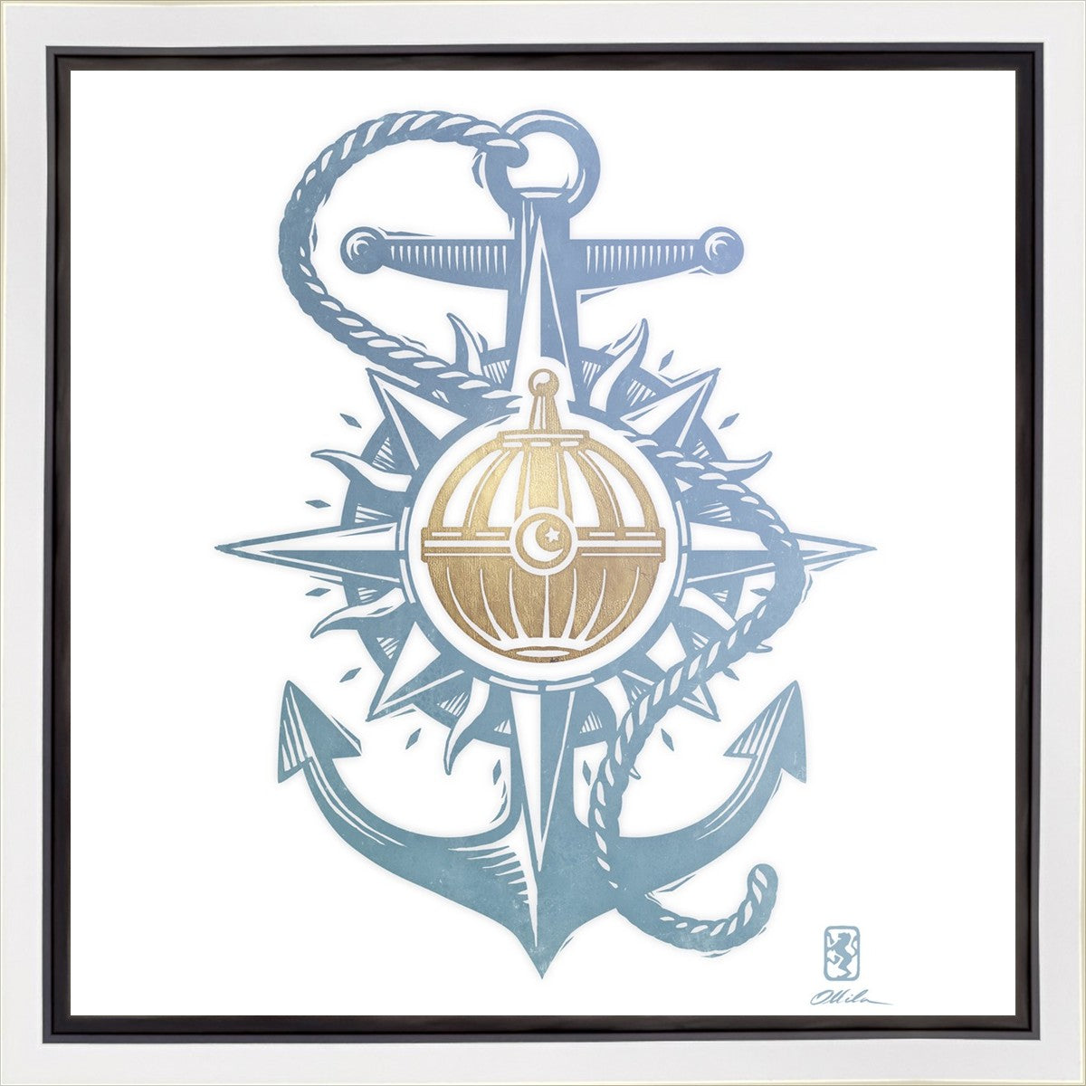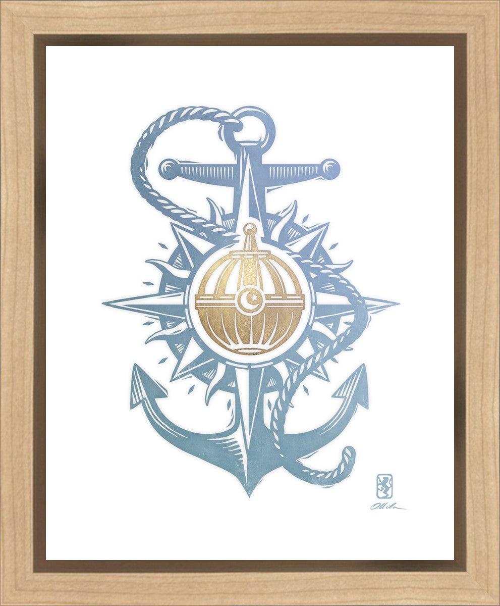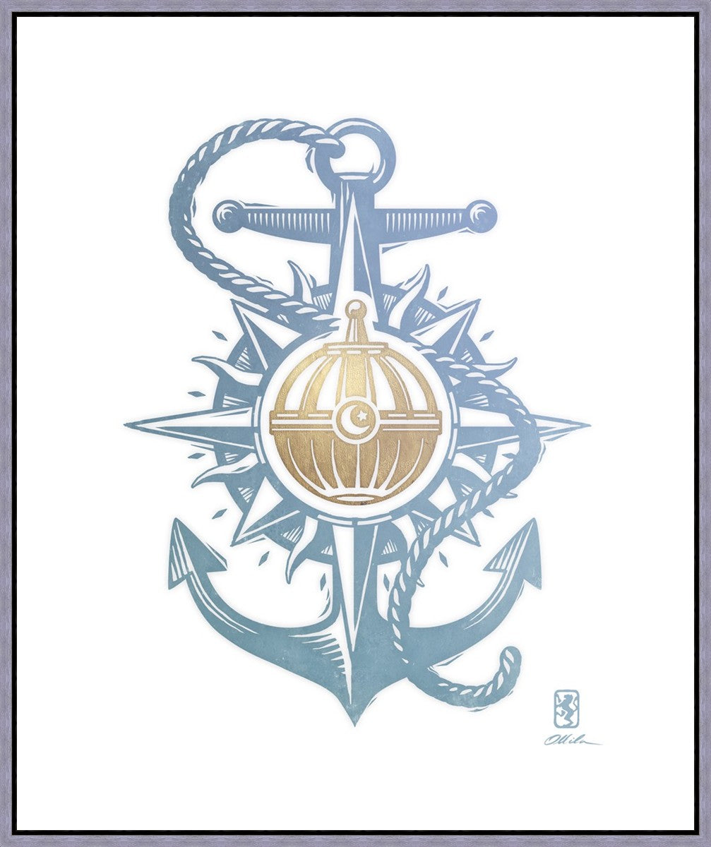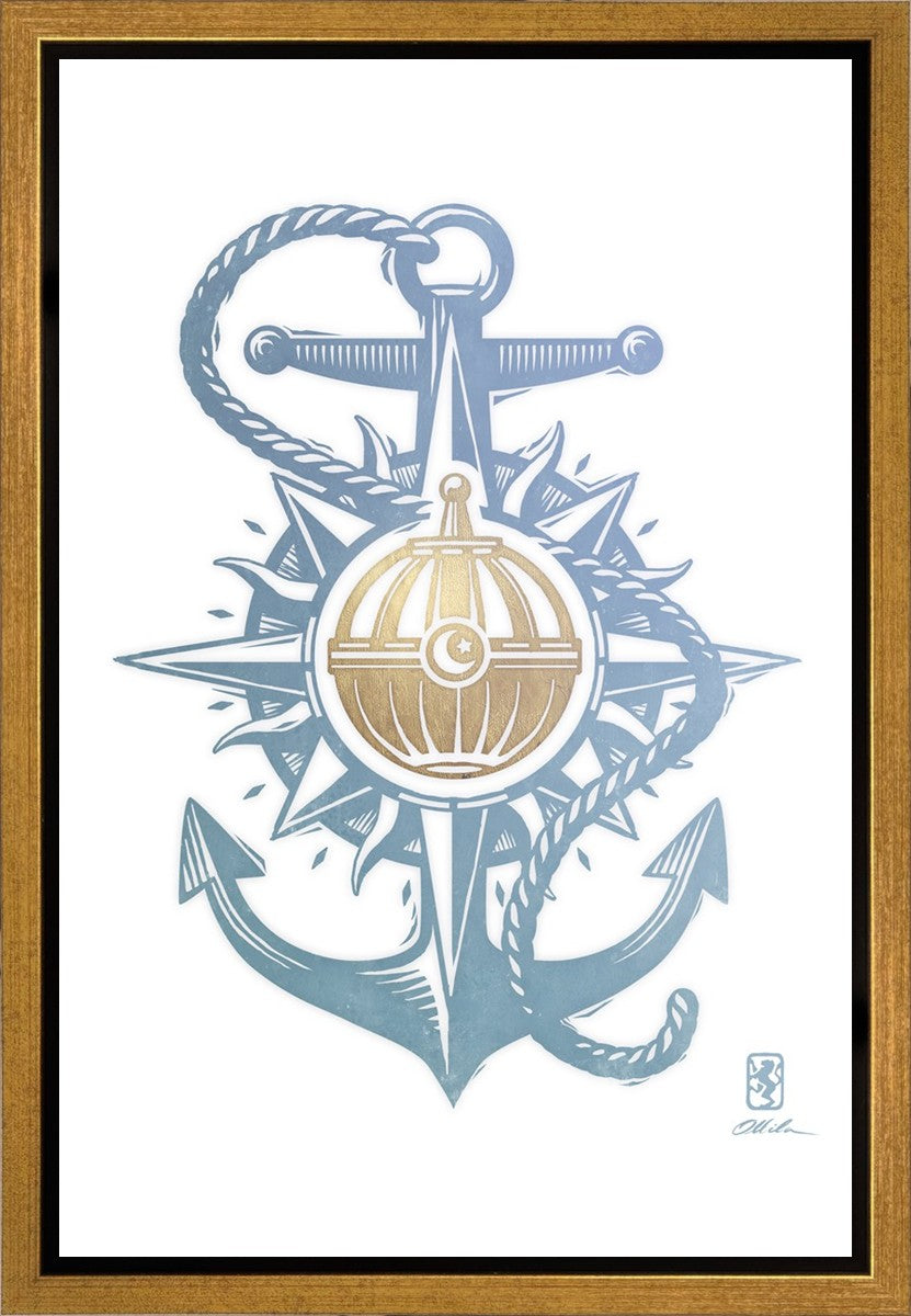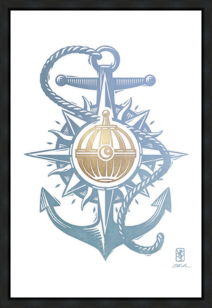 This piece is a hand carved woodcut relief print. The artist was inspired to create this piece by the story of Lehi's journey across the sea. The Liahona represents the word of Christ, which can act as a compass to guide us, and an anchor to which we may hold.