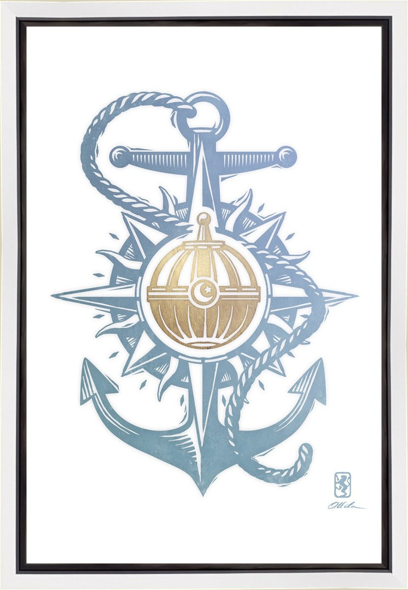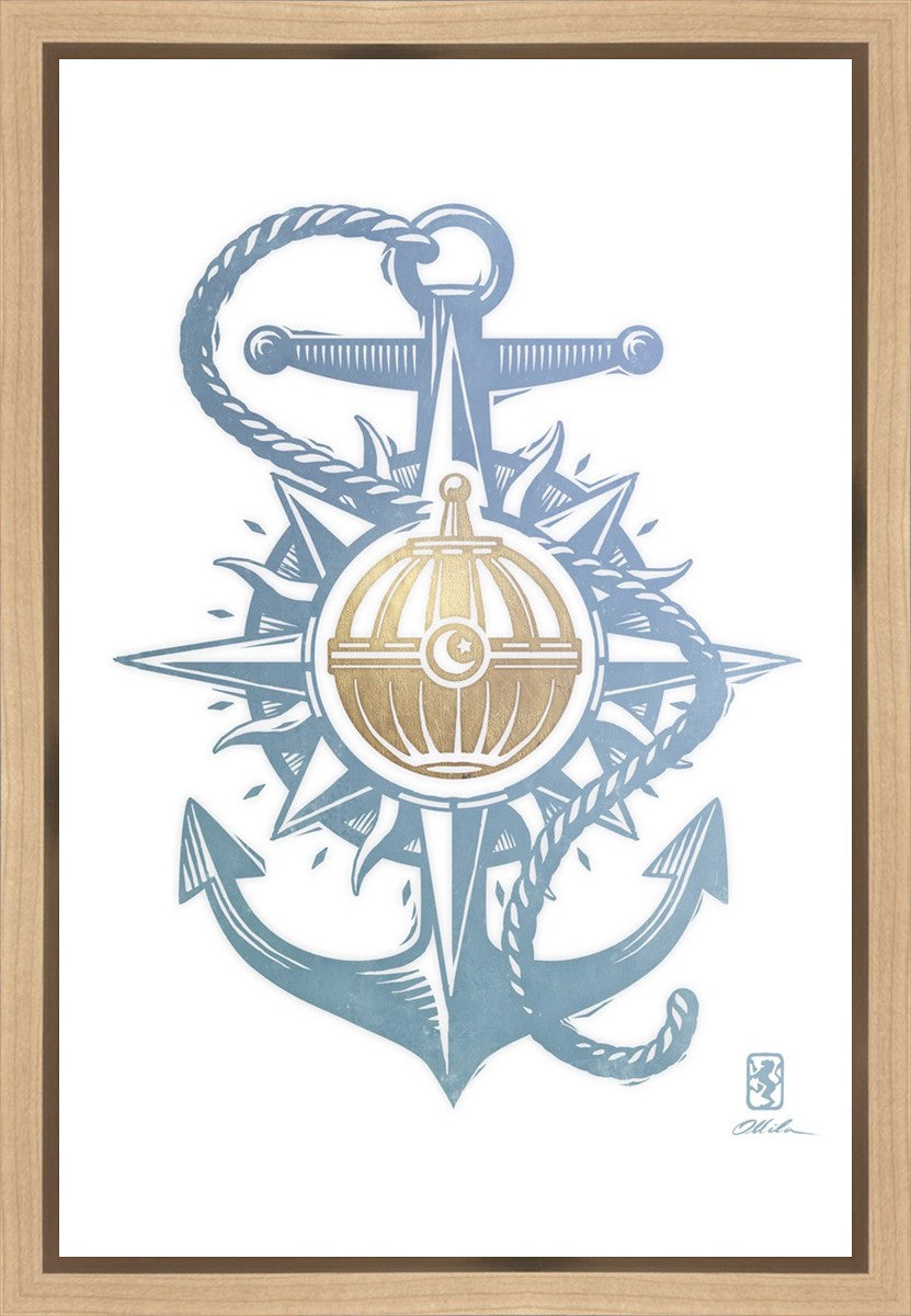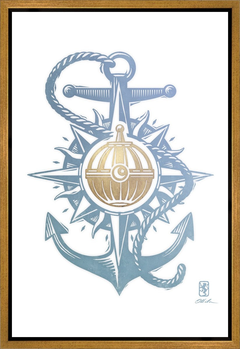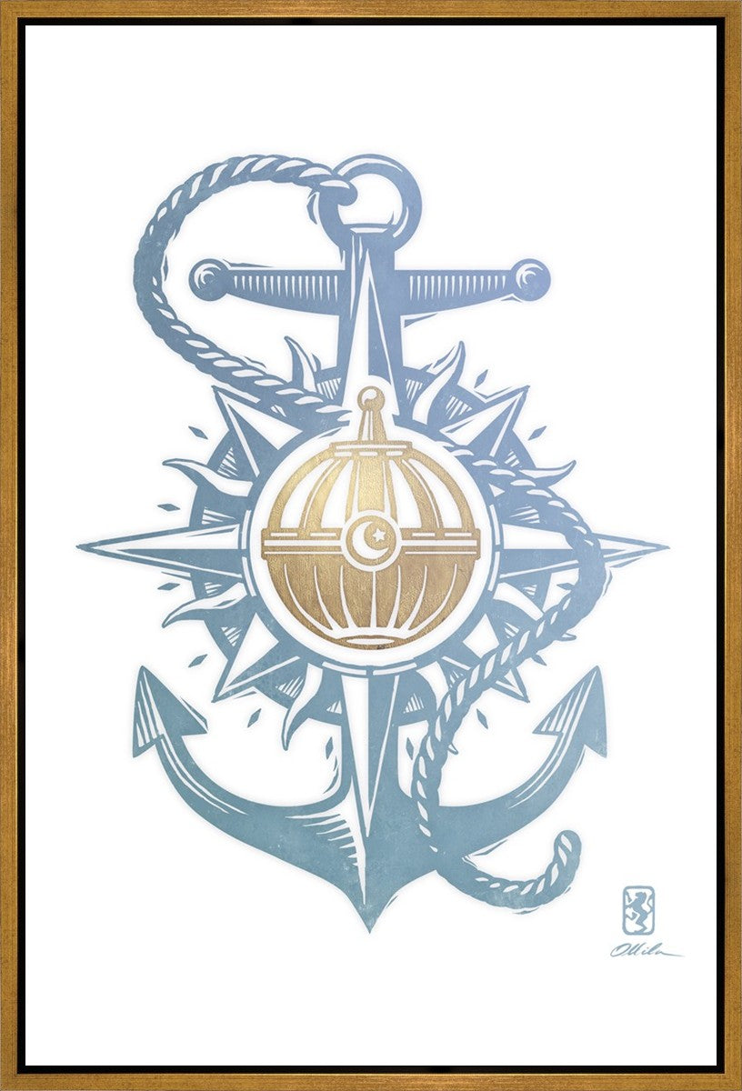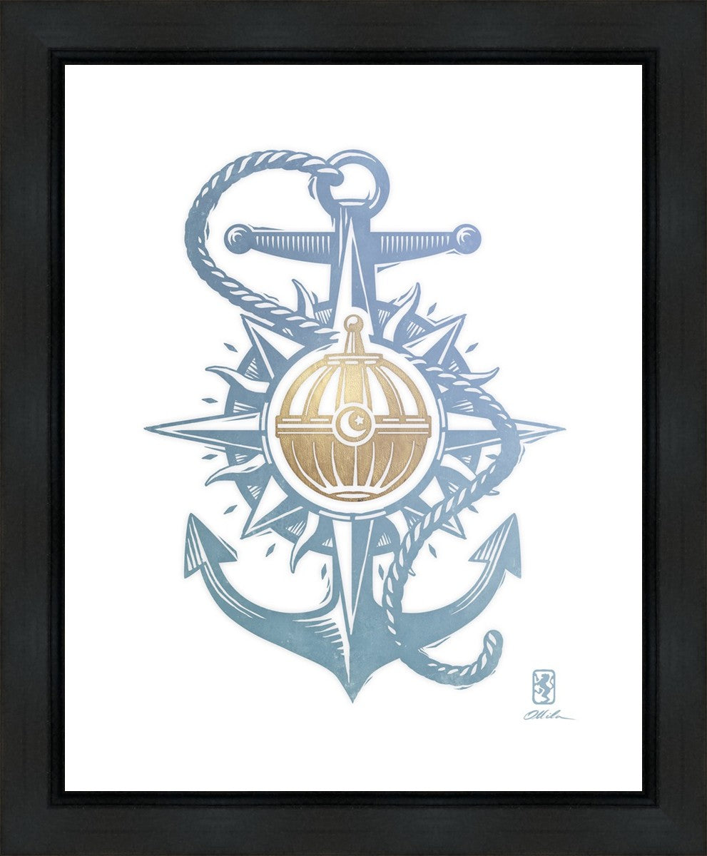 This piece is a hand carved woodcut relief print. The artist was inspired to create this piece by the story of Lehi's journey across the sea. The Liahona represents the word of Christ, which can act as a compass to guide us, and an anchor to which we may hold.