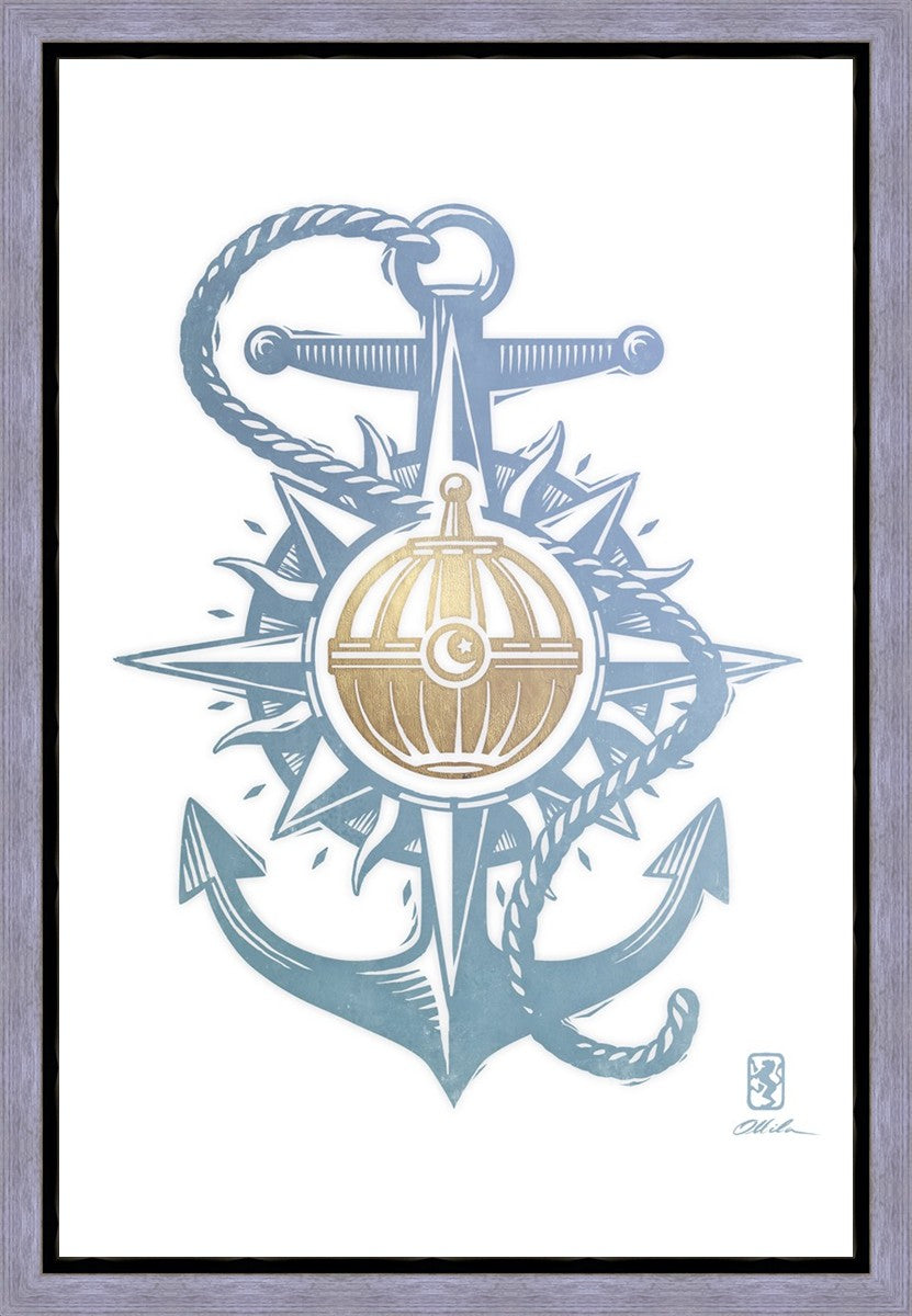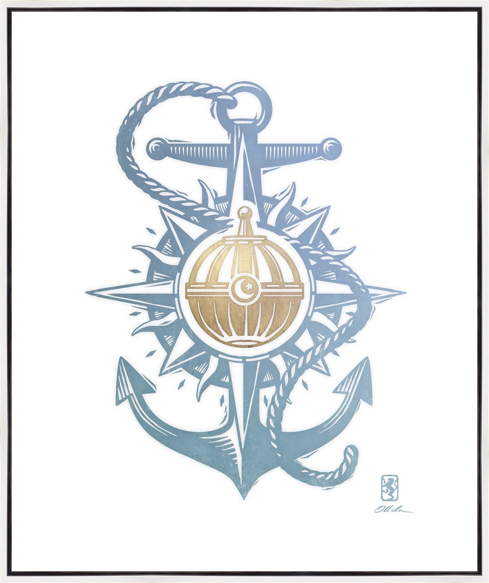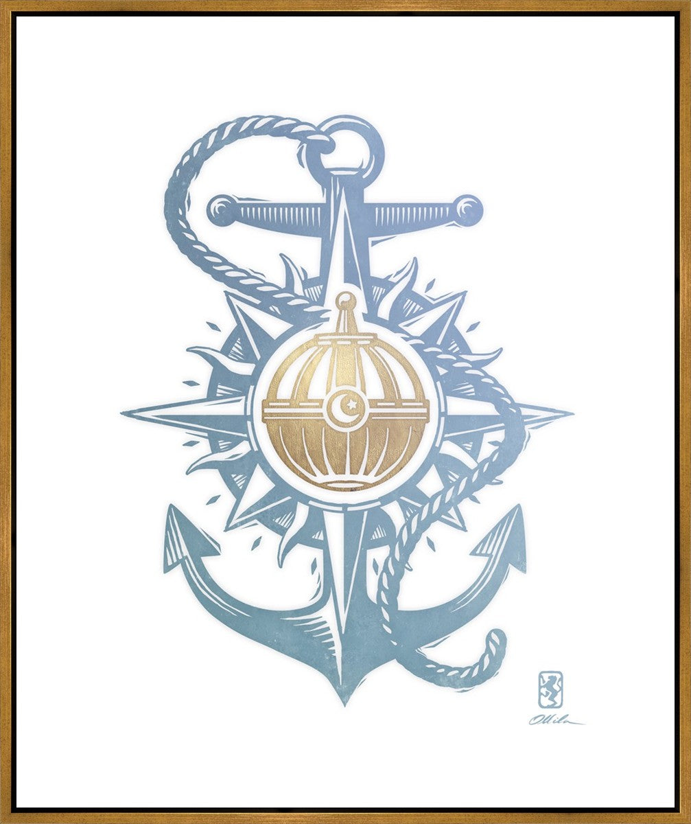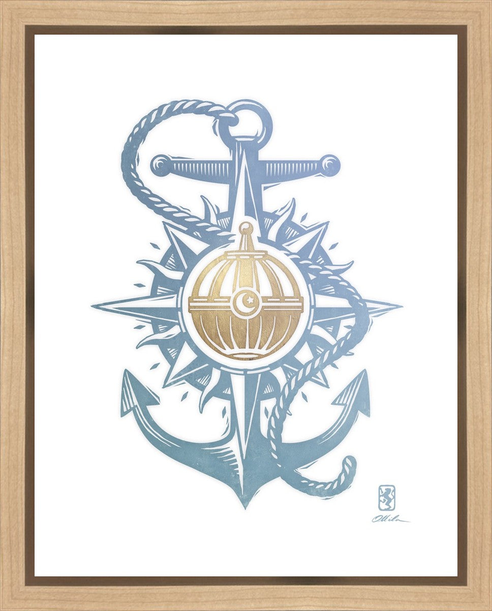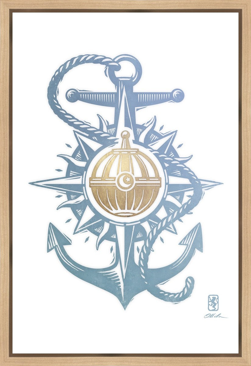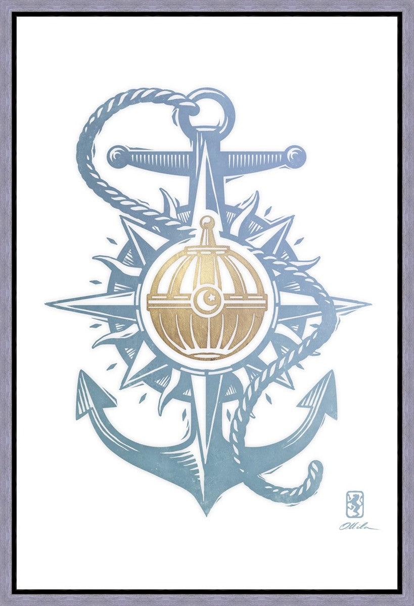 This piece is a hand carved woodcut relief print. The artist was inspired to create this piece by the story of Lehi's journey across the sea. The Liahona represents the word of Christ, which can act as a compass to guide us, and an anchor to which we may hold.