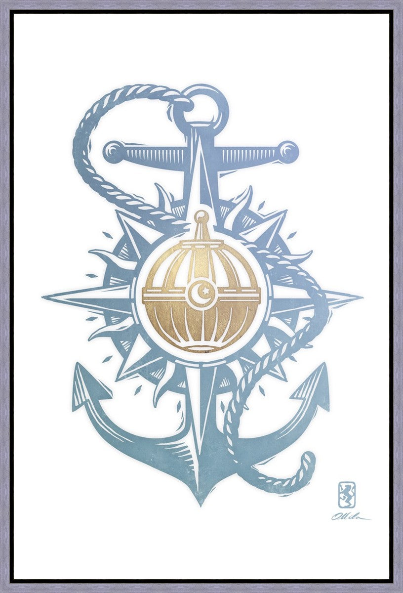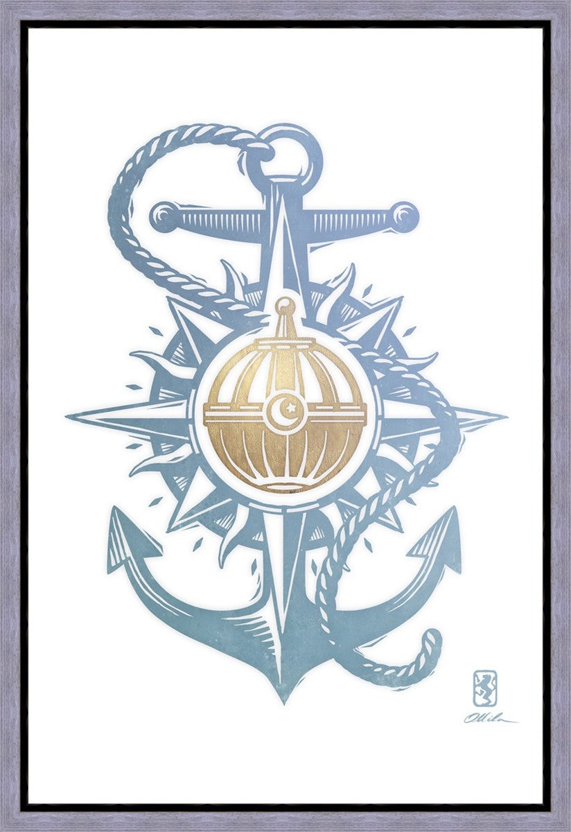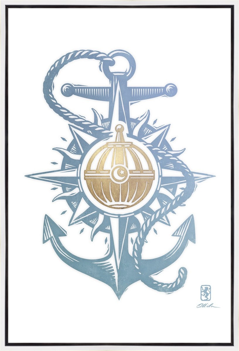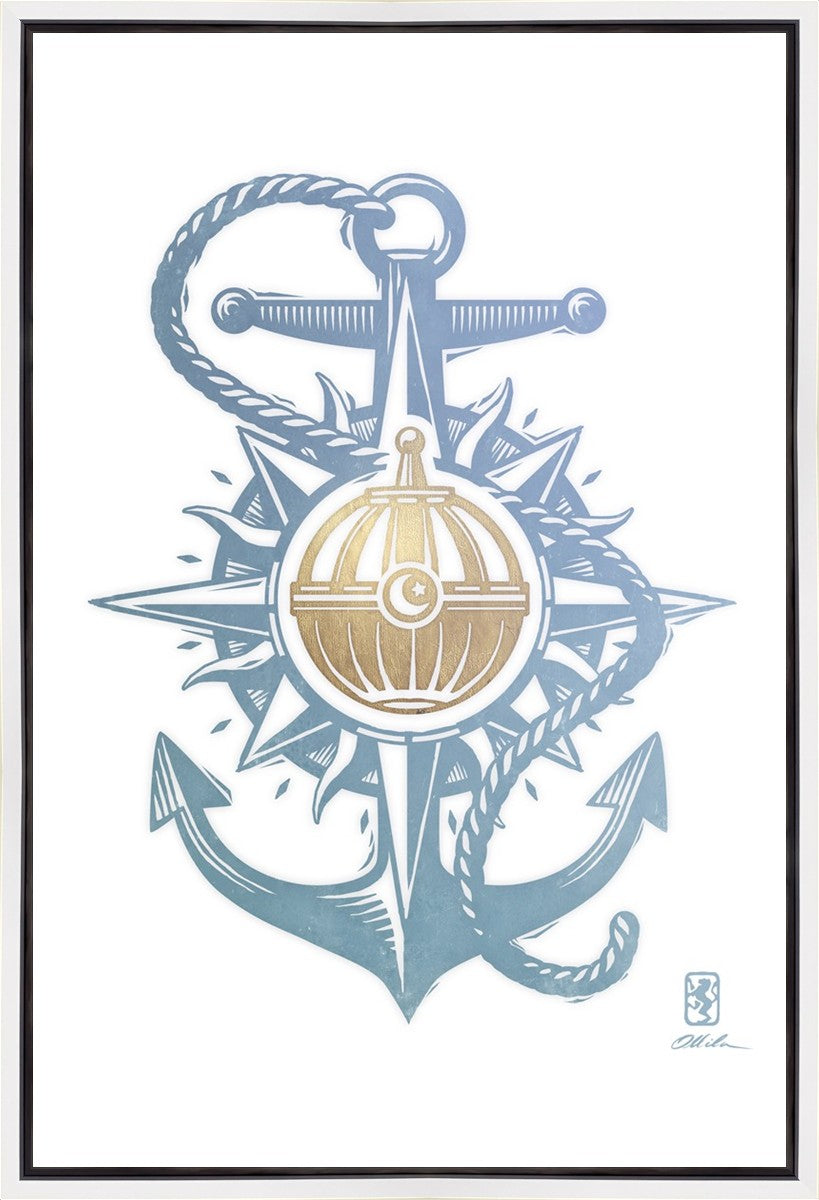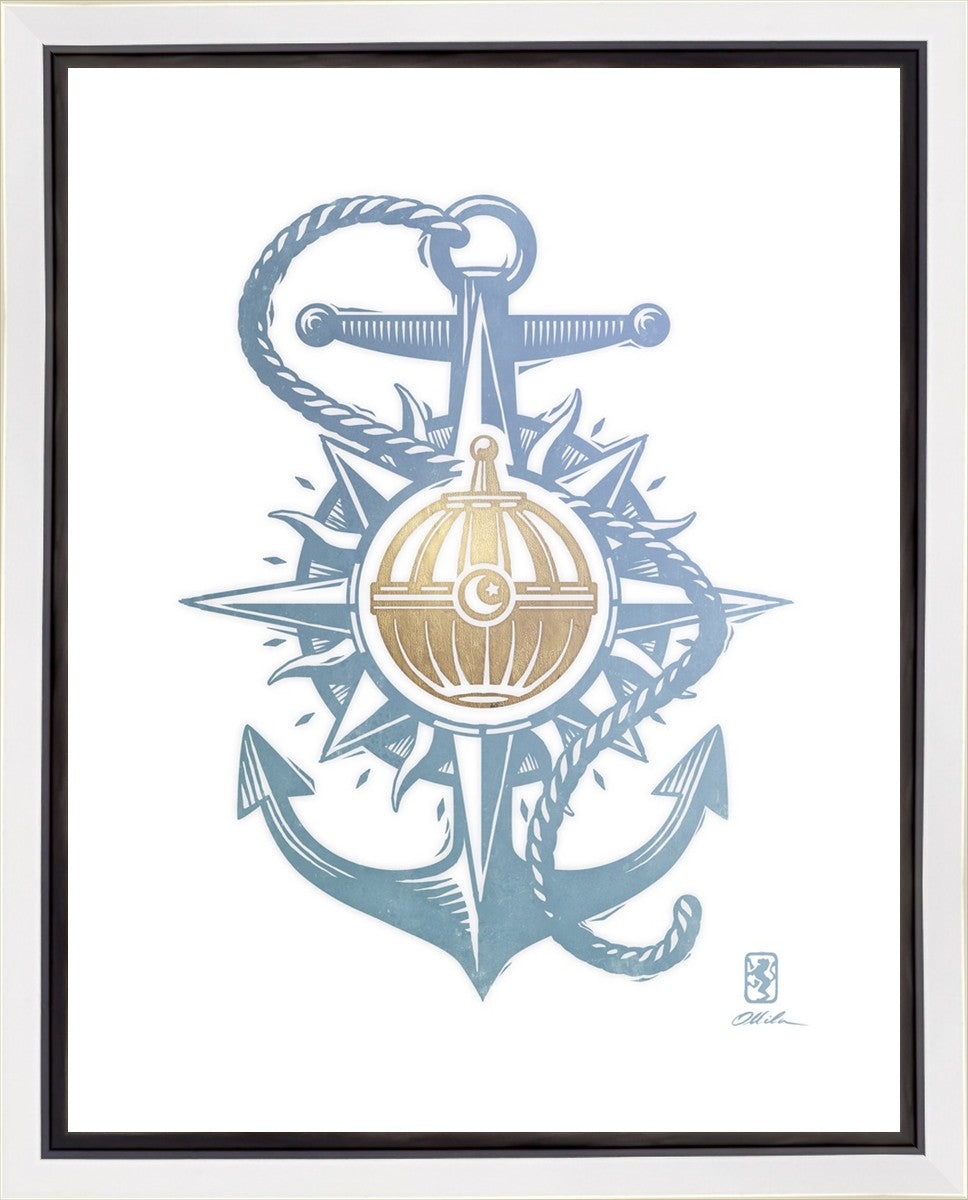This piece is a hand carved woodcut relief print. The artist was inspired to create this piece by the story of Lehi's journey across the sea. The Liahona represents the word of Christ, which can act as a compass to guide us, and an anchor to which we may hold.
