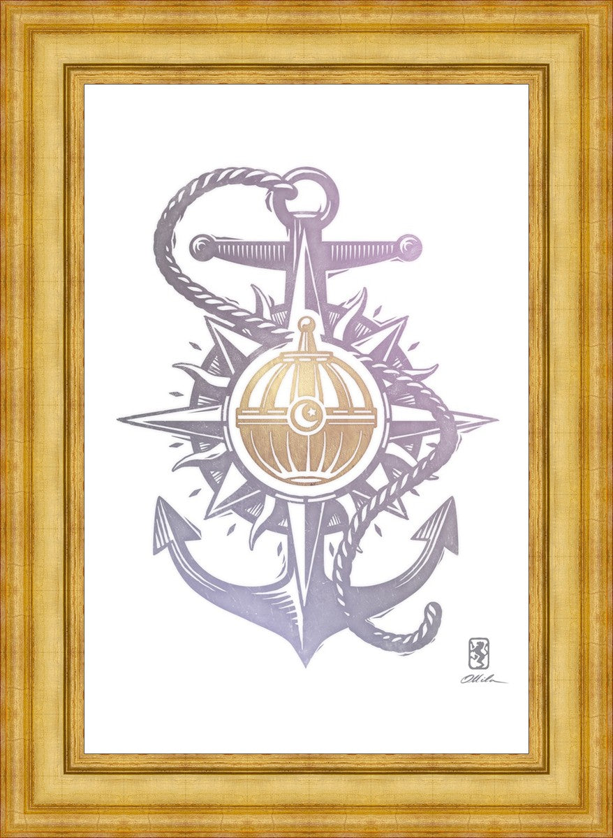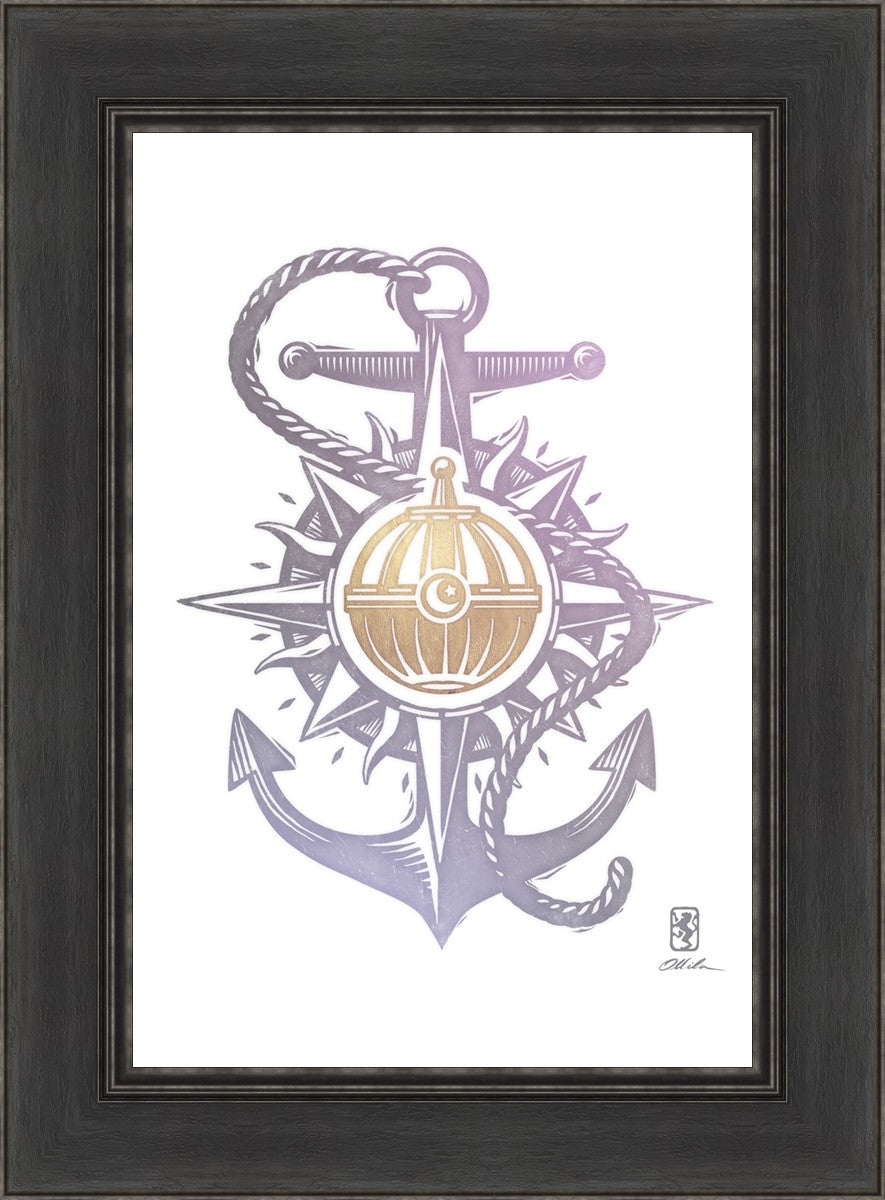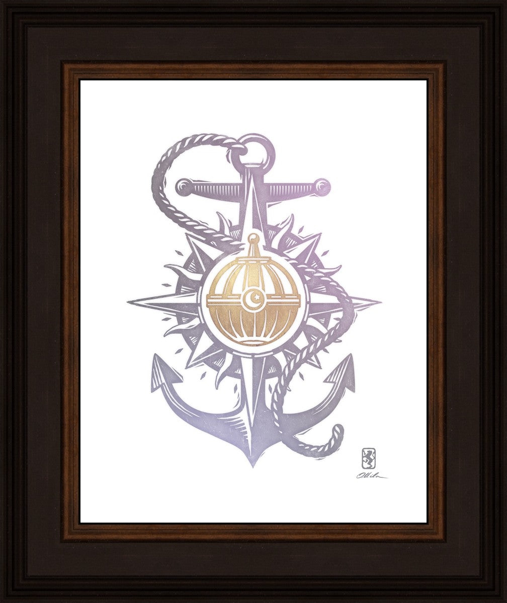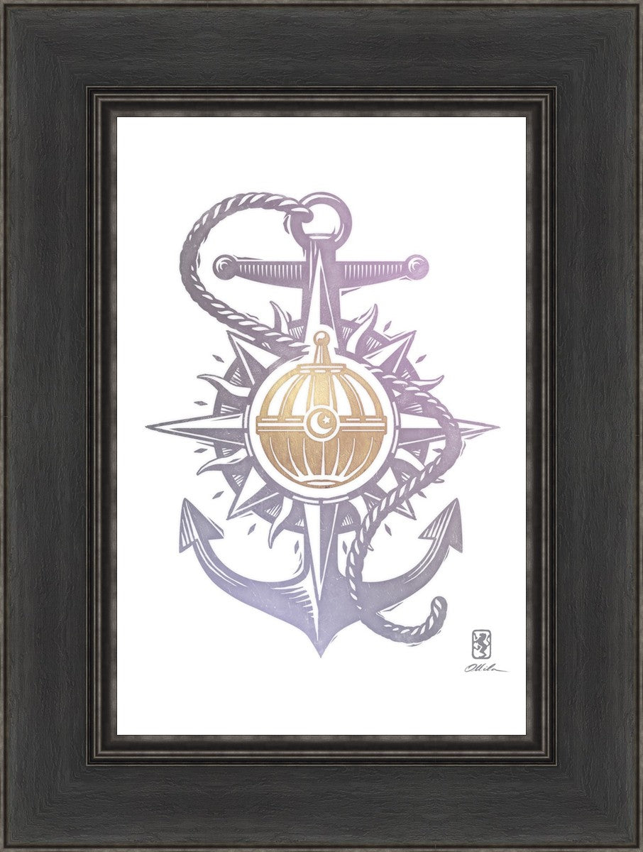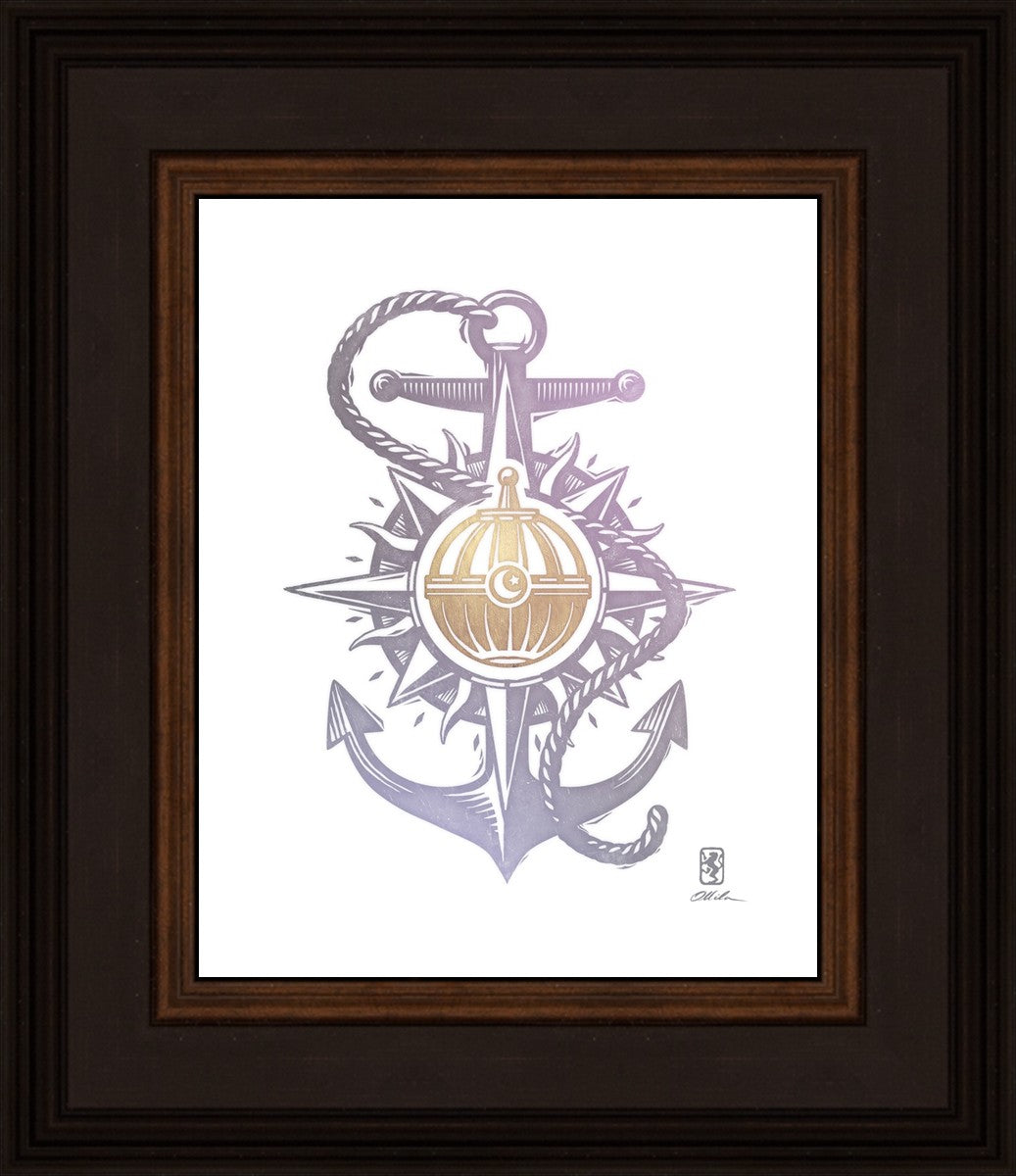 This piece is a hand carved woodcut relief print. The artist was inspired to create this piece by the story of Lehi's journey across the sea. The Liahona represents the word of Christ, which can act as a compass to guide us, and an anchor to which we may hold.