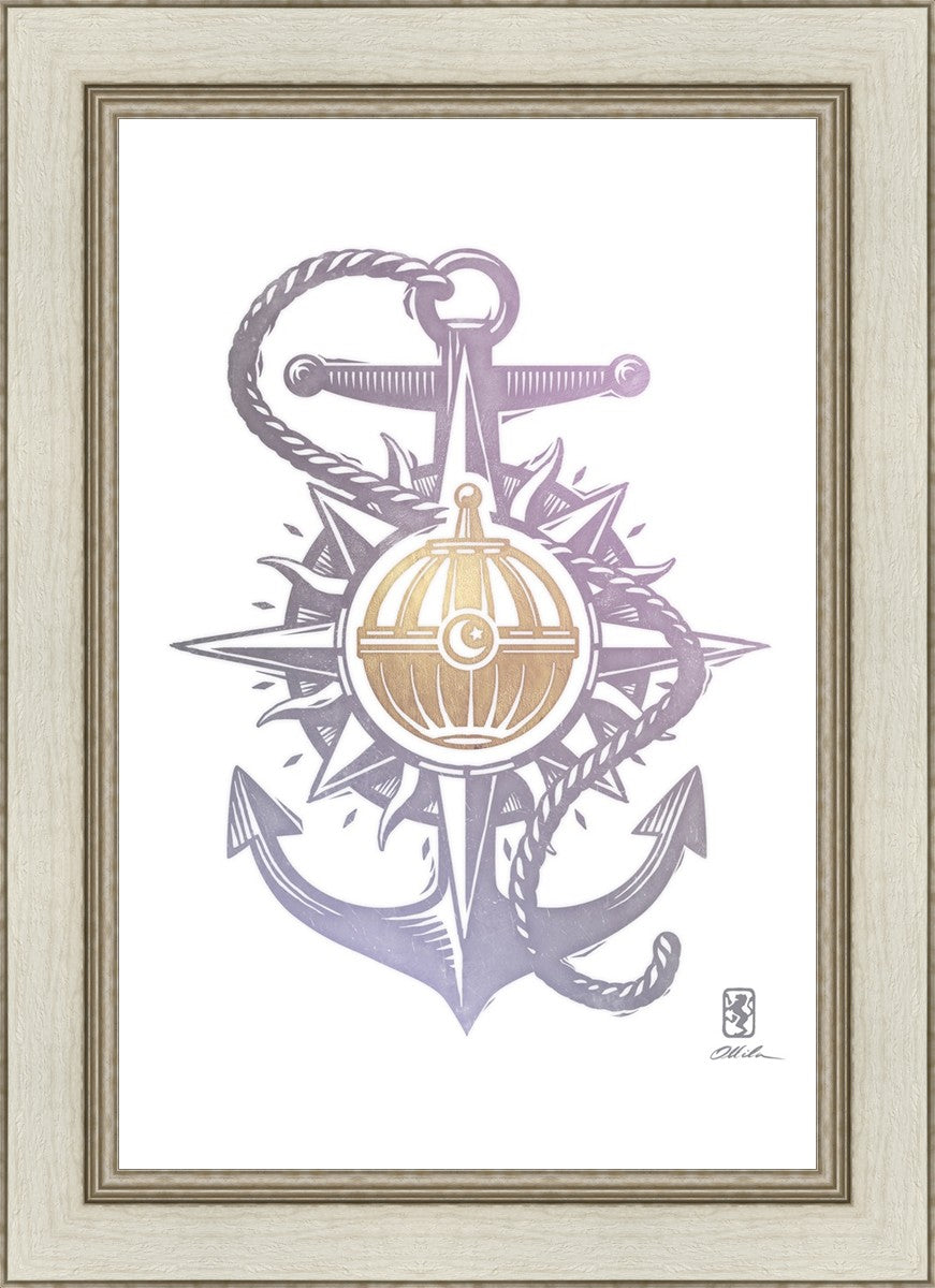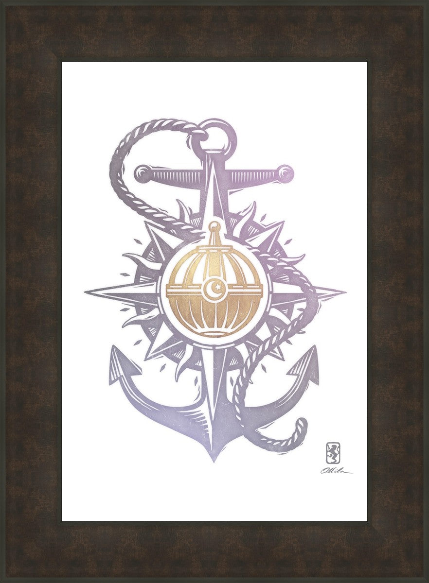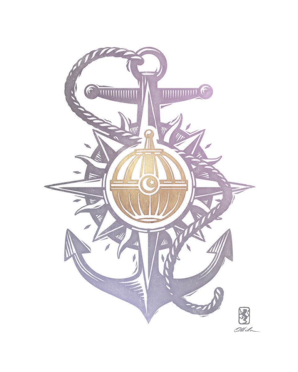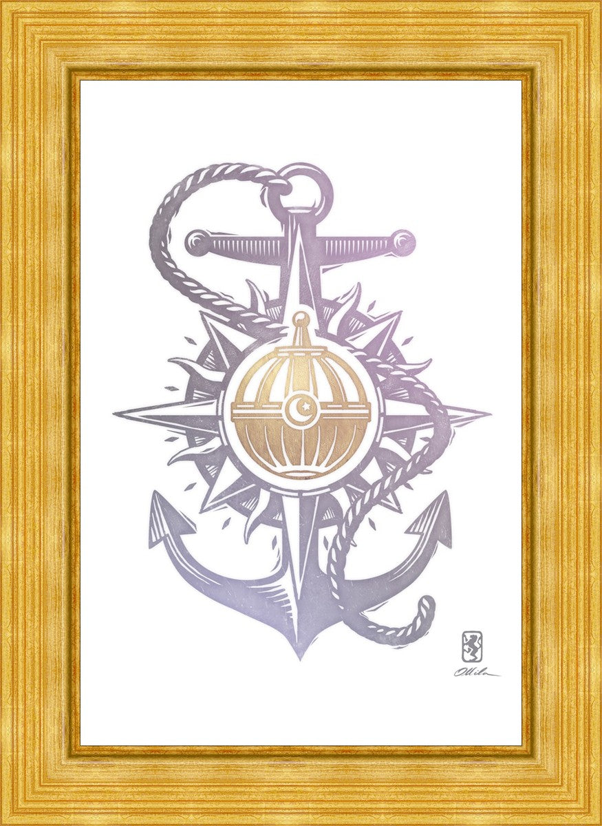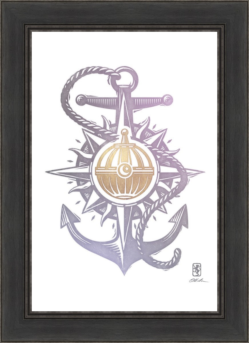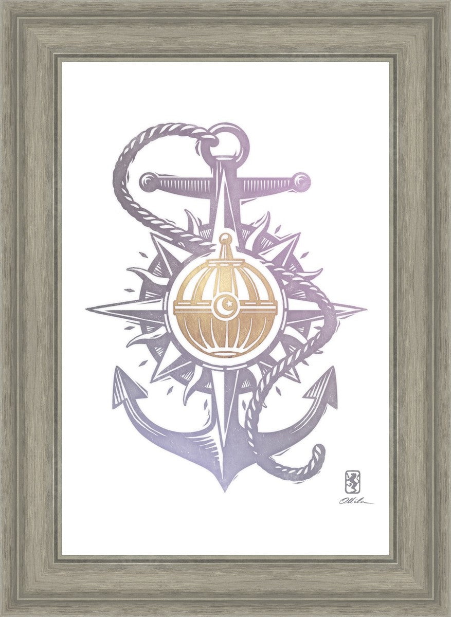 This piece is a hand carved woodcut relief print. The artist was inspired to create this piece by the story of Lehi's journey across the sea. The Liahona represents the word of Christ, which can act as a compass to guide us, and an anchor to which we may hold.
