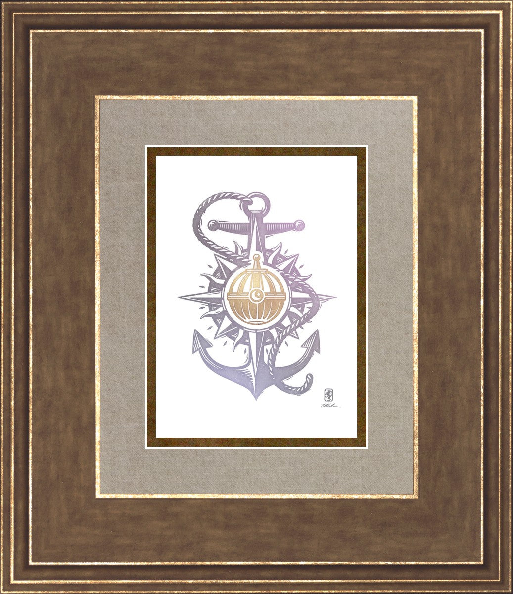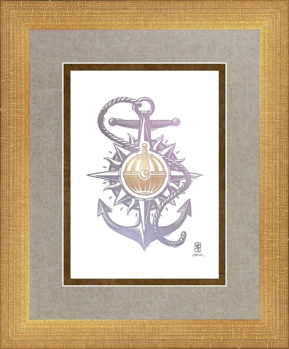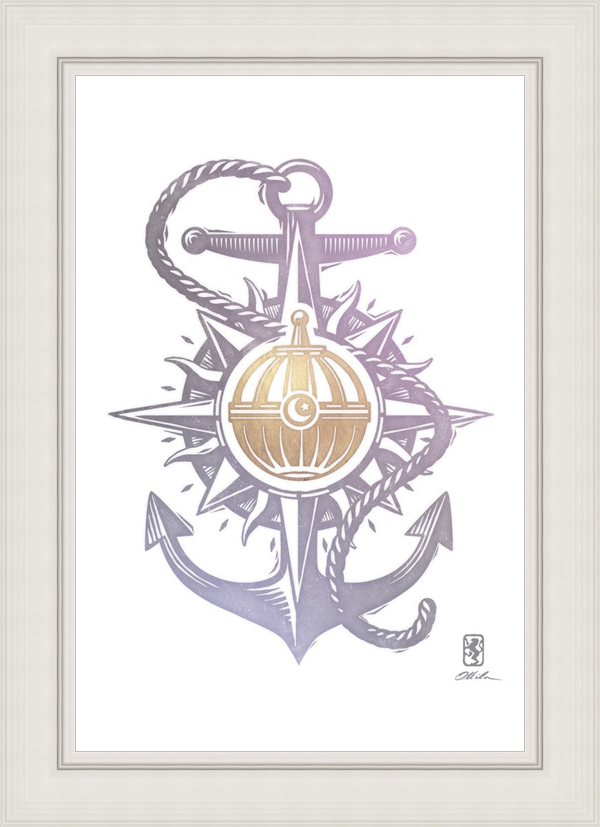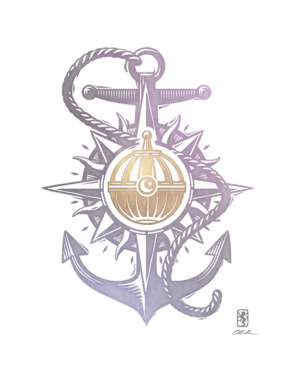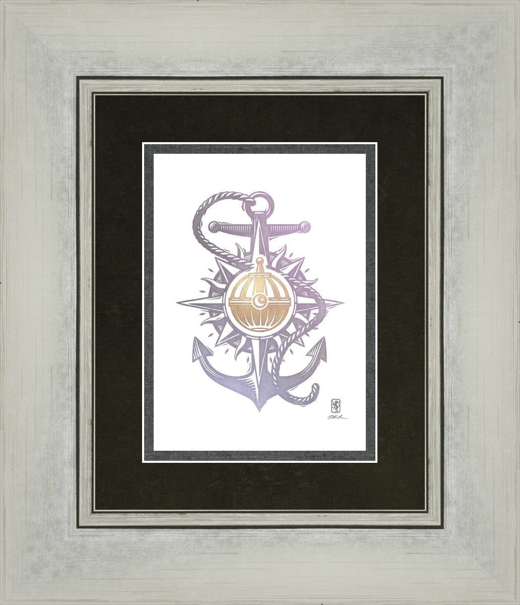 This piece is a hand carved woodcut relief print. The artist was inspired to create this piece by the story of Lehi's journey across the sea. The Liahona represents the word of Christ, which can act as a compass to guide us, and an anchor to which we may hold.