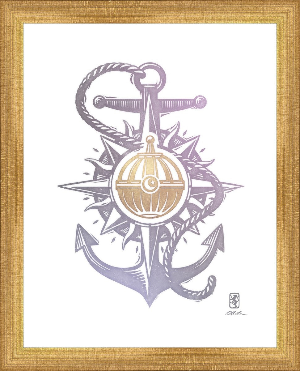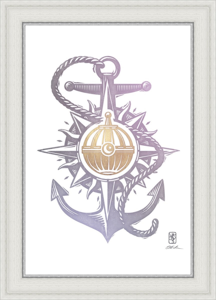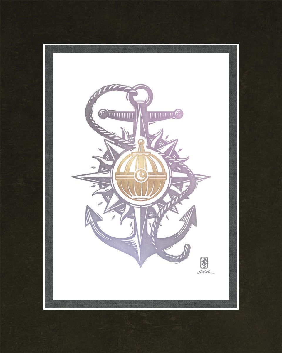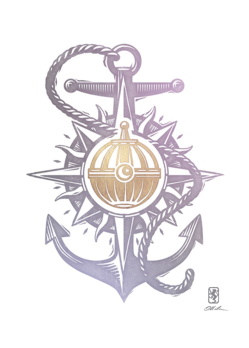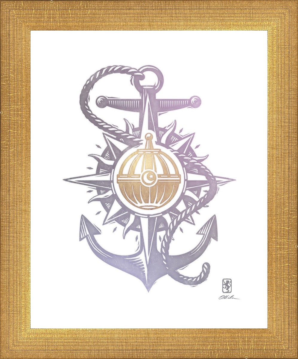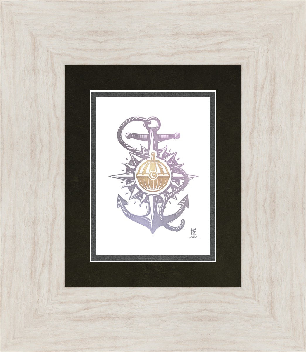 This piece is a hand carved woodcut relief print. The artist was inspired to create this piece by the story of Lehi's journey across the sea. The Liahona represents the word of Christ, which can act as a compass to guide us, and an anchor to which we may hold.