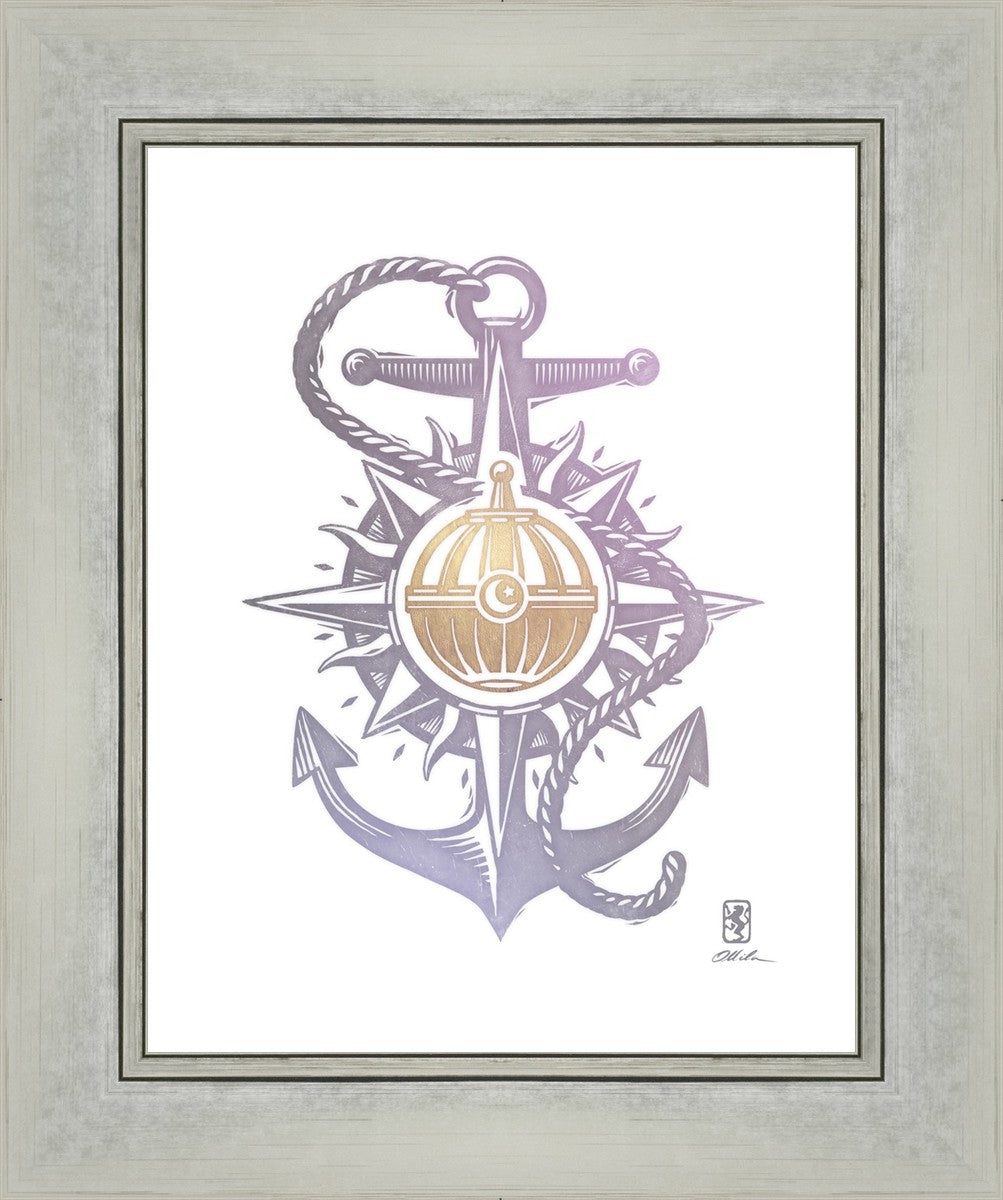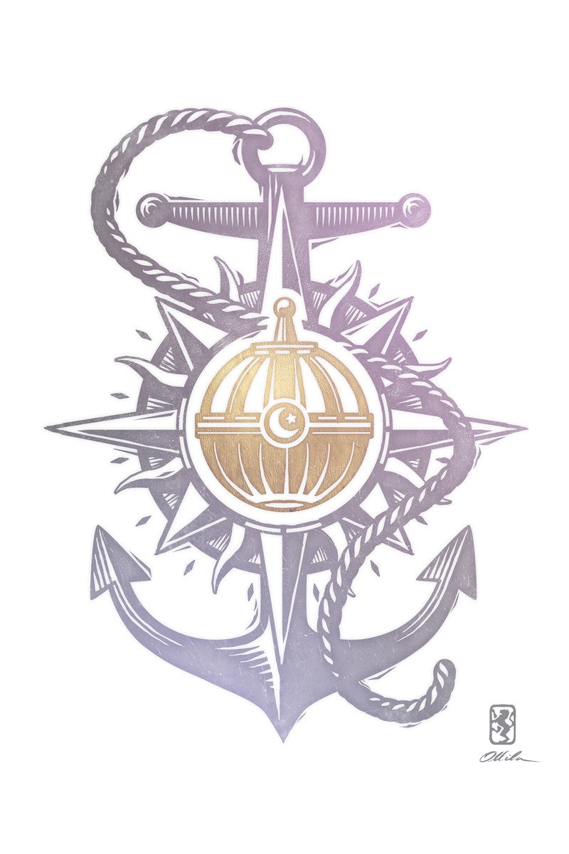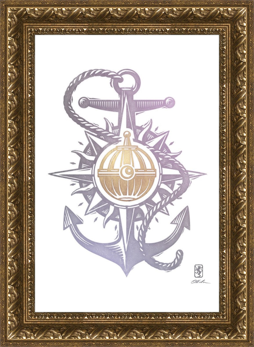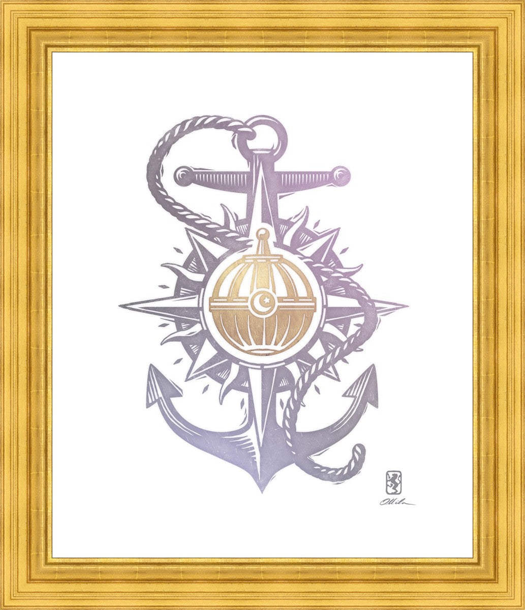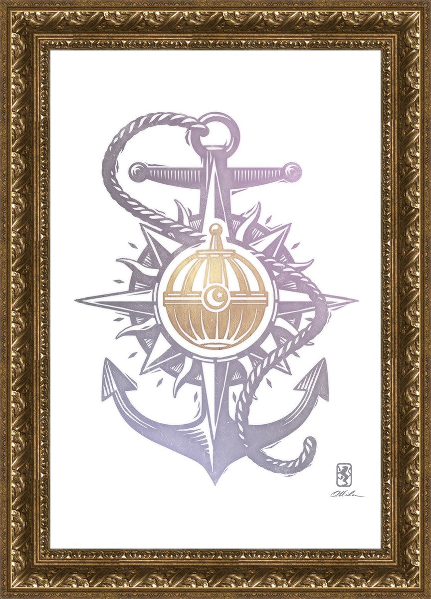 This piece is a hand carved woodcut relief print. The artist was inspired to create this piece by the story of Lehi's journey across the sea. The Liahona represents the word of Christ, which can act as a compass to guide us, and an anchor to which we may hold.