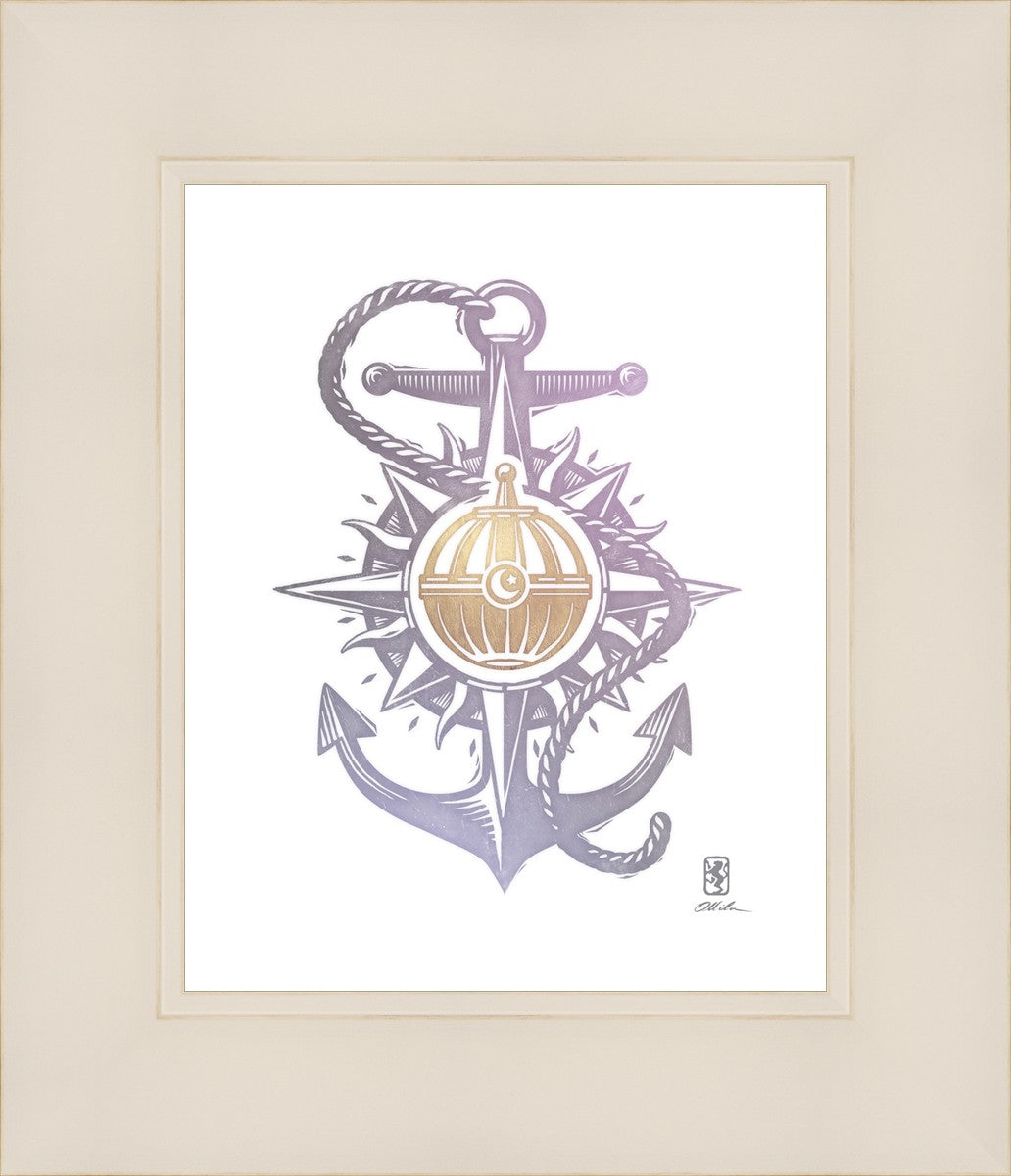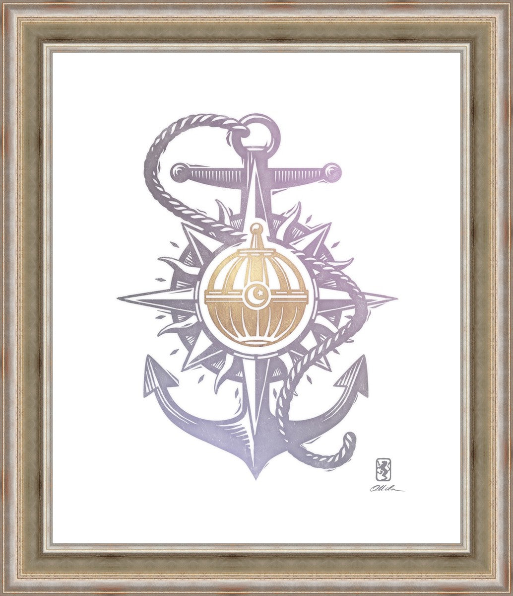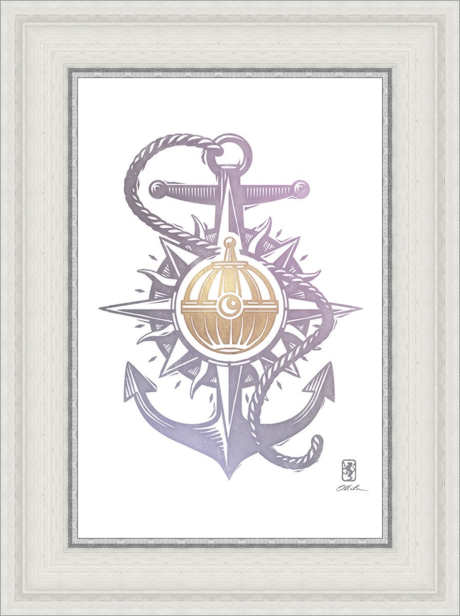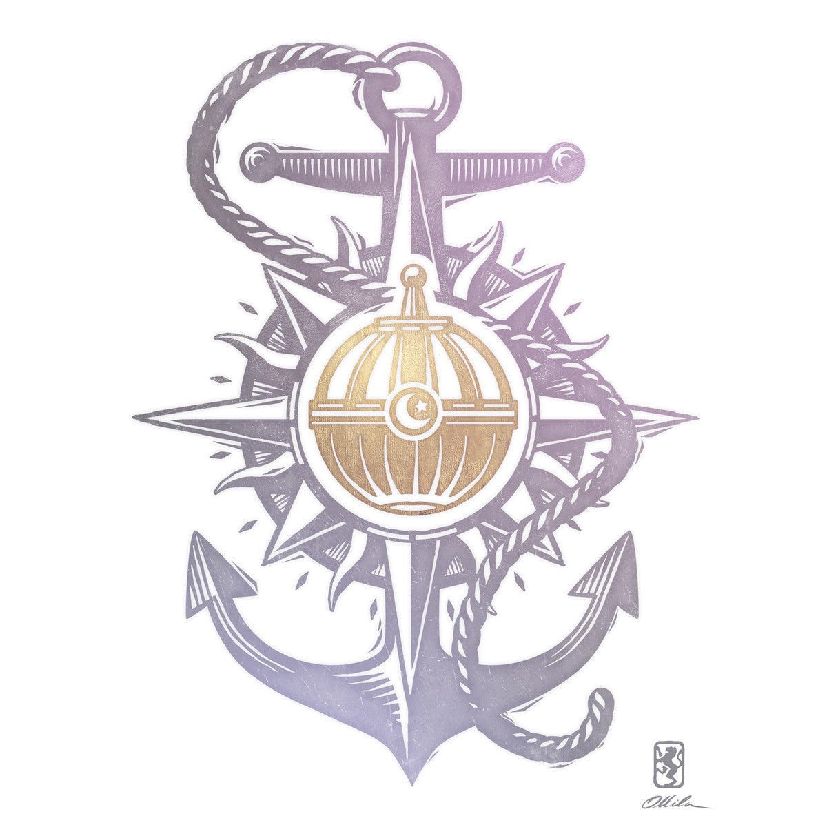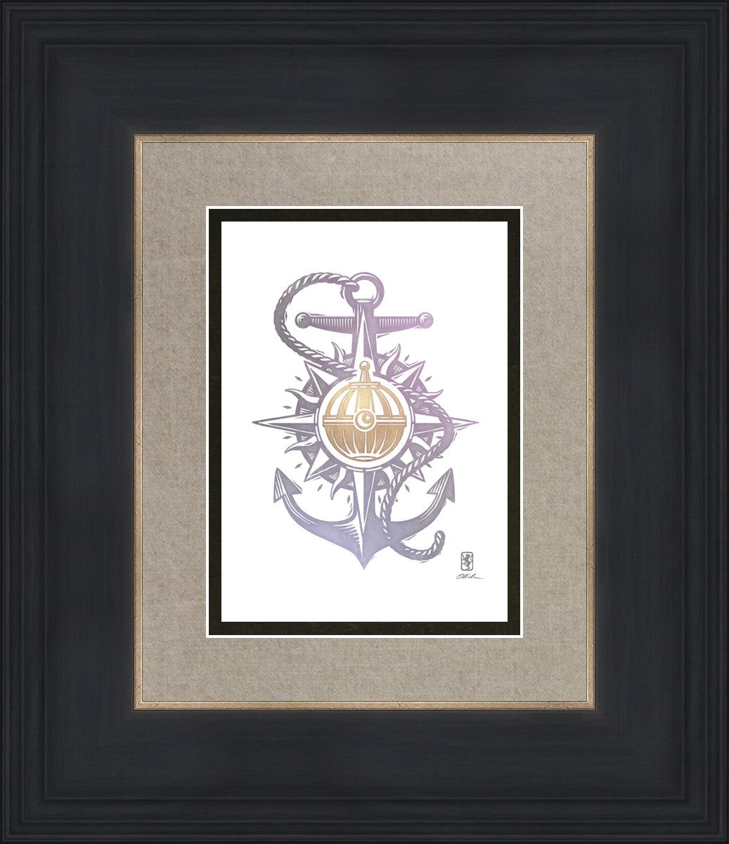 This piece is a hand carved woodcut relief print. The artist was inspired to create this piece by the story of Lehi's journey across the sea. The Liahona represents the word of Christ, which can act as a compass to guide us, and an anchor to which we may hold.