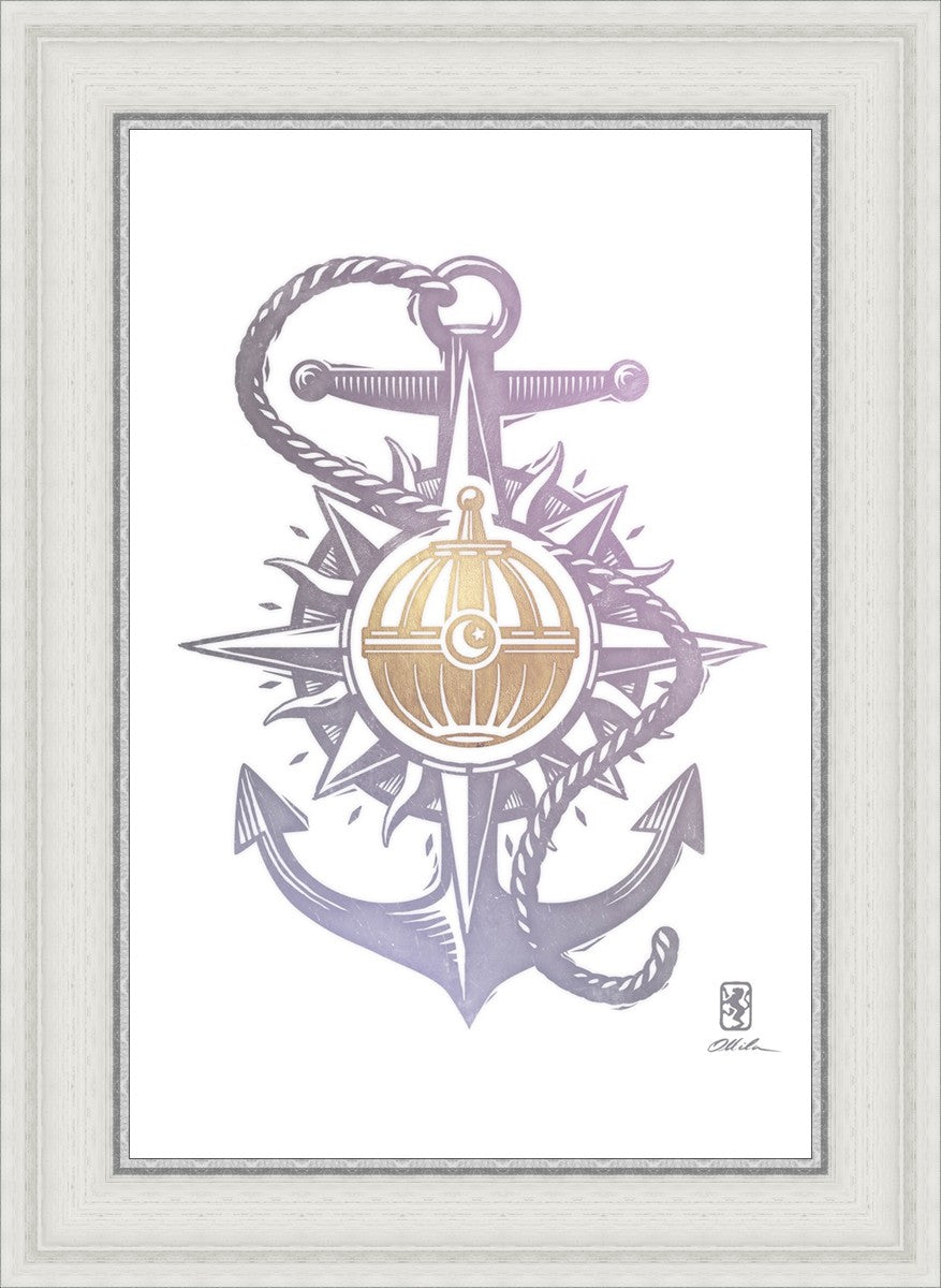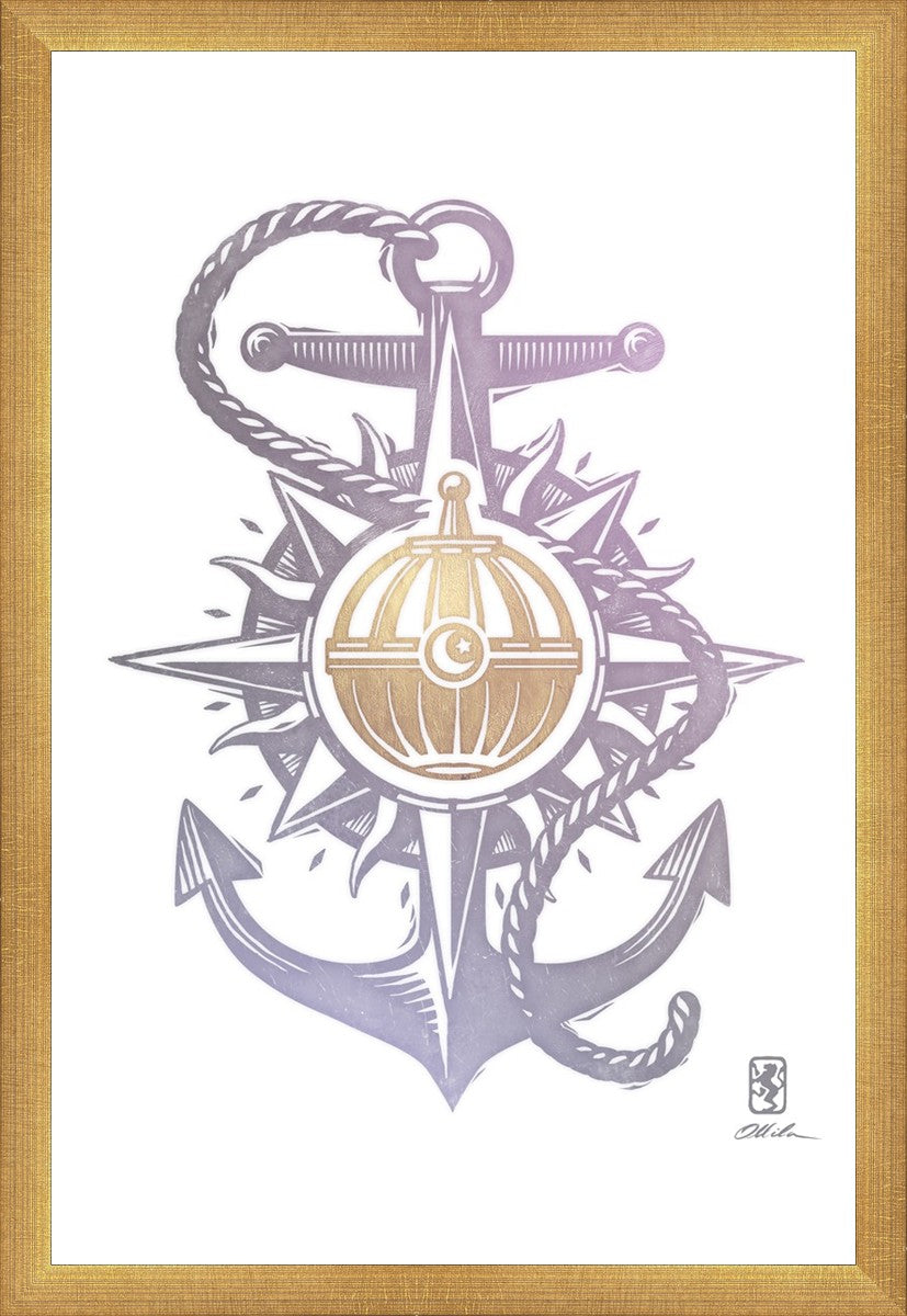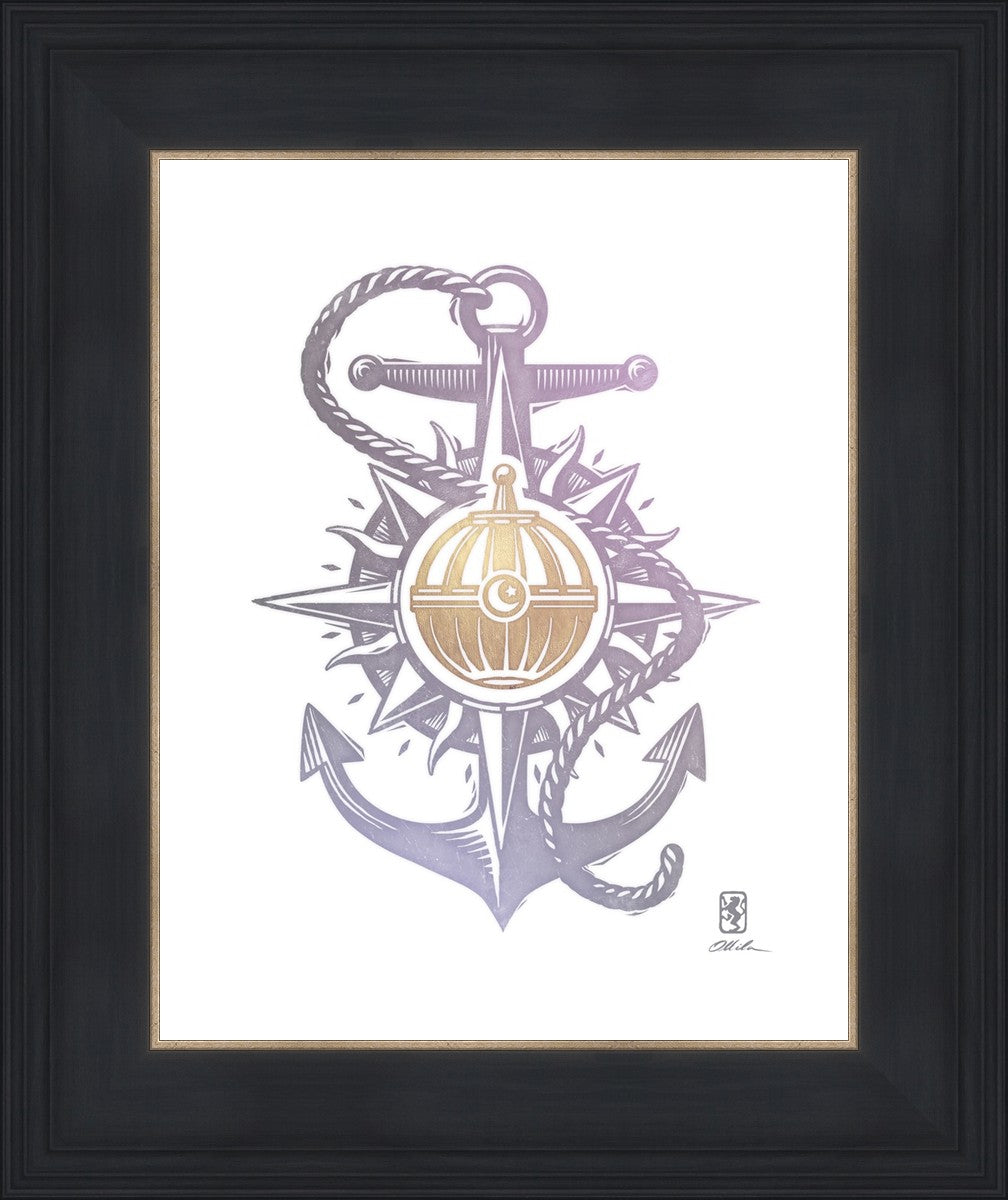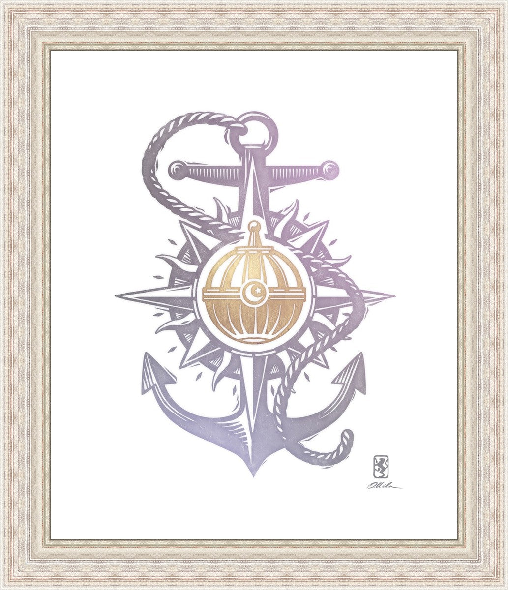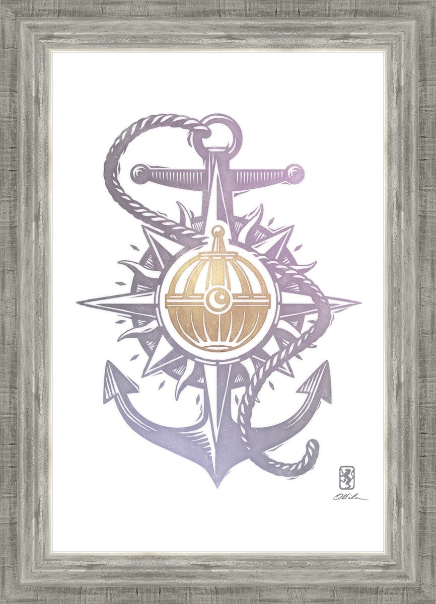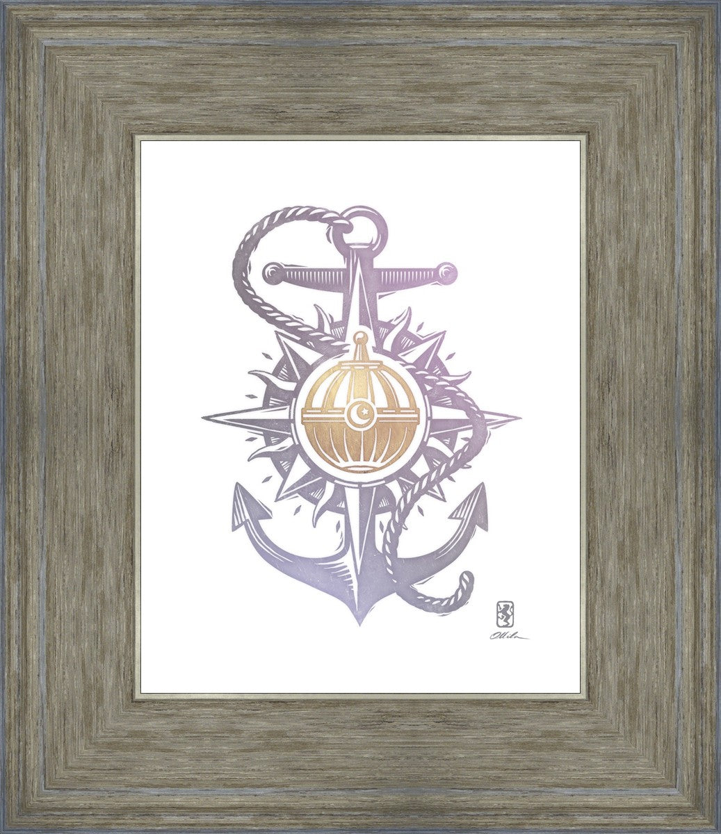 This piece is a hand carved woodcut relief print. The artist was inspired to create this piece by the story of Lehi's journey across the sea. The Liahona represents the word of Christ, which can act as a compass to guide us, and an anchor to which we may hold.