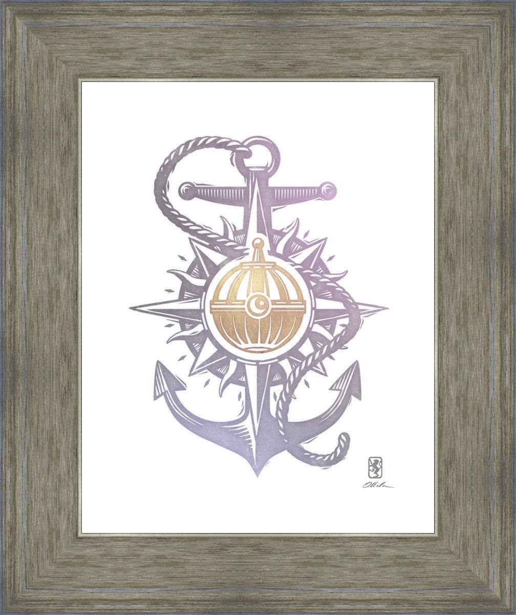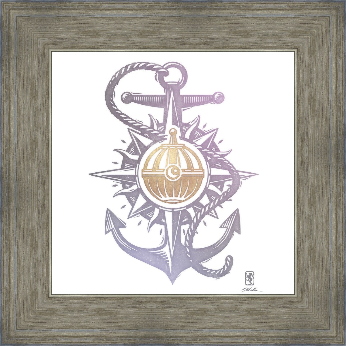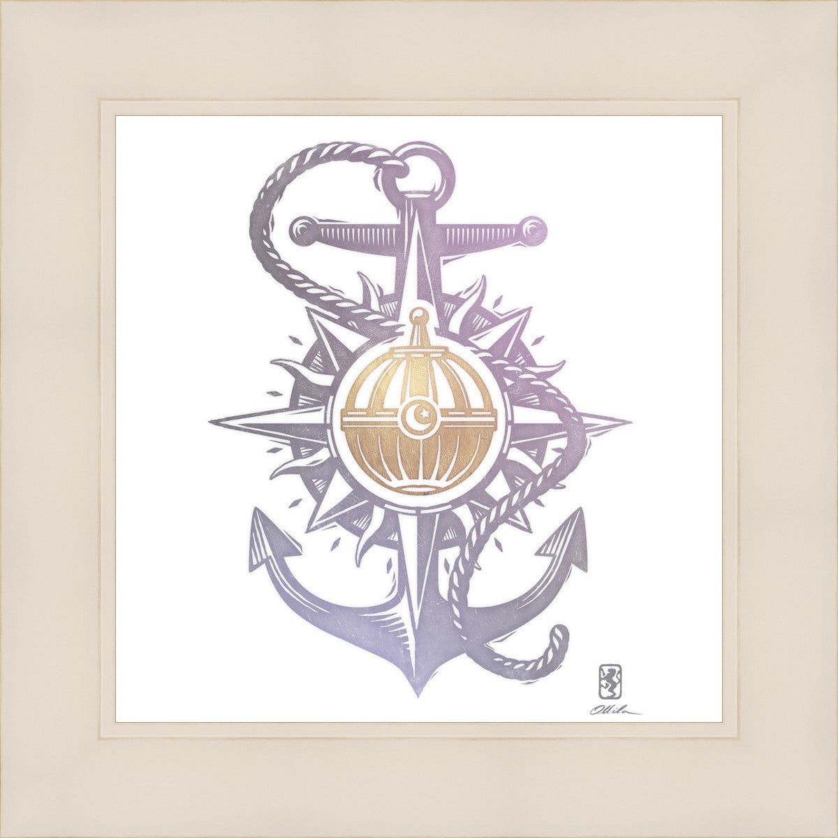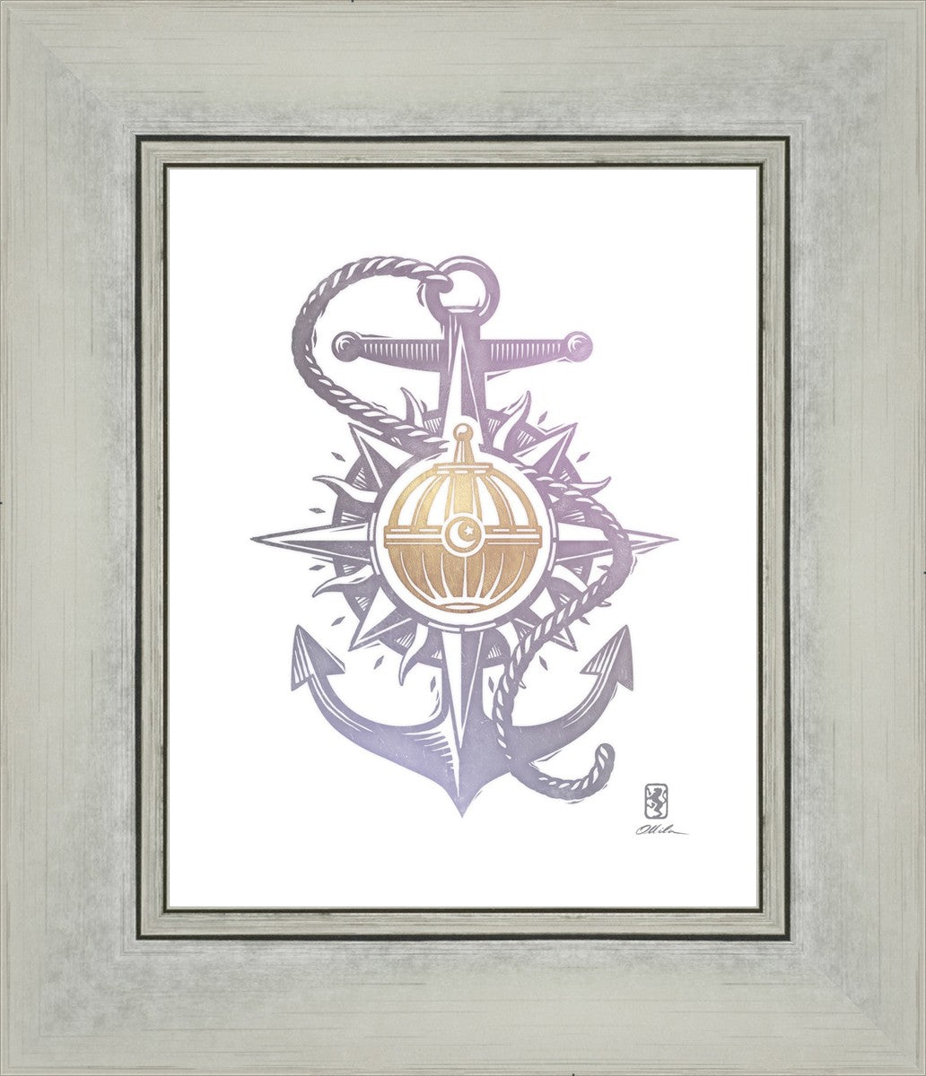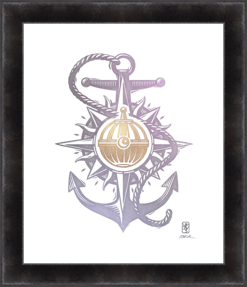 This piece is a hand carved woodcut relief print. The artist was inspired to create this piece by the story of Lehi's journey across the sea. The Liahona represents the word of Christ, which can act as a compass to guide us, and an anchor to which we may hold.