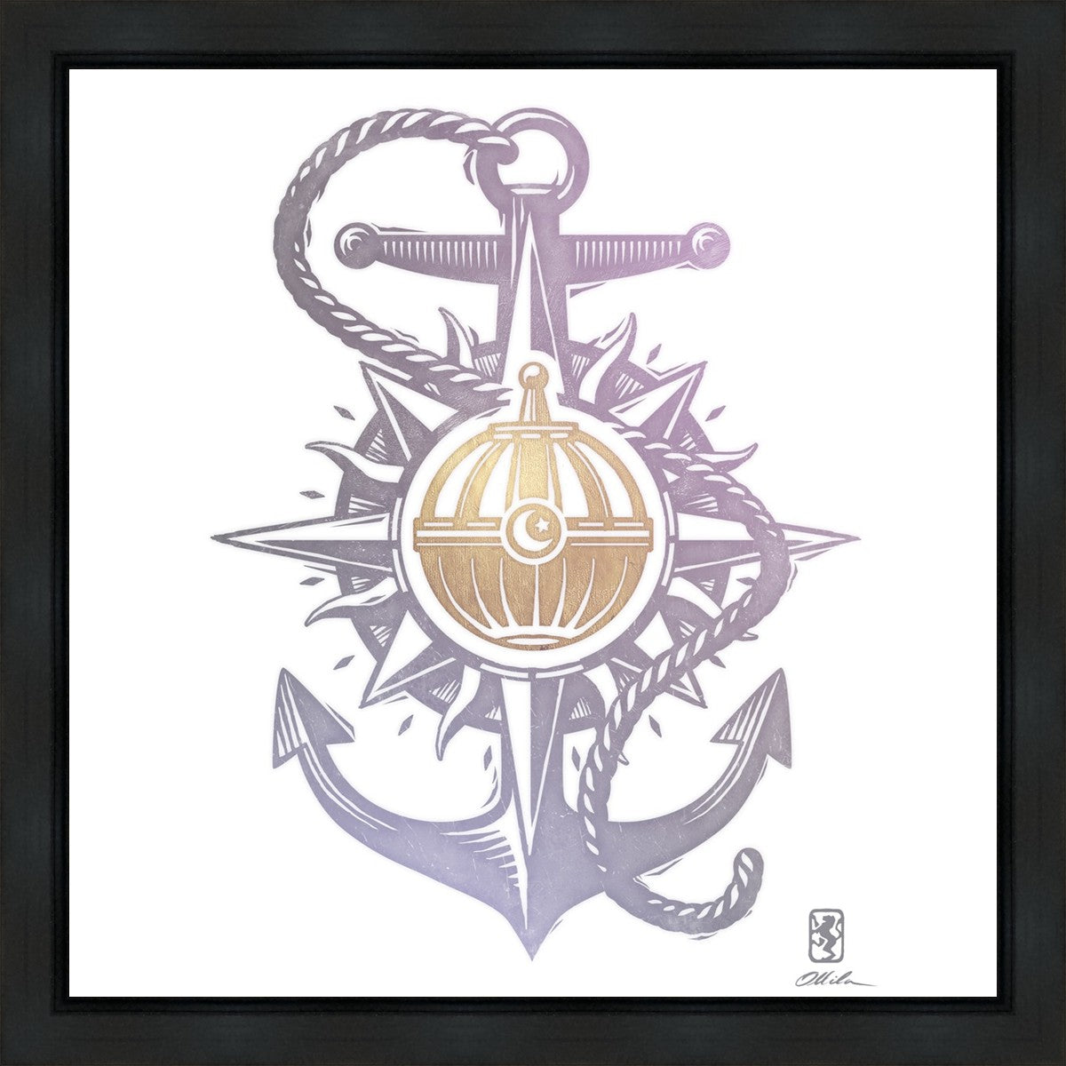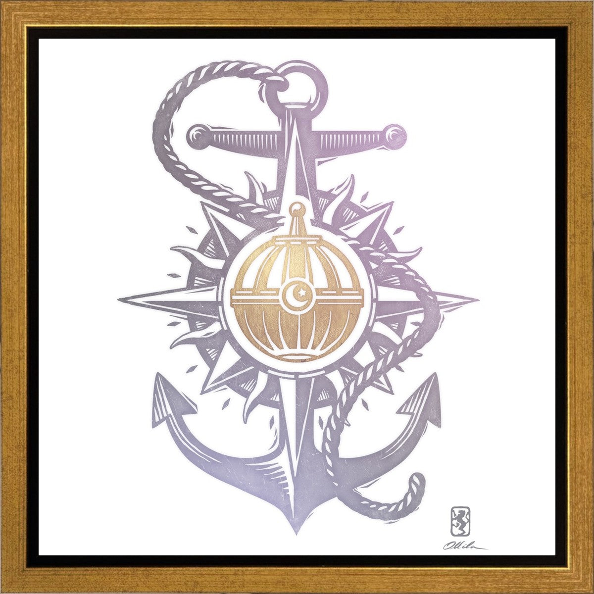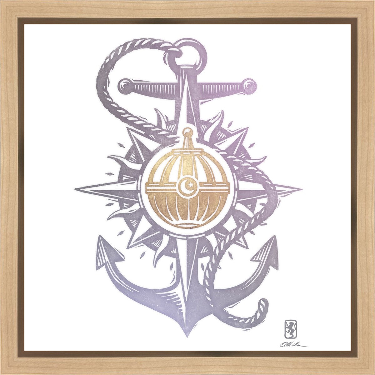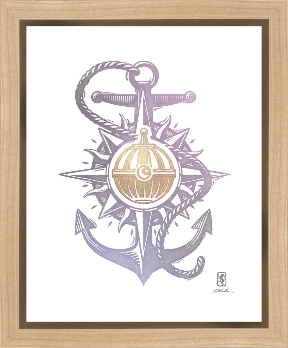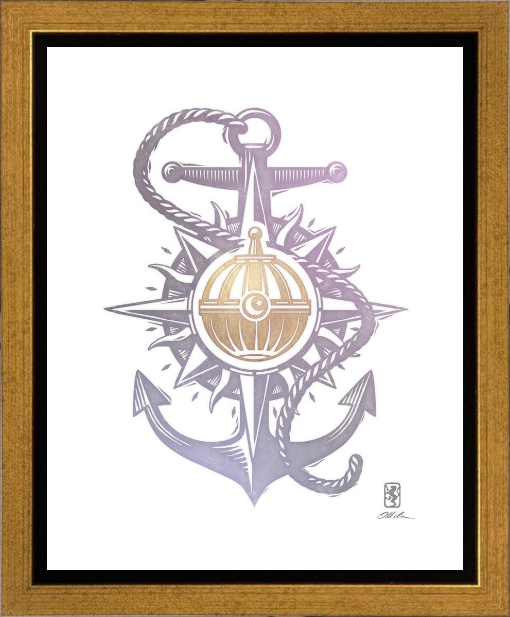 This piece is a hand carved woodcut relief print. The artist was inspired to create this piece by the story of Lehi's journey across the sea. The Liahona represents the word of Christ, which can act as a compass to guide us, and an anchor to which we may hold.