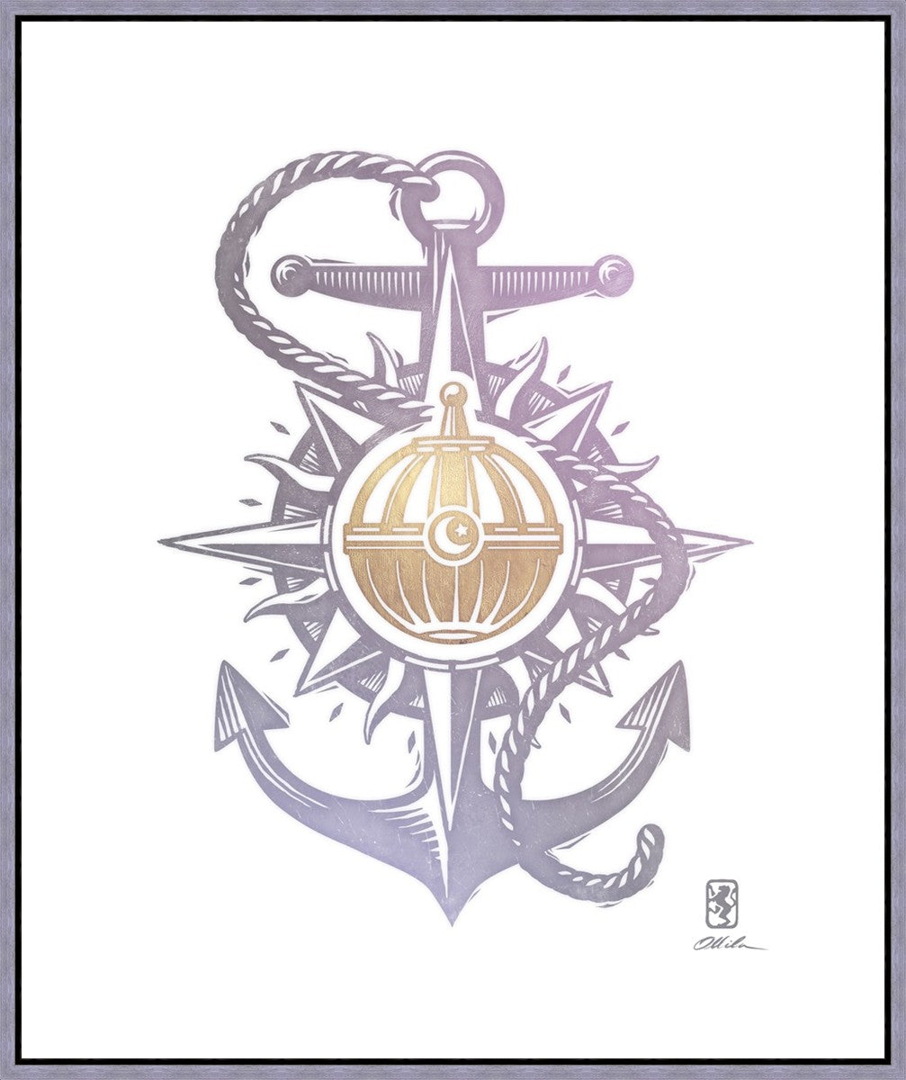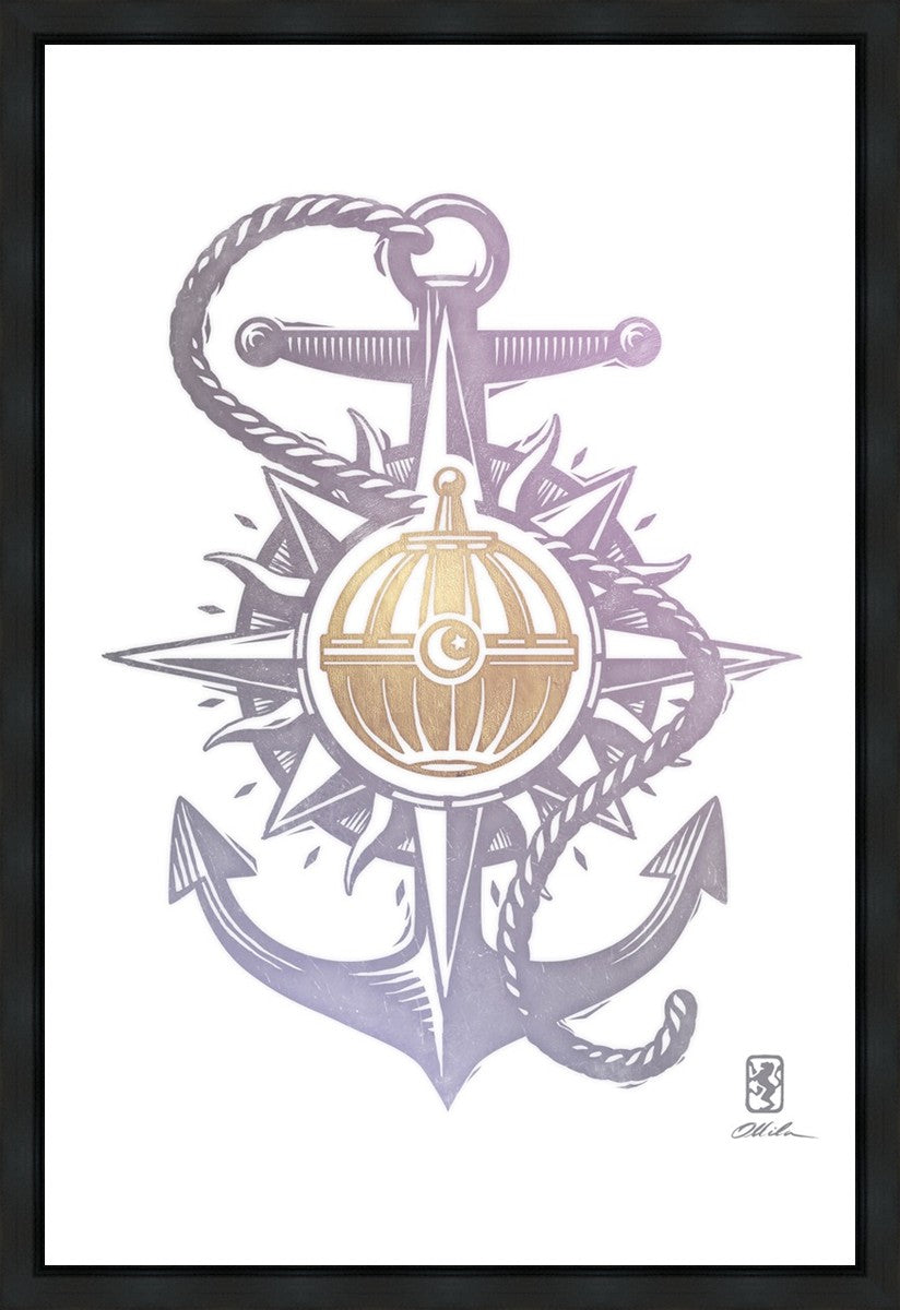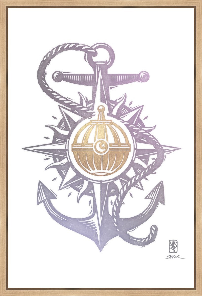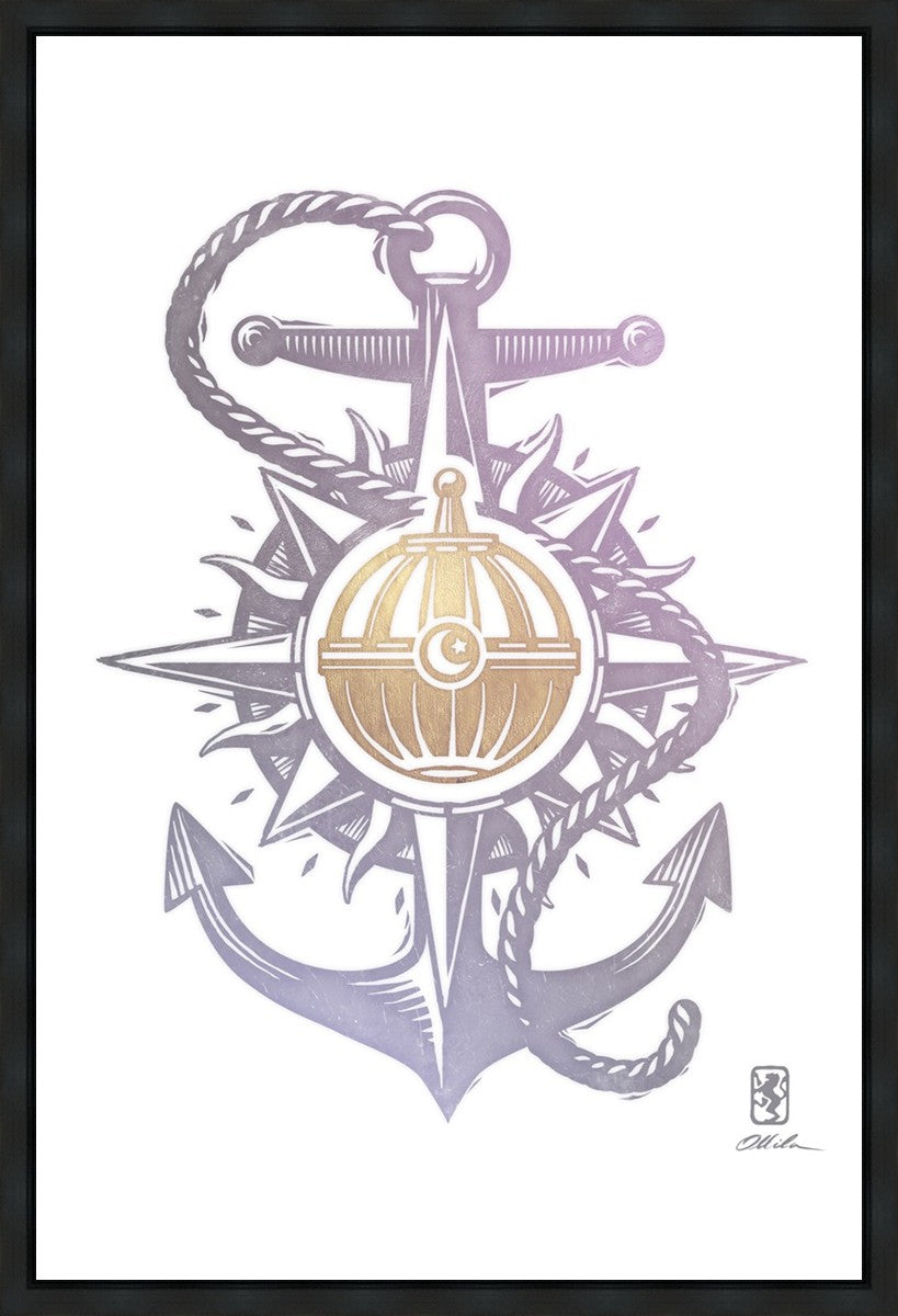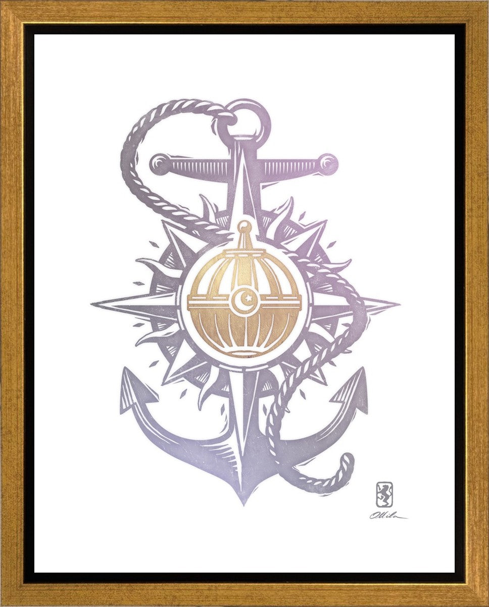 This piece is a hand carved woodcut relief print. The artist was inspired to create this piece by the story of Lehi's journey across the sea. The Liahona represents the word of Christ, which can act as a compass to guide us, and an anchor to which we may hold.