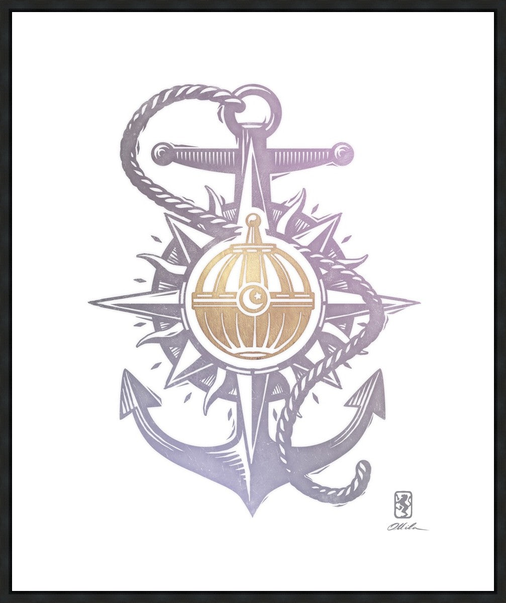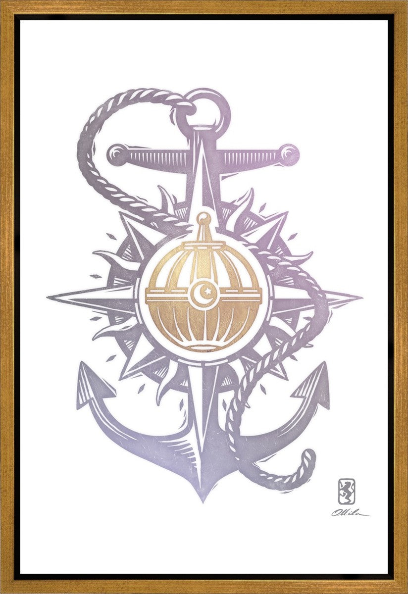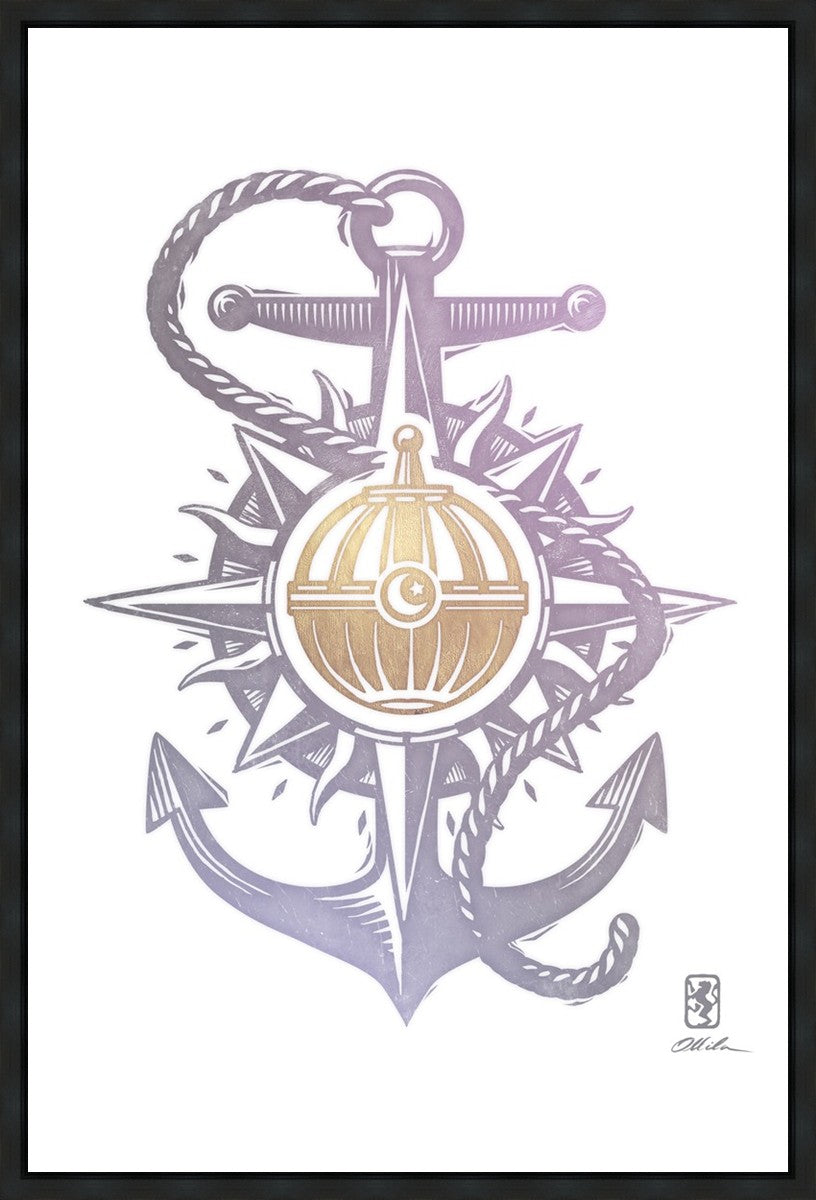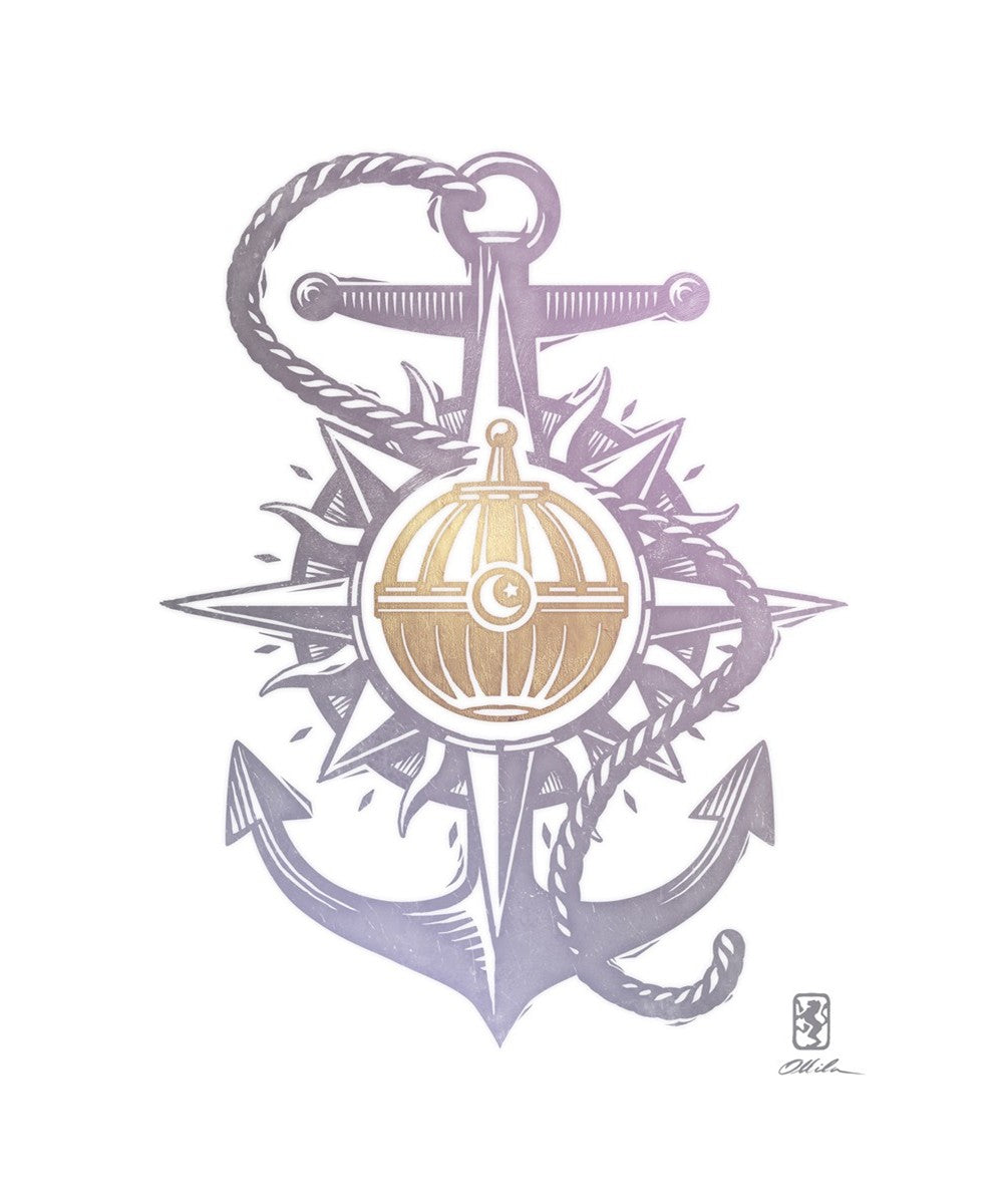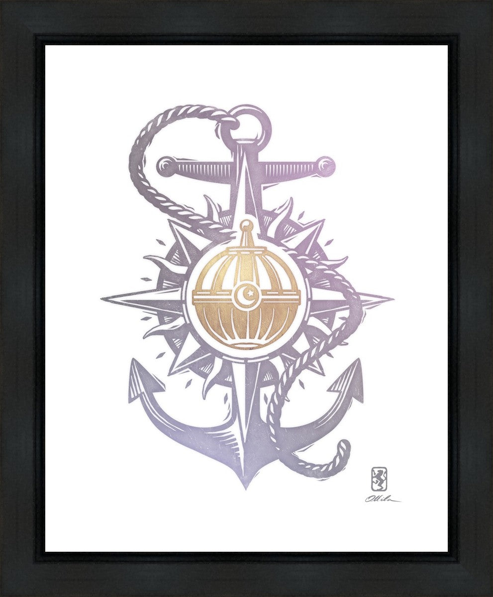 This piece is a hand carved woodcut relief print. The artist was inspired to create this piece by the story of Lehi's journey across the sea. The Liahona represents the word of Christ, which can act as a compass to guide us, and an anchor to which we may hold.