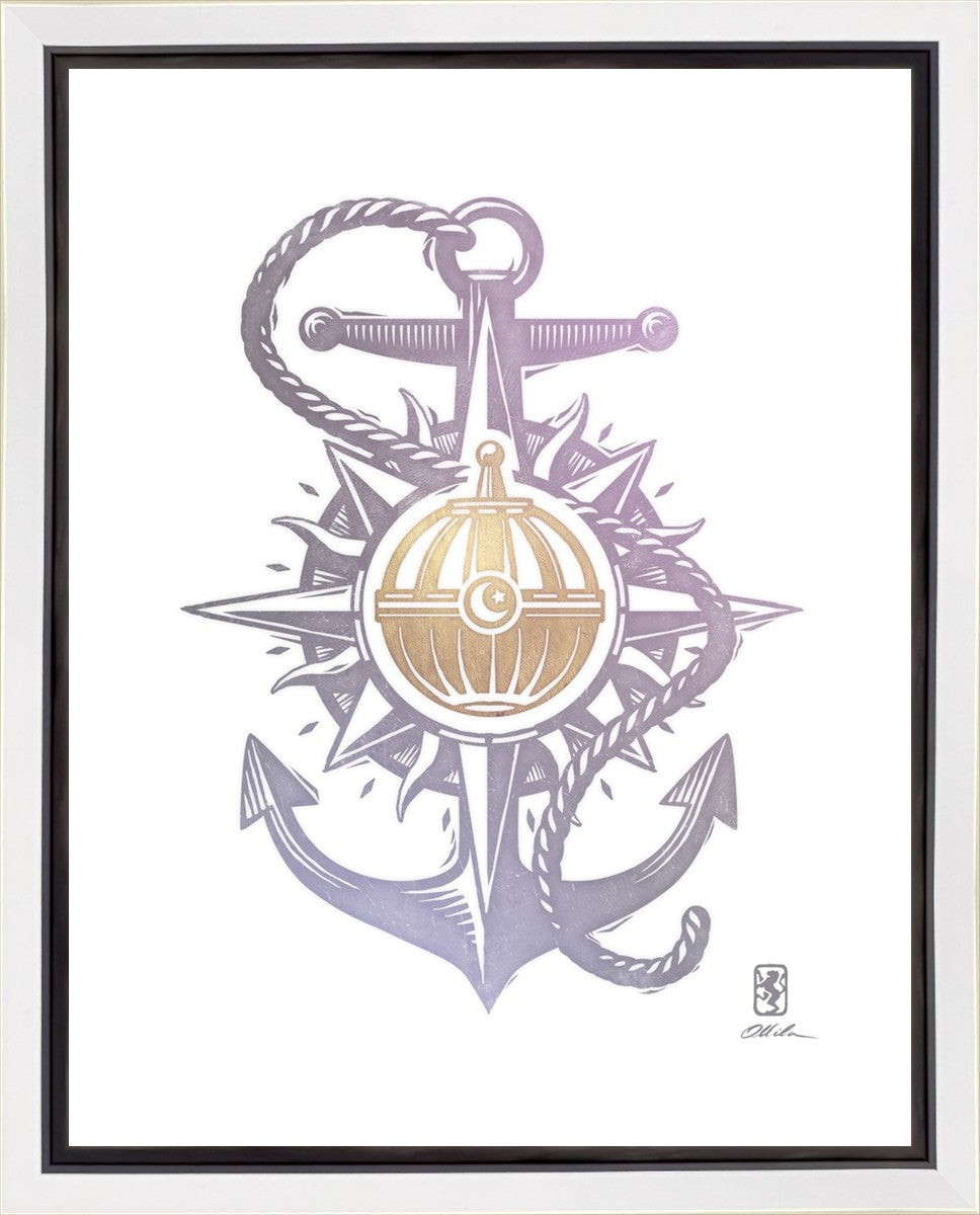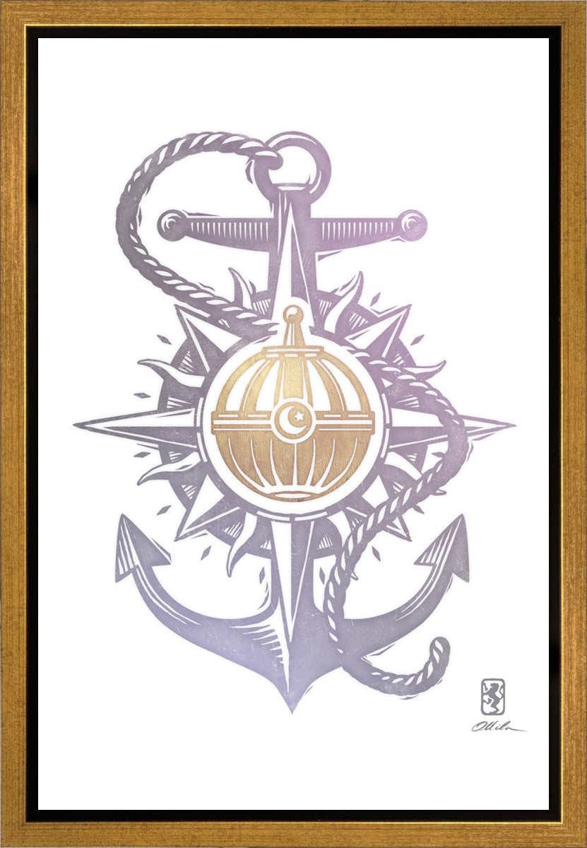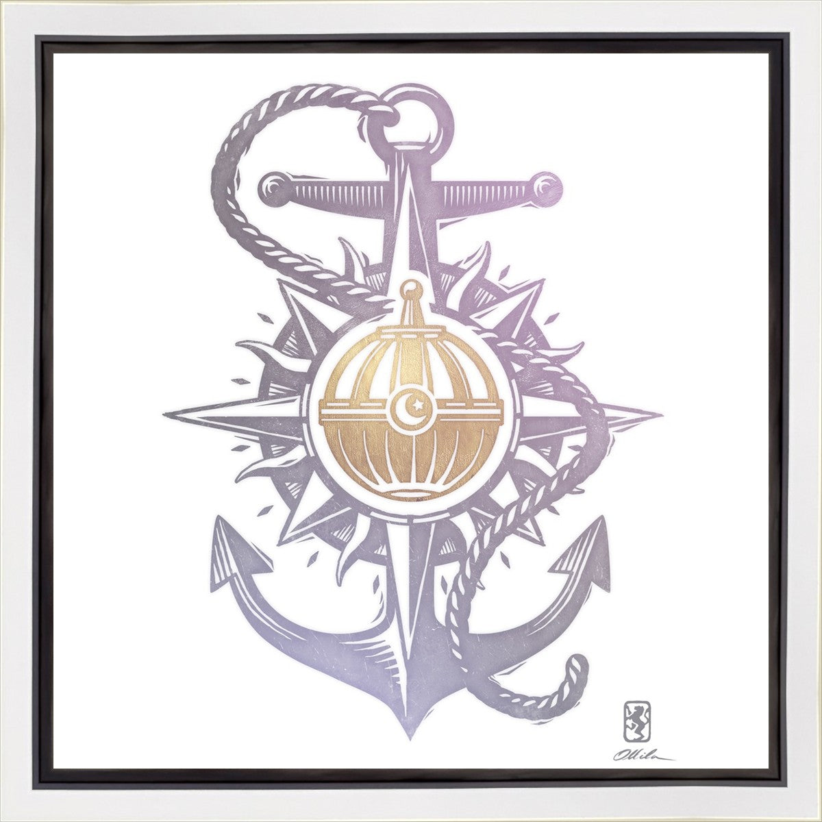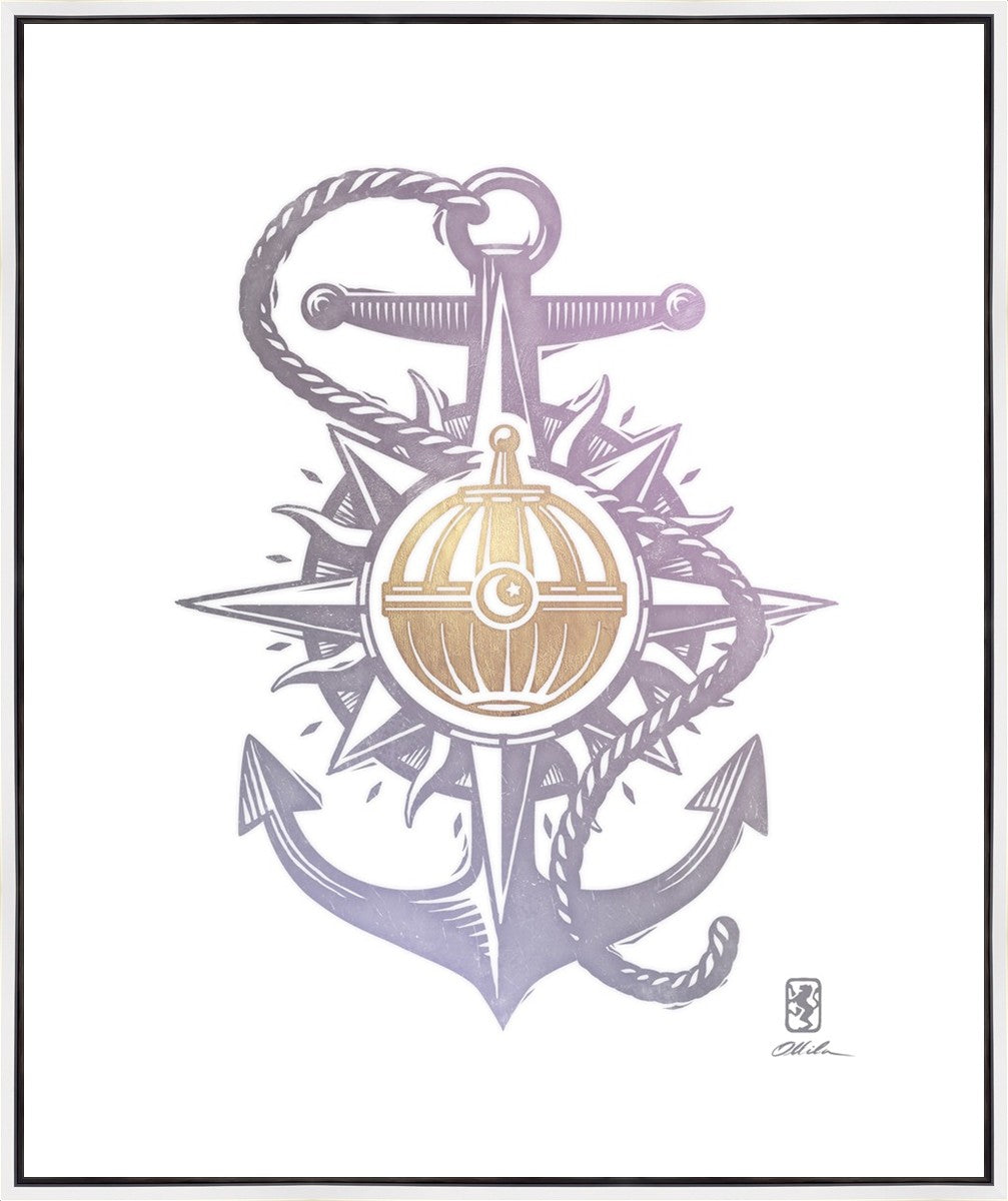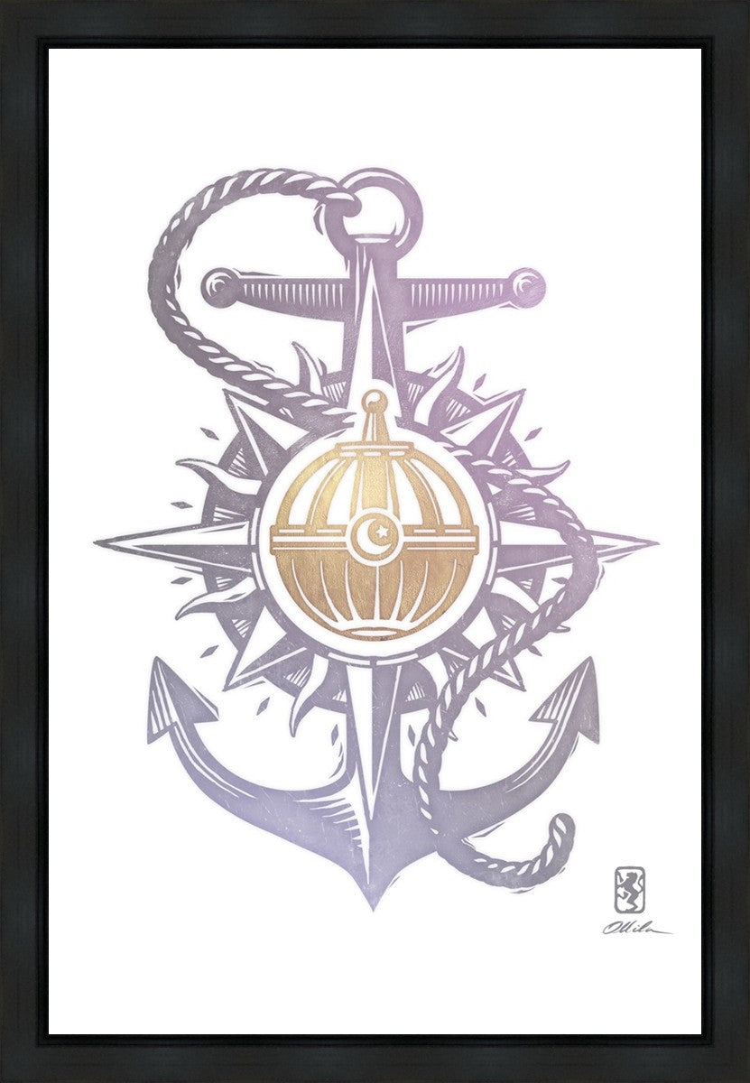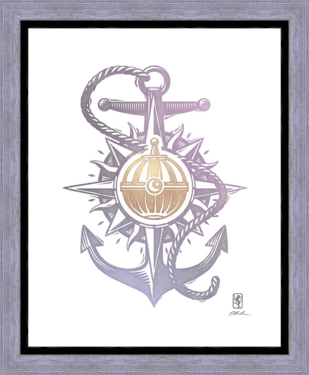 This piece is a hand carved woodcut relief print. The artist was inspired to create this piece by the story of Lehi's journey across the sea. The Liahona represents the word of Christ, which can act as a compass to guide us, and an anchor to which we may hold.