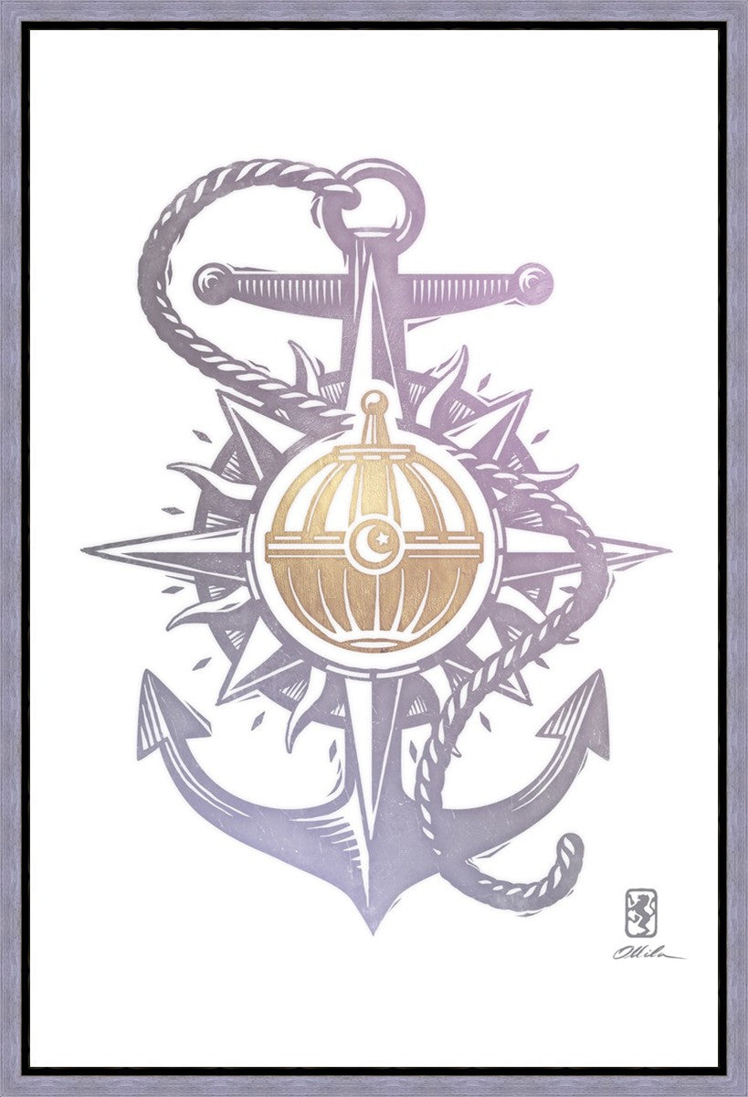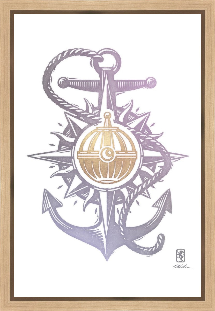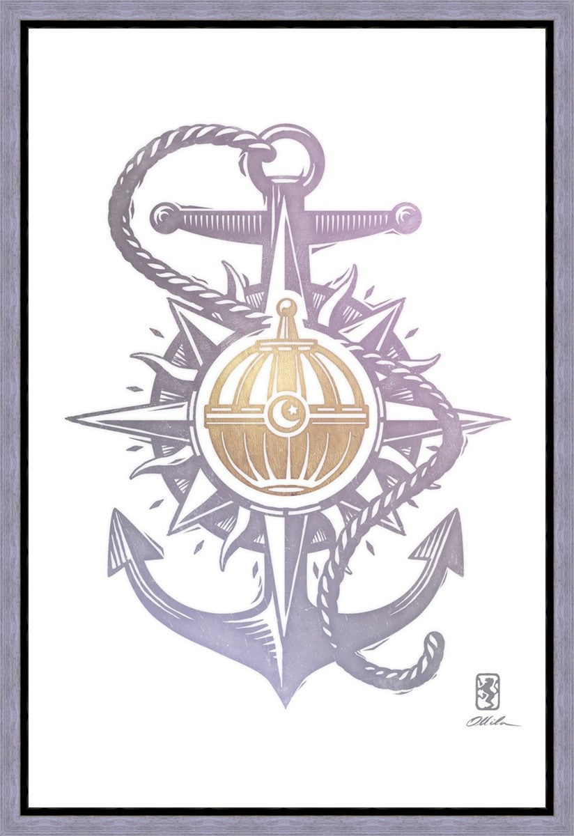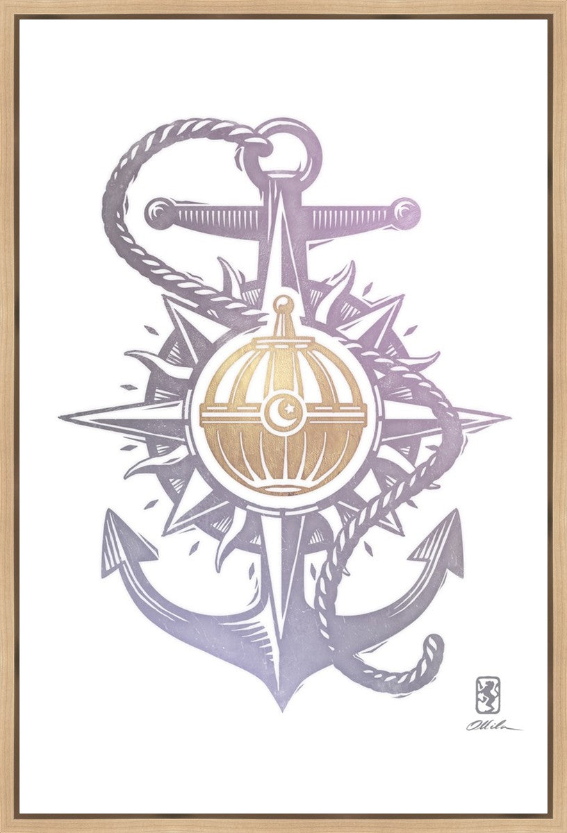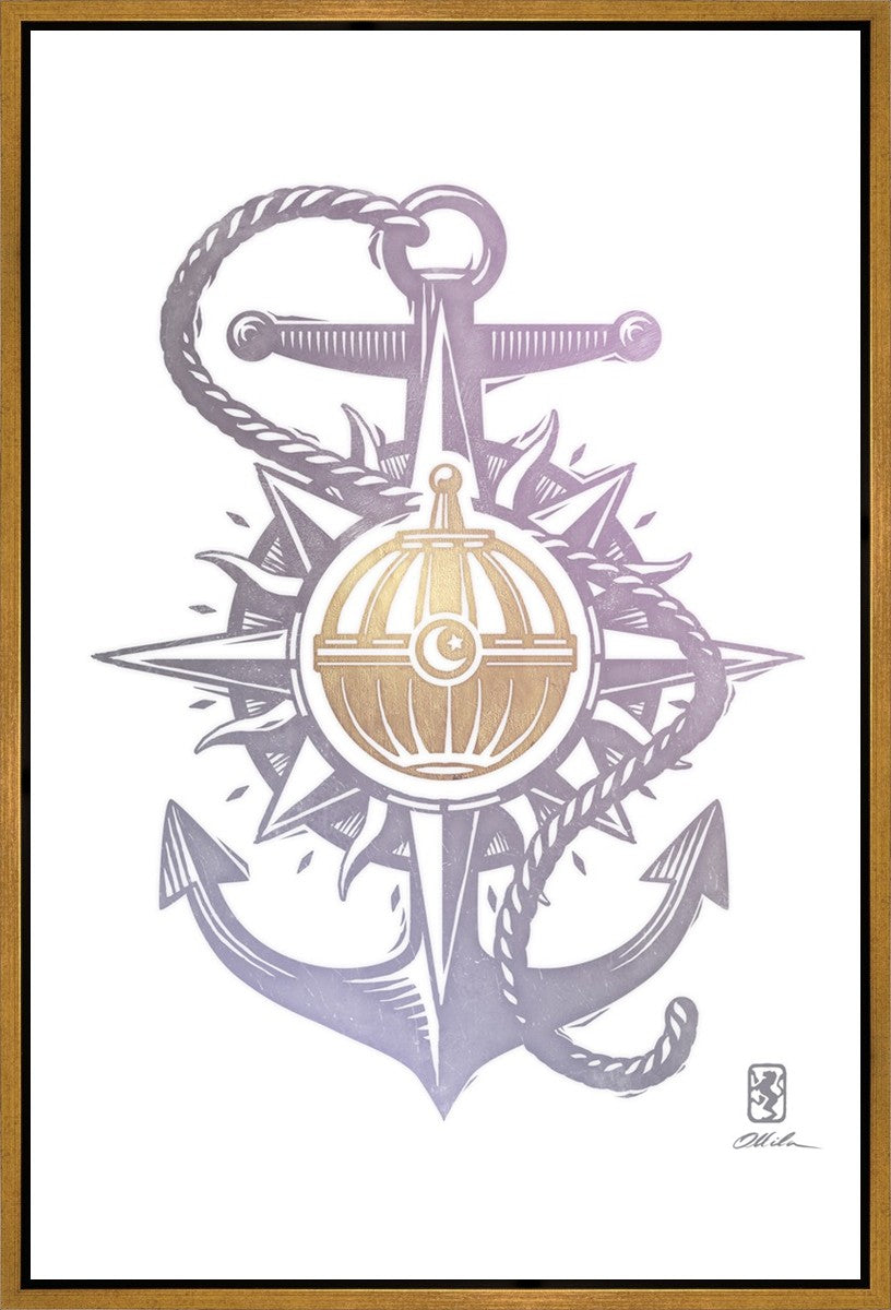 This piece is a hand carved woodcut relief print. The artist was inspired to create this piece by the story of Lehi's journey across the sea. The Liahona represents the word of Christ, which can act as a compass to guide us, and an anchor to which we may hold.