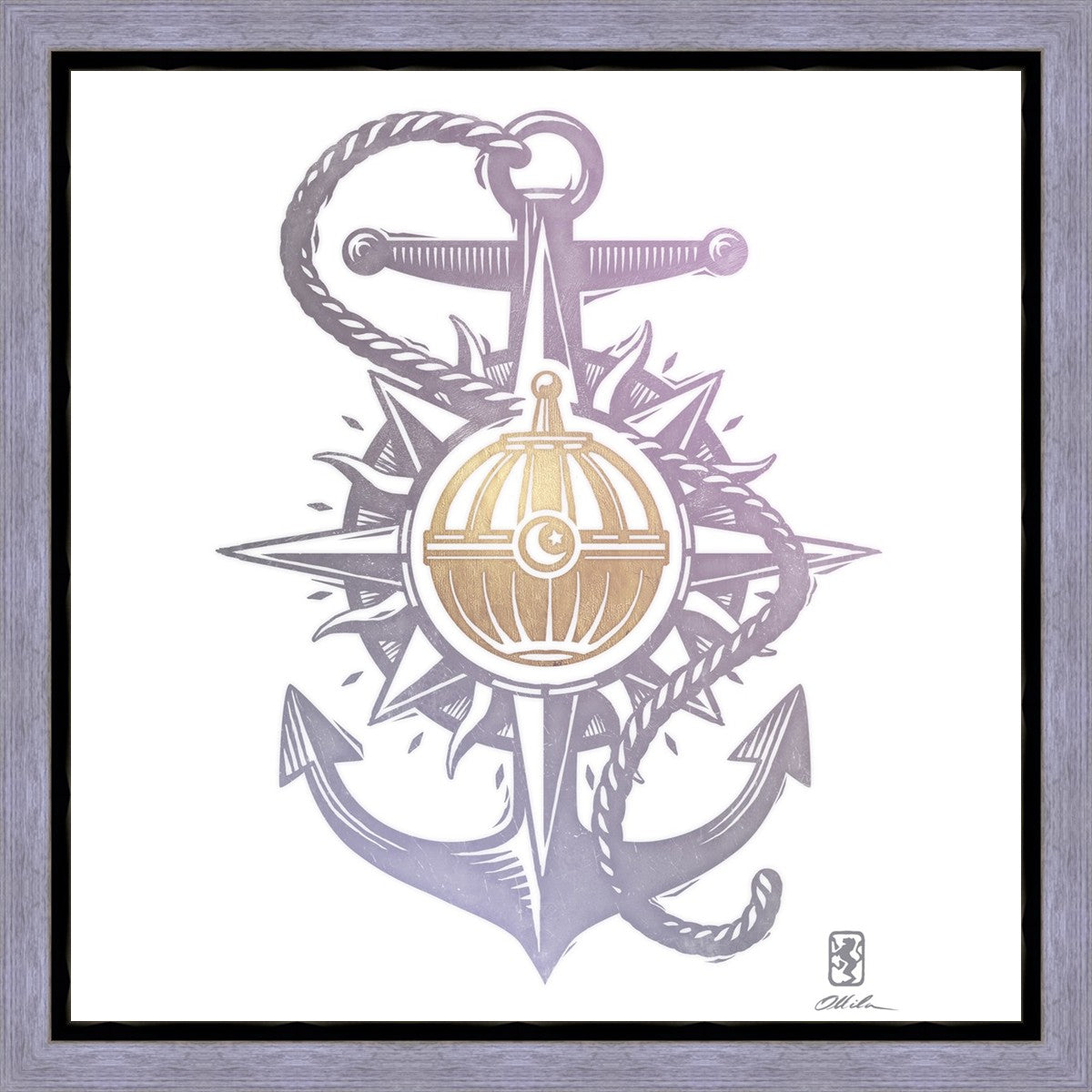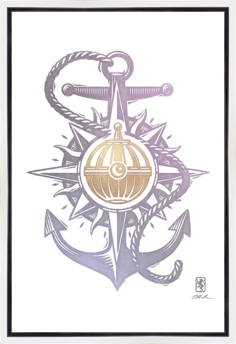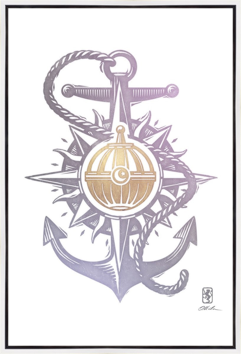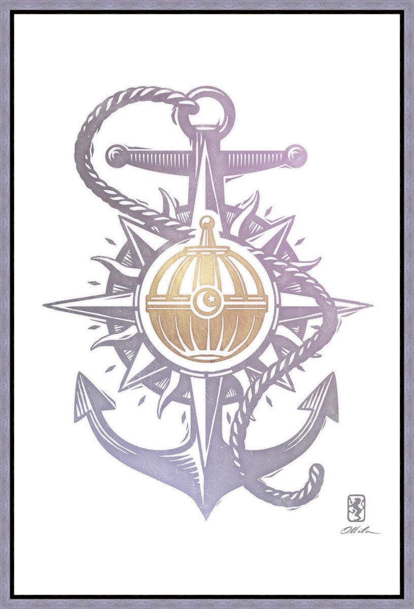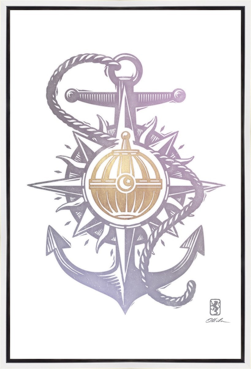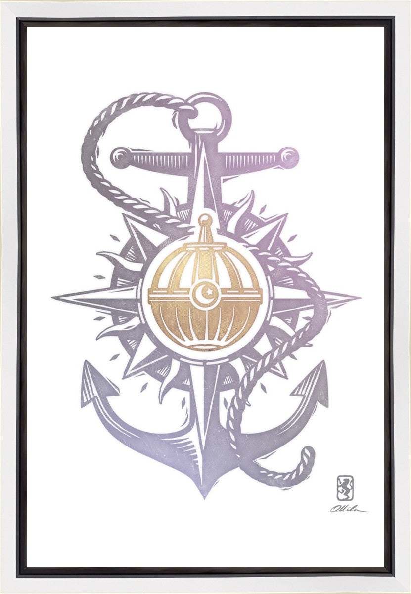 This piece is a hand carved woodcut relief print. The artist was inspired to create this piece by the story of Lehi's journey across the sea. The Liahona represents the word of Christ, which can act as a compass to guide us, and an anchor to which we may hold.