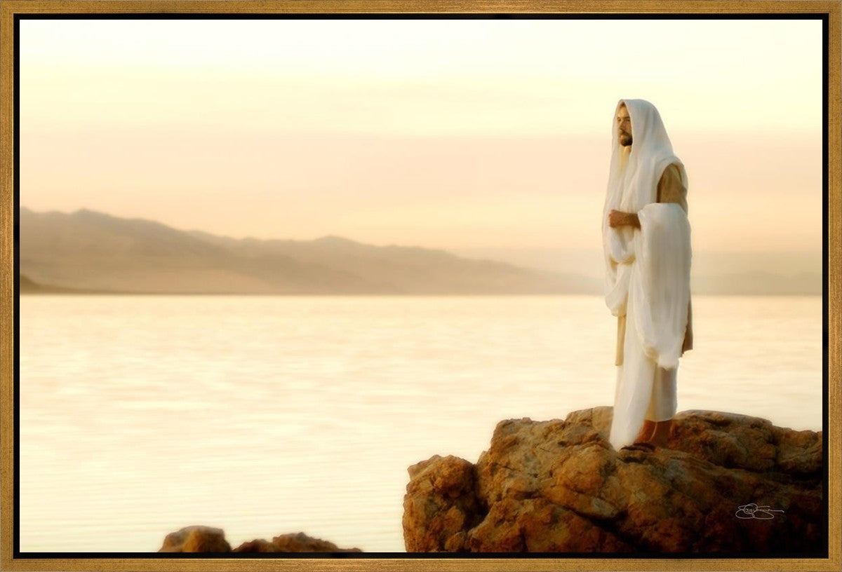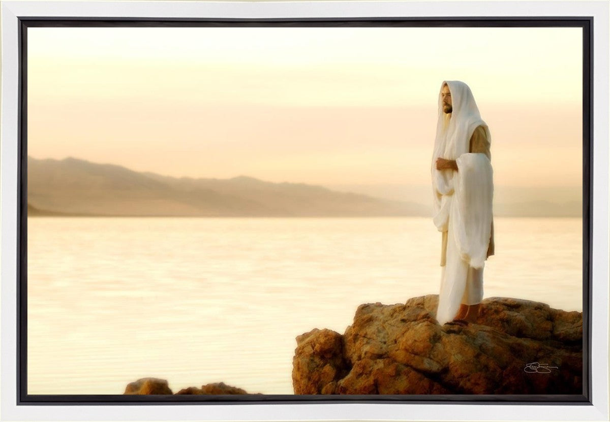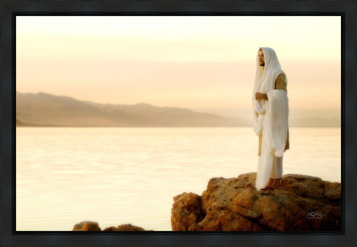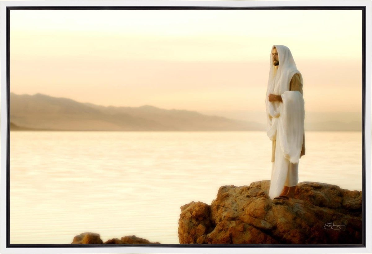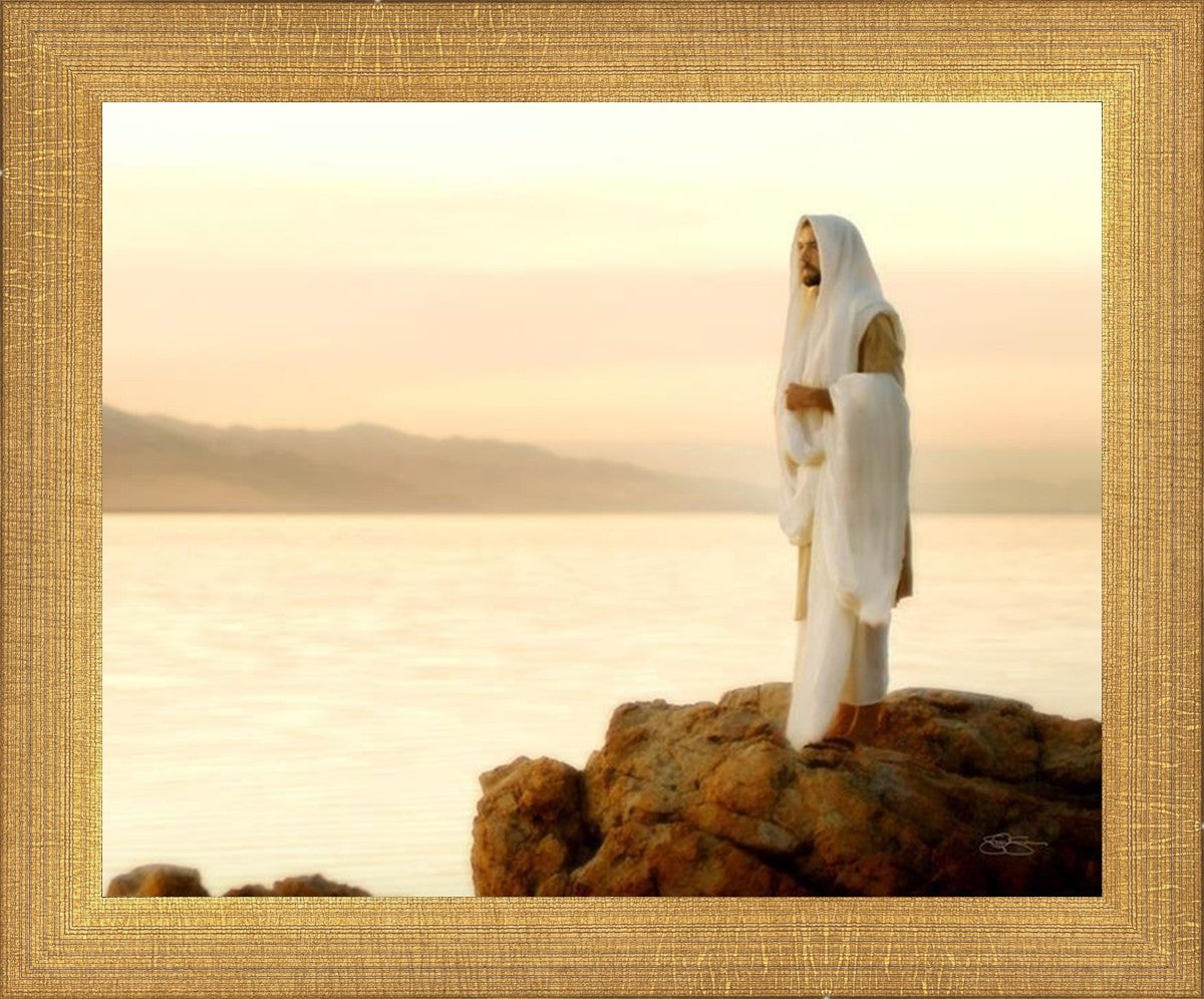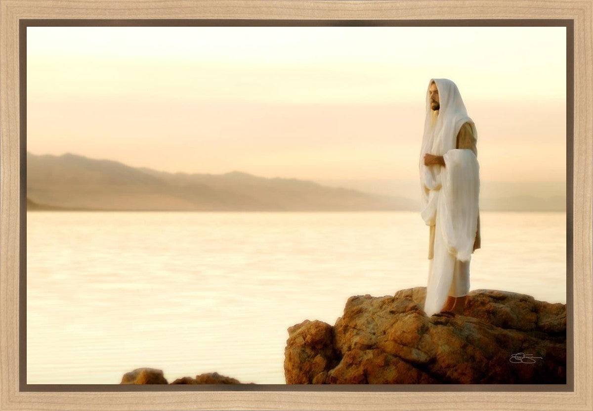 "Light of the World" by Scott Sumner depicts Jesus Christ the light of the world standing on shoreline rocks overlooking the Sea of Galilee.