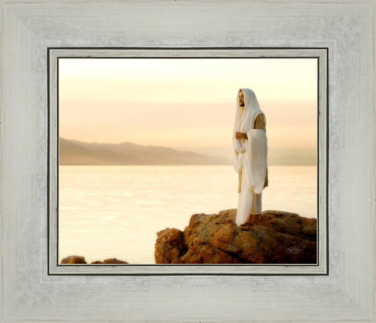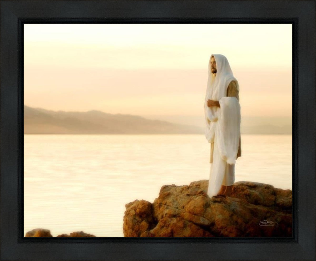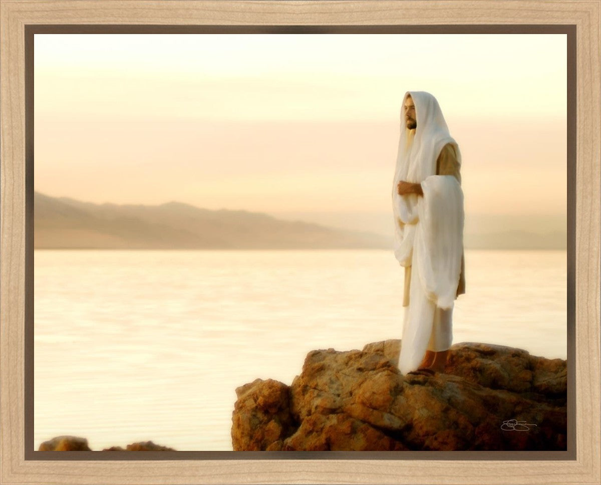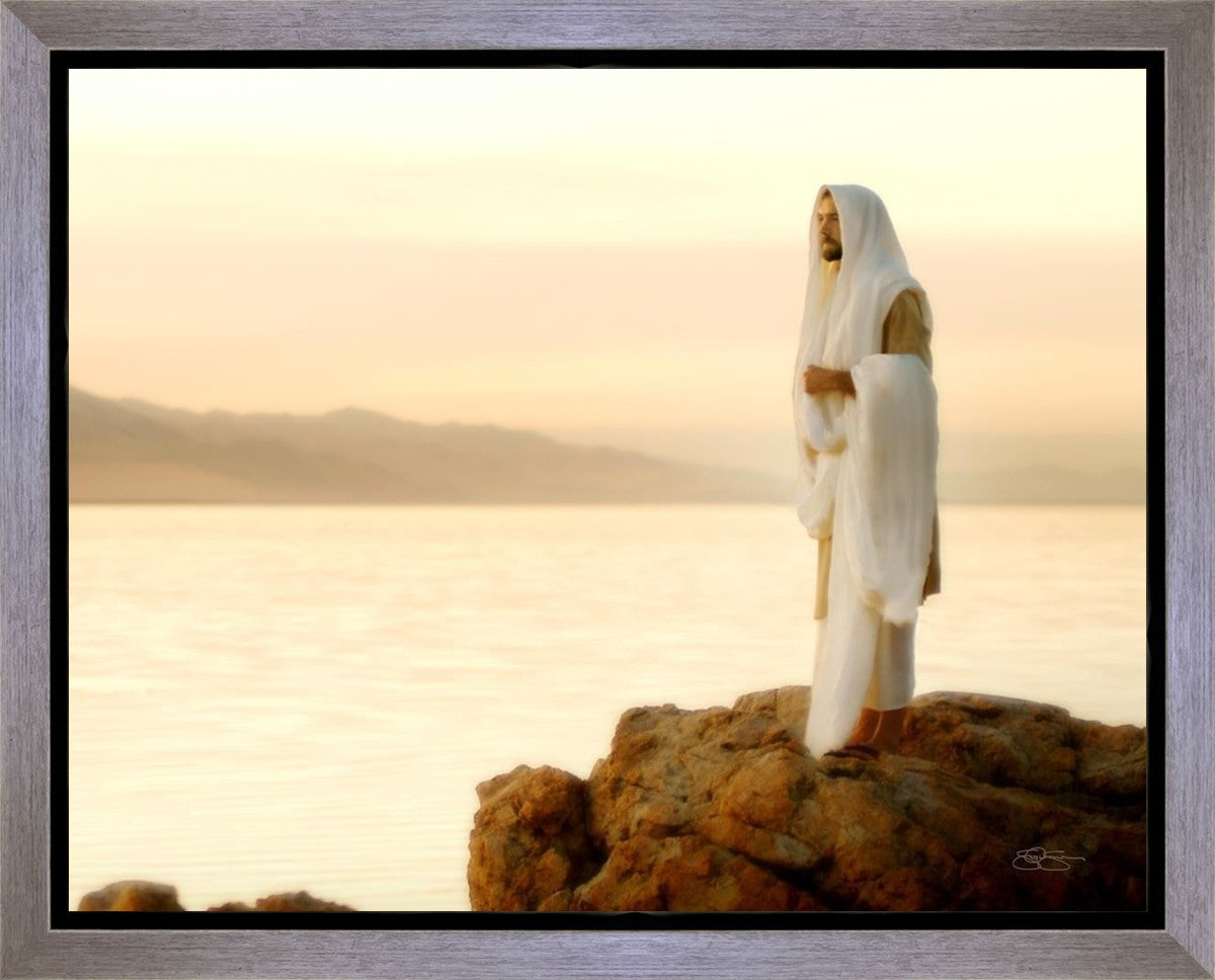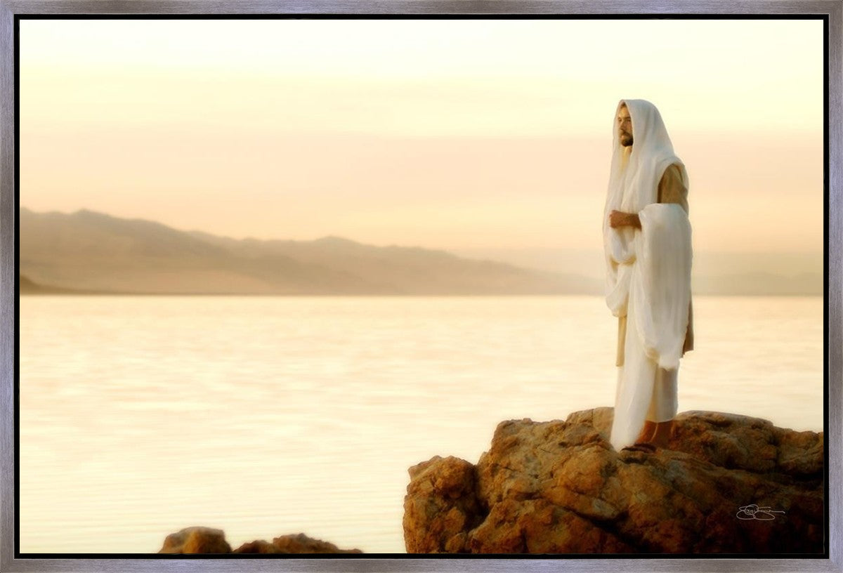 "Light of the World" by Scott Sumner depicts Jesus Christ the light of the world standing on shoreline rocks overlooking the Sea of Galilee.