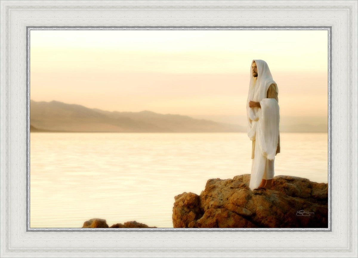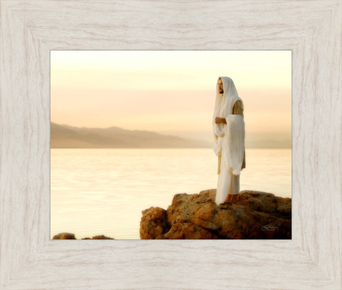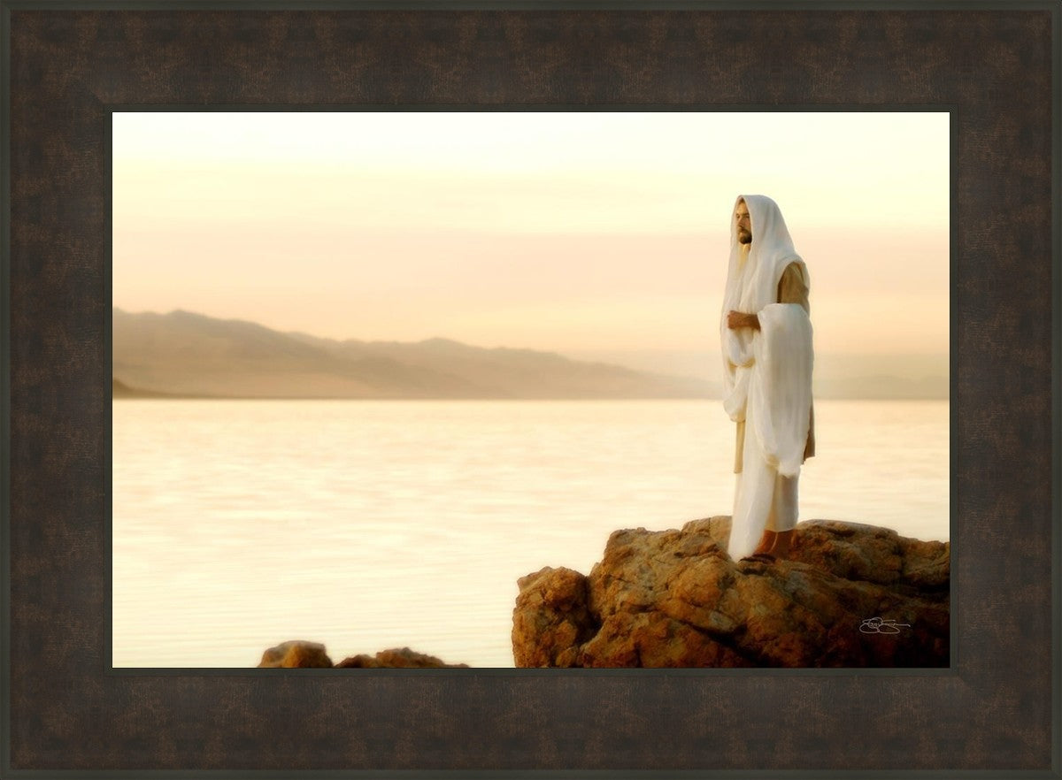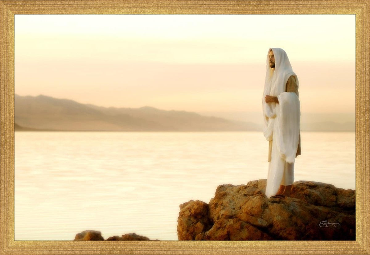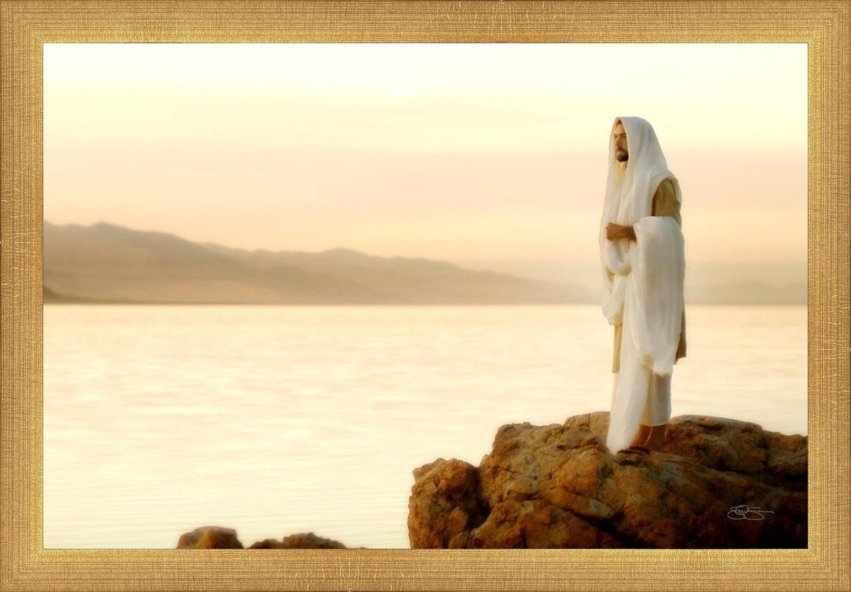 "Light of the World" by Scott Sumner depicts Jesus Christ the light of the world standing on shoreline rocks overlooking the Sea of Galilee.